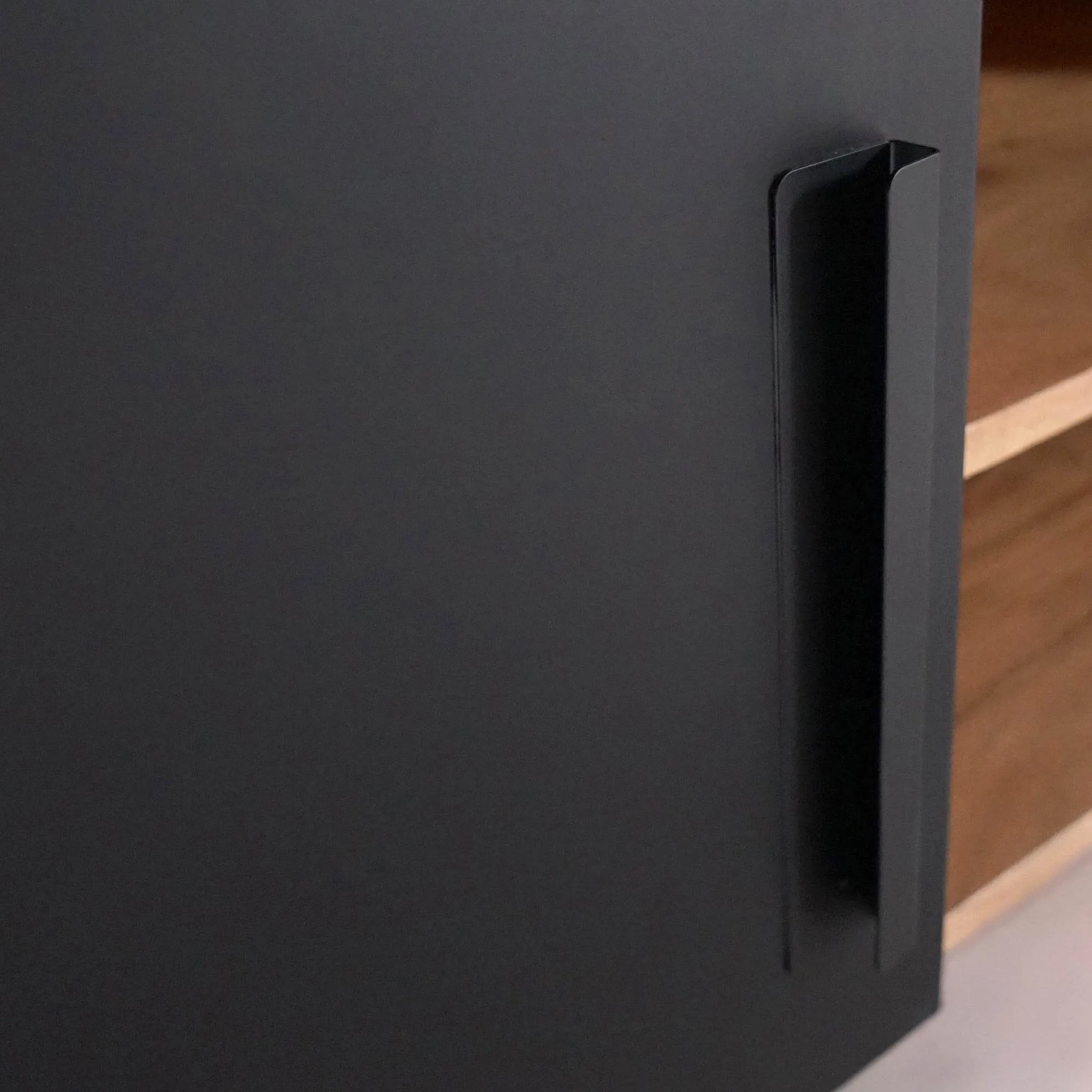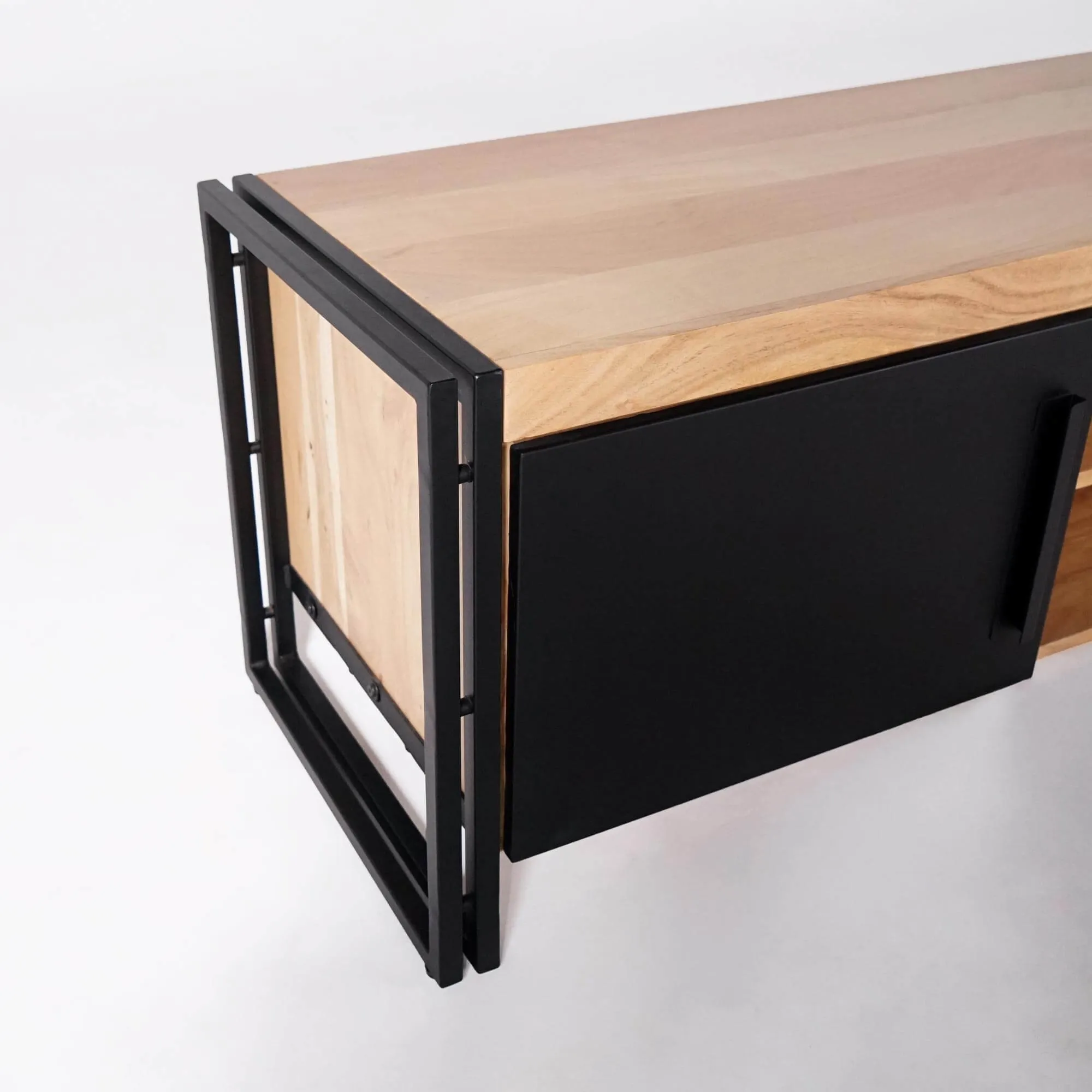 In het midden van dit tv-meubel in hout en metaal bieden twee open vakken een royale plaats voor je multimedia-apparatuur. Elk vak is ongeveer 51 cm breed, met een bruikbare hoogte van circa 15 cm per niveau — ideaal voor een speler, console of tv-box. Discrete openingen achteraan vergemakkelijken de kabeldoorvoer en behouden een verzorgde uitstraling. Aan weerszijden verbergen de twee draaideuren compartimenten van ongeveer 50 cm breed en 41 cm diep, perfect om tijdschriften, controllers of accessoires netjes op te bergen. We besteedden bijzondere aandacht aan het gebruiksgemak van de deuren en de soepelheid van de scharnieren, zodat het meubel even prettig in gebruik is als om naar te kijken.