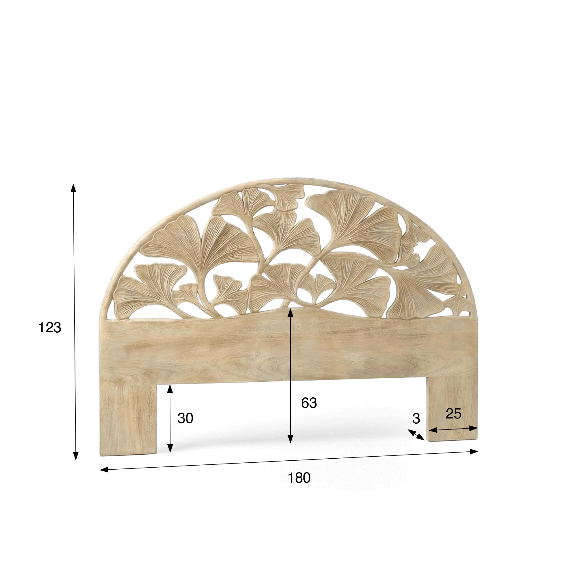 Met het hoofdbord van massief hout in gesculpteerd acaciahout van 180 cm, Valena, wilden wij de poëzie van plantaardige vormen vertalen naar een alledaags object, met een decor geïnspireerd op het bladmotief van de ginkgo, symbool van evenwicht en harmonie. Onze designers werkten een gebogen silhouet van 180 cm uit dat de lijn van het bed op natuurlijke wijze volgt, terwijl het opengewerkte motief het licht subtiel doorlaat en zo een verfijnd spel van schaduwen op de muur creëert. Deze compositie brengt een rustgevende aanwezigheid, ideaal om een zachte en ontspannen sfeer te scheppen in de slaapkamer.