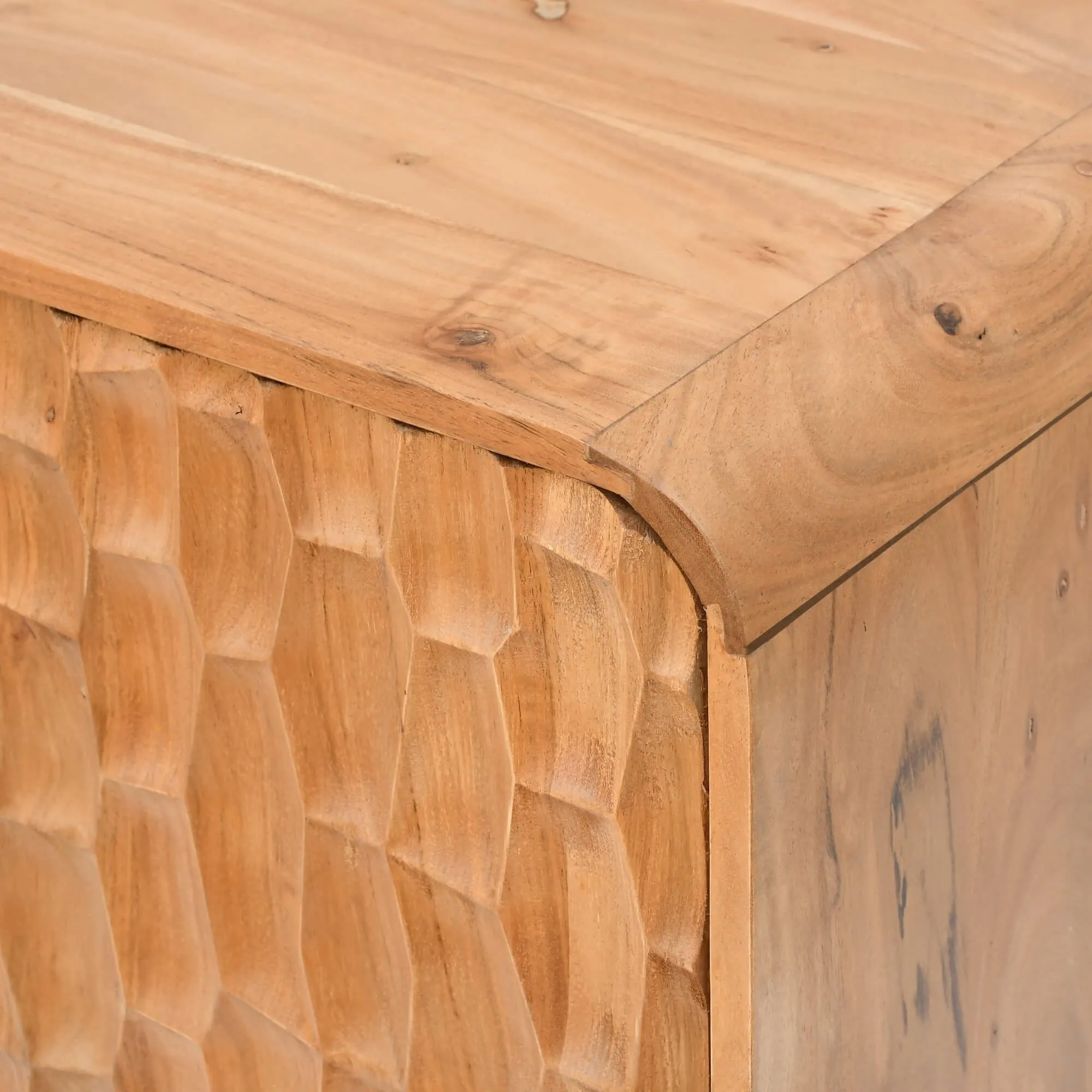 Vervaardigd uit massief acaciahout zet dit design dressoir in massief acaciahout een levendig materiaal in de kijker, rijk aan nuances en natuurlijke onregelmatigheden. Elke front werd geduldig met de hand vormgegeven om een reliëfwerking te verkrijgen die het licht vangt en het oppervlak tot leven brengt. Dit fijn getextureerde motief onthult de volle diepte van het hout en weerspiegelt de bijzondere aandacht die aan elke stap van het productieproces werd besteed. We wilden de authenticiteit van het materiaal bewaren, waarvan de warme tint zich moeiteloos laat integreren in een licht, strak of meer hedendaags interieur.