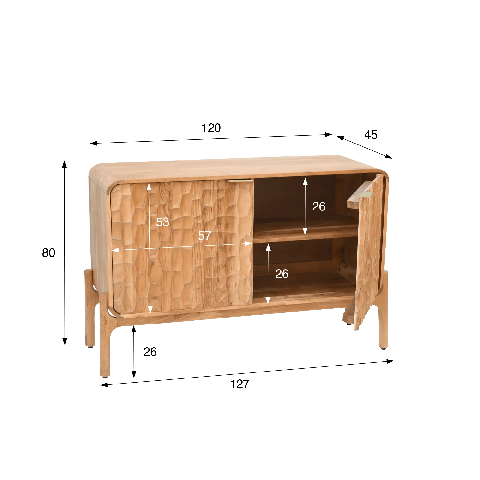 De twee deuren van dit design dressoir in massief acaciahout geven toegang tot een gestructureerde en functionele opbergruimte, ontworpen voor servies, huishoudlinnen of alledaagse voorwerpen. De vakken van ongeveer 26 cm hoog maken het mogelijk om verschillende formaten eenvoudig te organiseren, terwijl het geheel een sobere en evenwichtige uitstraling behoudt. Met zijn lengte van 120 cm vindt dit design dressoir in massief acaciahout vanzelf zijn plaats in een eetkamer, een woonkamer of een hal, en brengt het een warme toets zonder de ruimte te verzwaren.