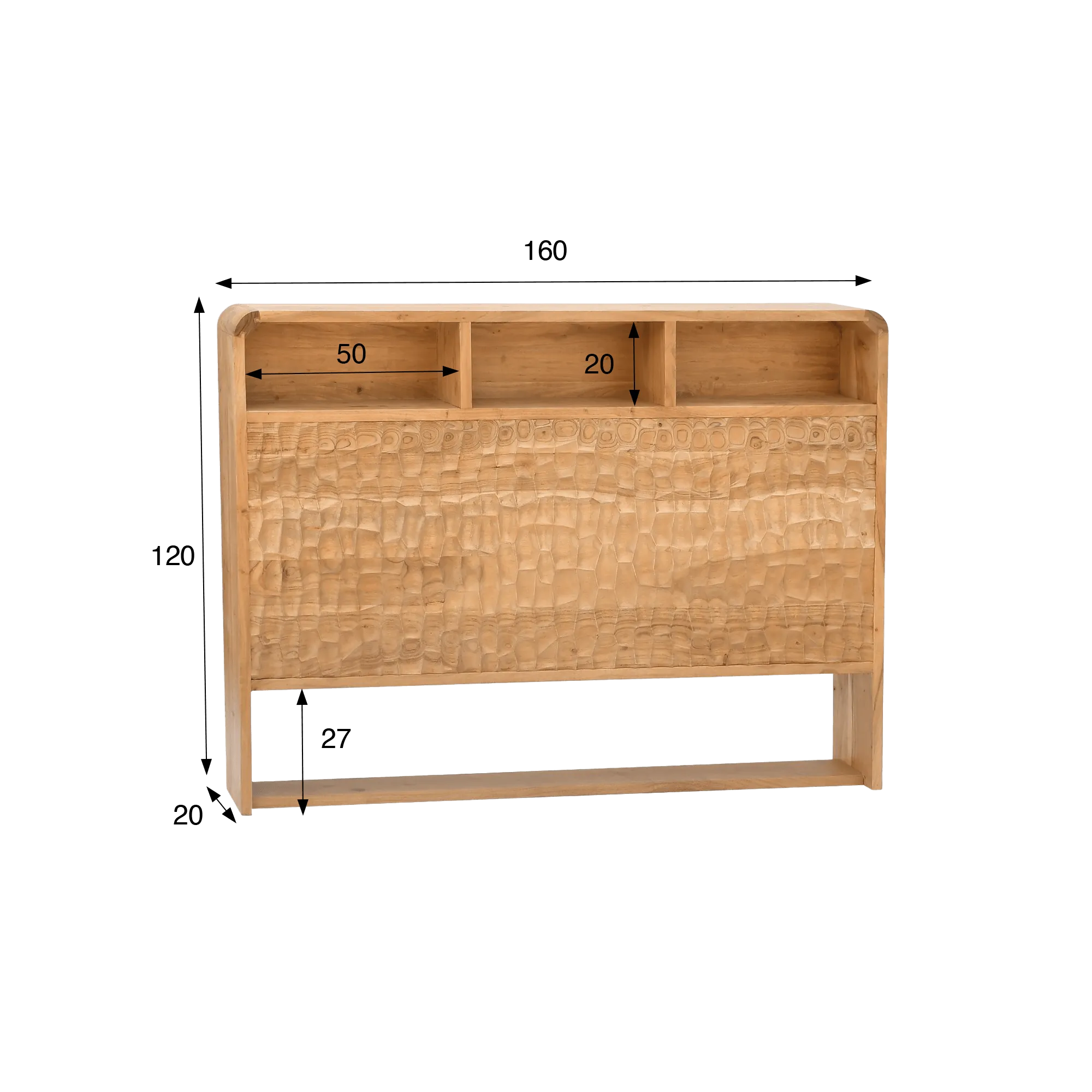 Het design hoofdbord in massief acaciahout Naoki is ontworpen om het dagelijkse leven op een doordachte manier te begeleiden en beschikt over drie open compartimenten van ongeveer 50 cm breed en 20 cm hoog, perfect voor boeken, decoratieve objecten of onmisbare spullen voor de avond. Dankzij deze indeling blijft het essentiële binnen handbereik, terwijl de sfeer tegelijk strak en rustgevend blijft. Met zijn breedte van 160 cm structureert dit design hoofdbord in massief acaciahout de slaapruimte op natuurlijke wijze en past het moeiteloos in uiteenlopende interieurs, van heel minimalistisch tot meer omhullend.