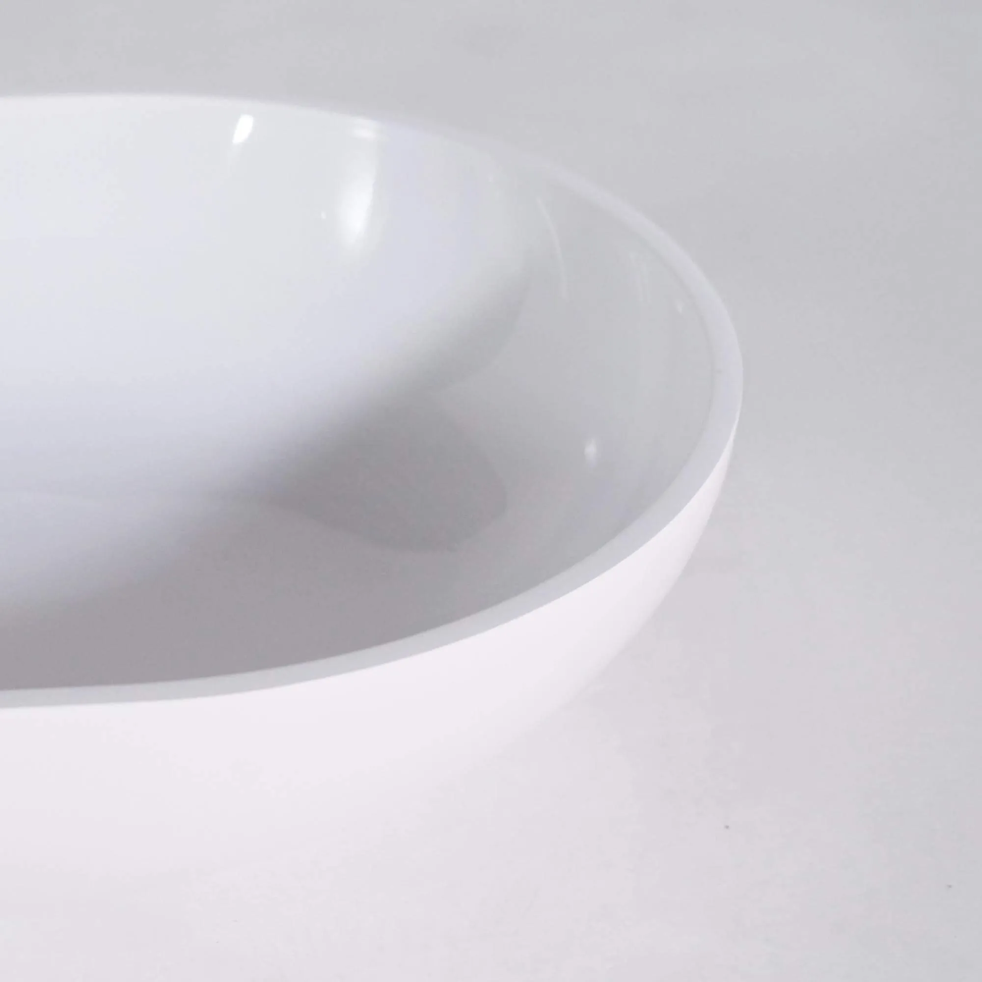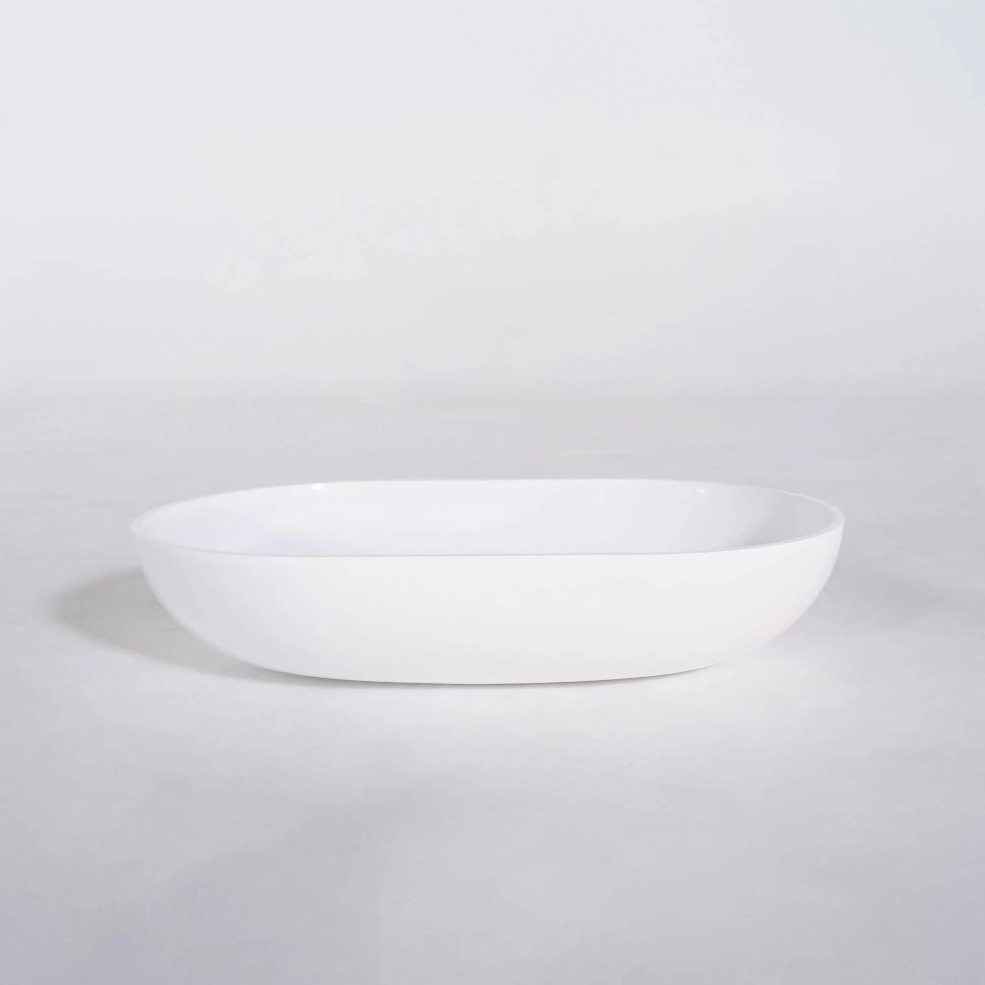 Onze ovale opzetwastafel in glanzend wit keramiek Slender komt perfect tot haar recht in combinatie met onze onderwastafelmeubels, waarmee ze een coherent en harmonieus geheel vormt, ontworpen om duurzaam te zijn en trends met rust te overstijgen.