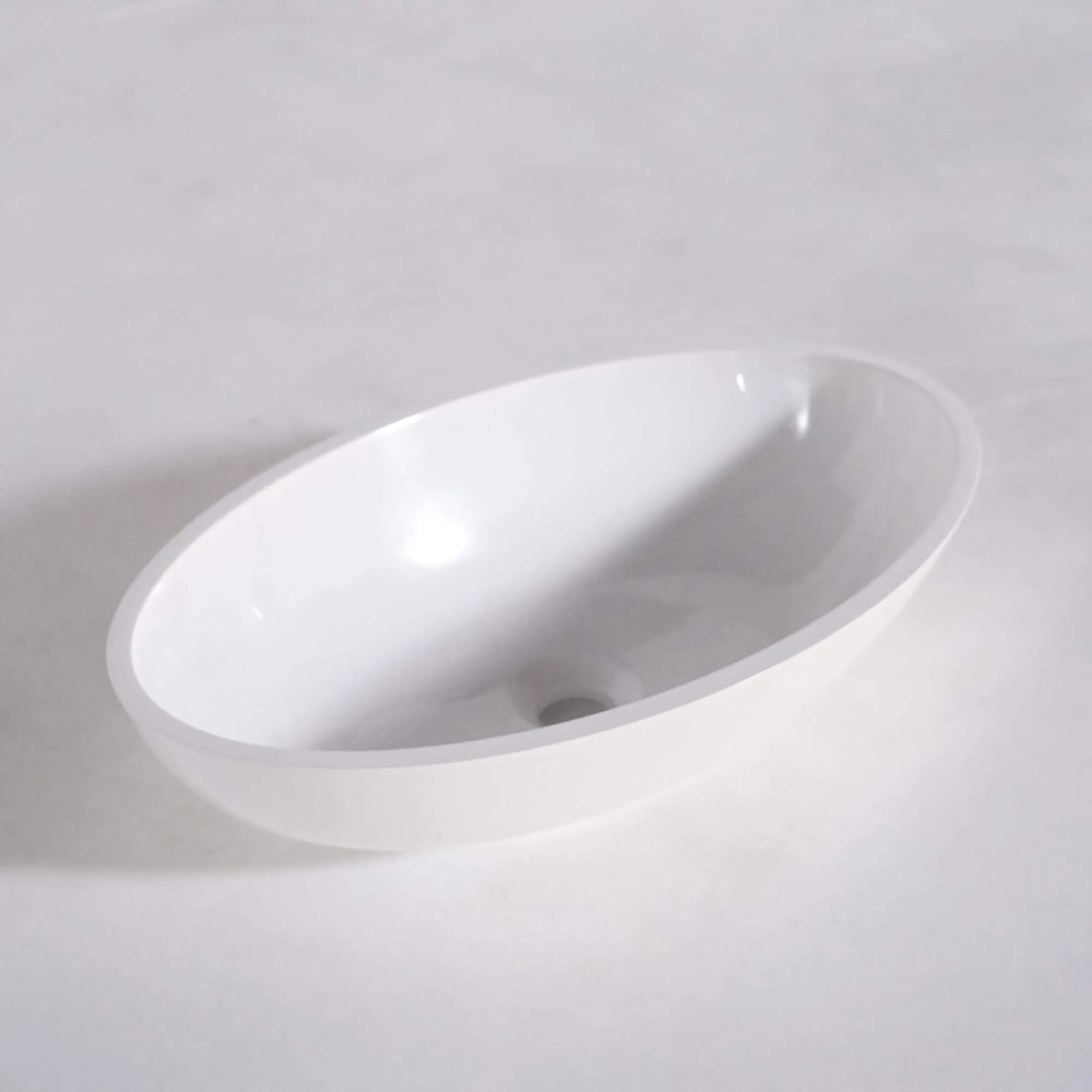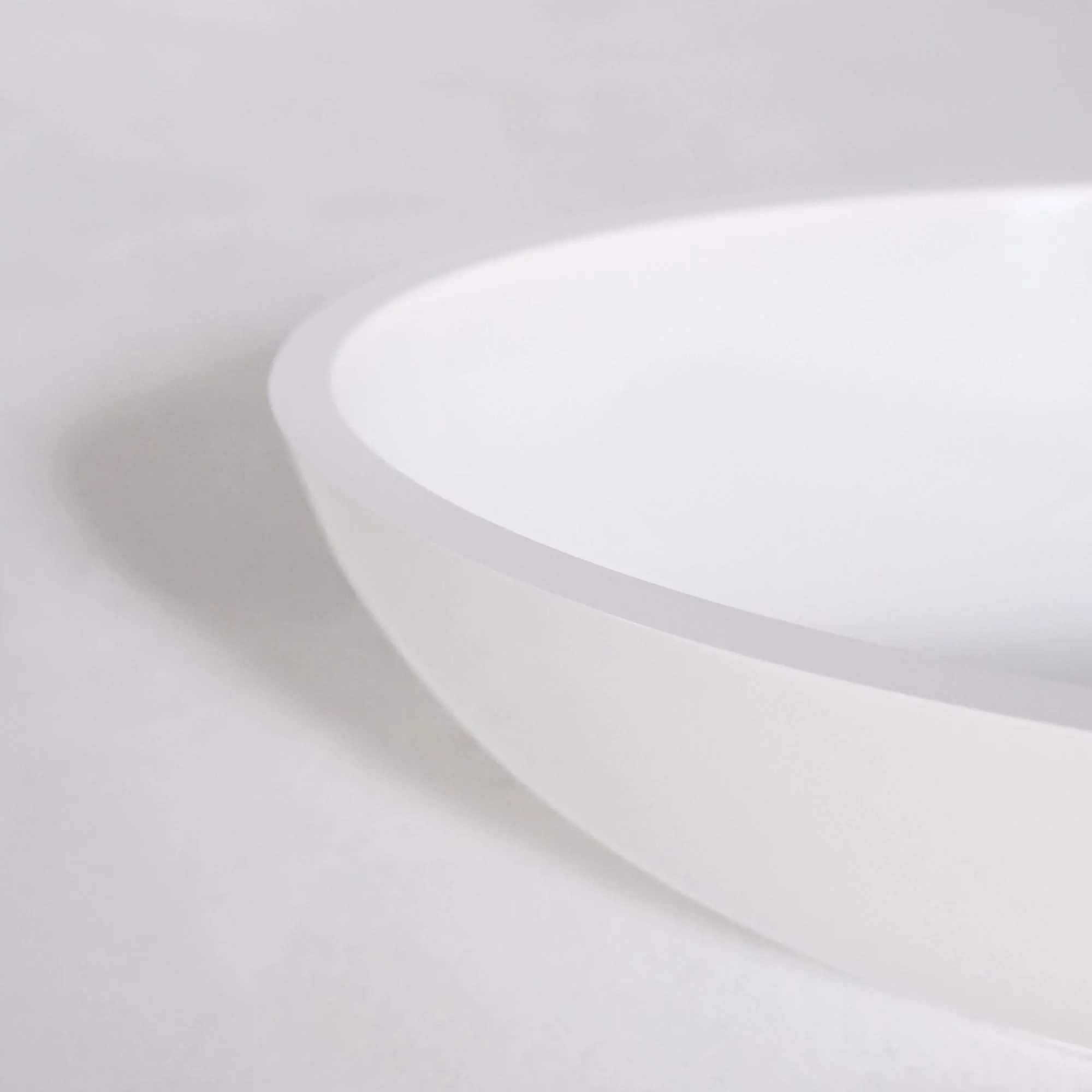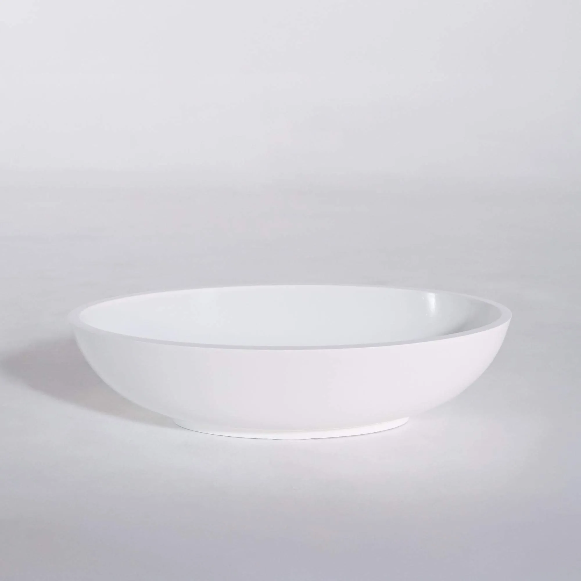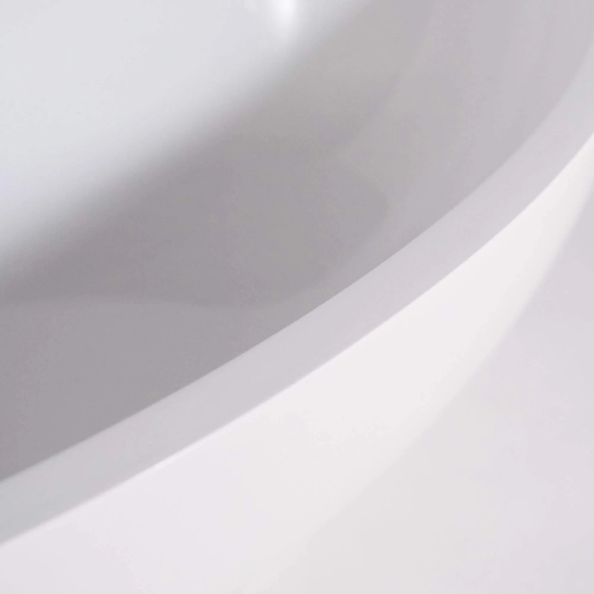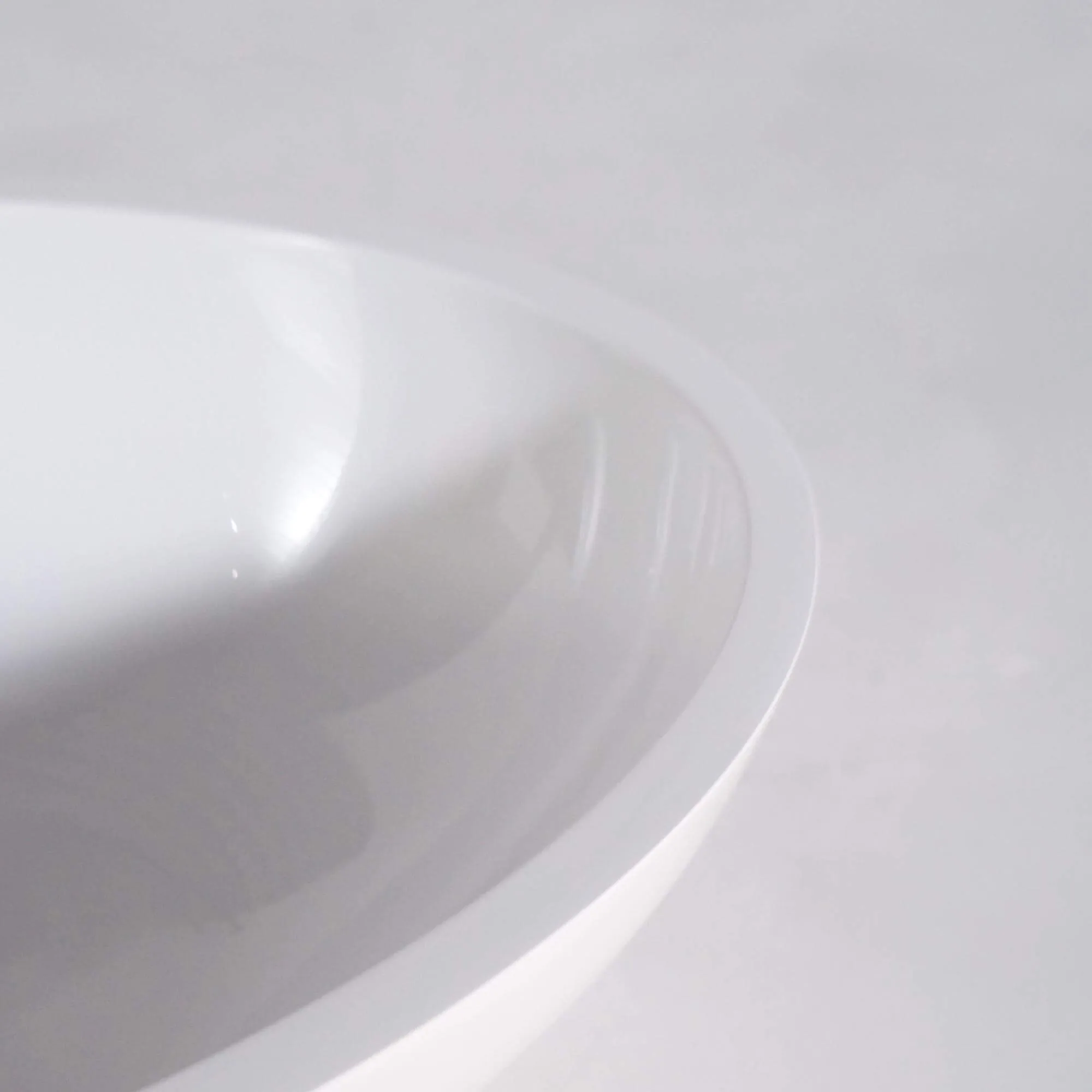 De glanzend witte keramiek werd gekozen omwille van haar duurzaamheid en de kwaliteit van haar visuele uitstraling. Het gladde oppervlak vangt het licht, onthult zachte reflecties en behoudt een constante frisse uitstraling. Deze afwerking benadrukt de doorlopende lijnen van deze ovale keramische opbouw waskom in glanzend wit, zonder onderbrekingen of oneffenheden, en maakt het onderhoud dag na dag eenvoudiger. Elk stuk getuigt van zorgvuldig vakmanschap, waarbij de precisie van de randen en de gelijkmatigheid van het glazuur centraal staan.