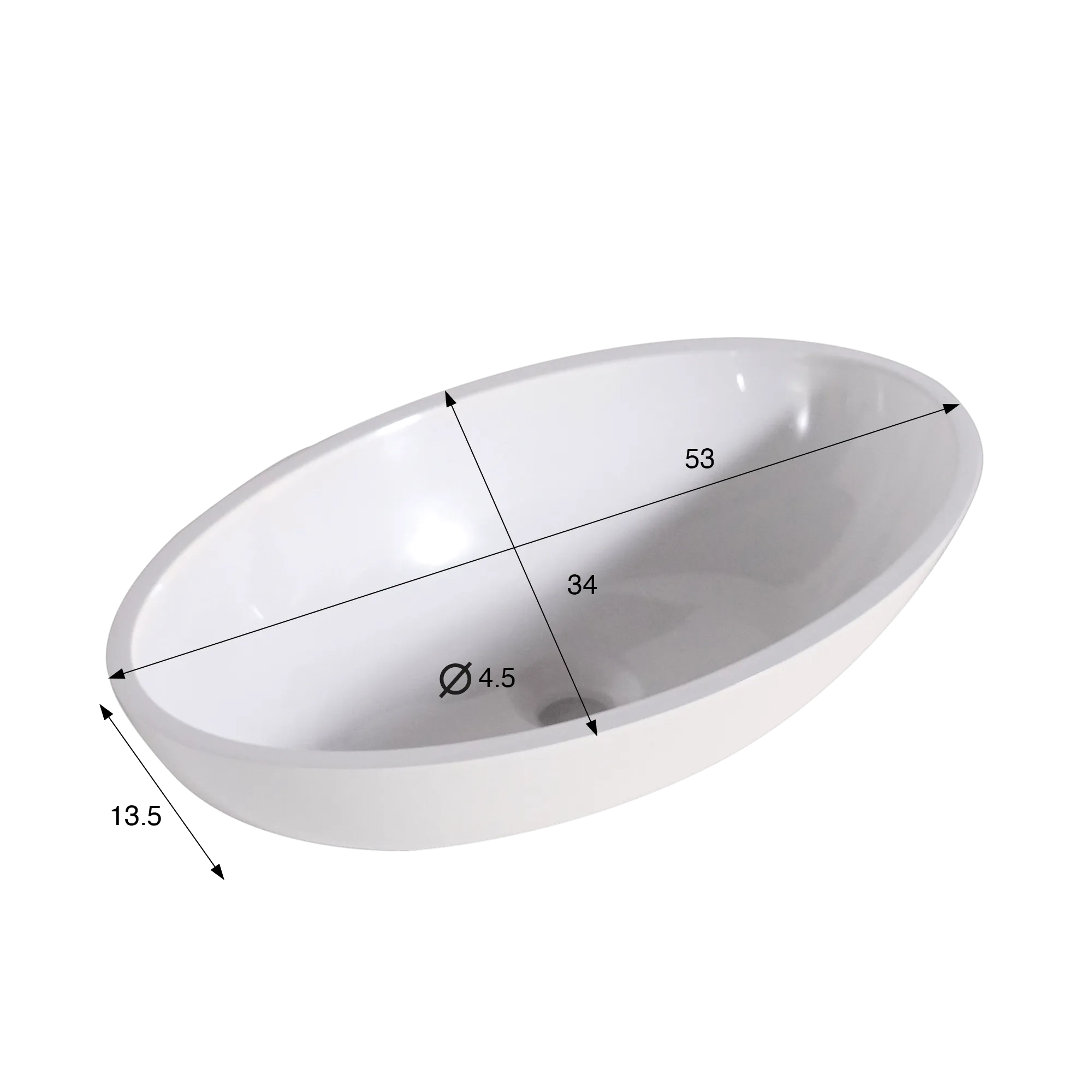 Haar ovale silhouet, met royale proporties, nodigt uit tot een vloeiende beweging. Met een lengte van ongeveer 53 cm en een breedte van 34 cm biedt deze ovale keramische opbouw waskom in glanzend wit een comfortabel oppervlak, terwijl de hoogte van 13,5 cm zorgt voor aangenaam dagelijks gebruik. Het subtiel uitgeholde binnenbekken begeleidt de waterafvoer naar een centrale afvoer van 4,5 cm diameter, ontworpen voor een eenvoudig en efficiënt gebruik.
