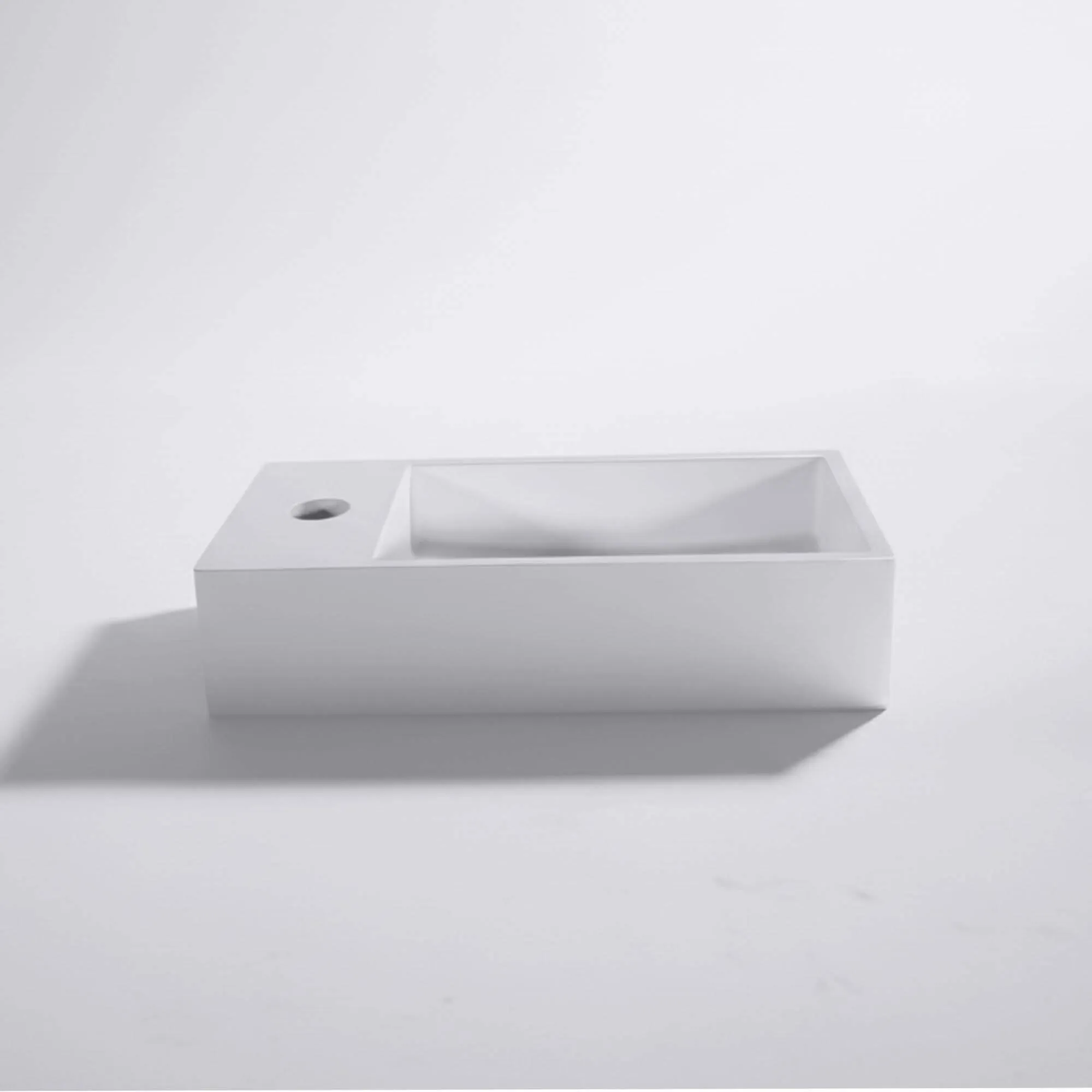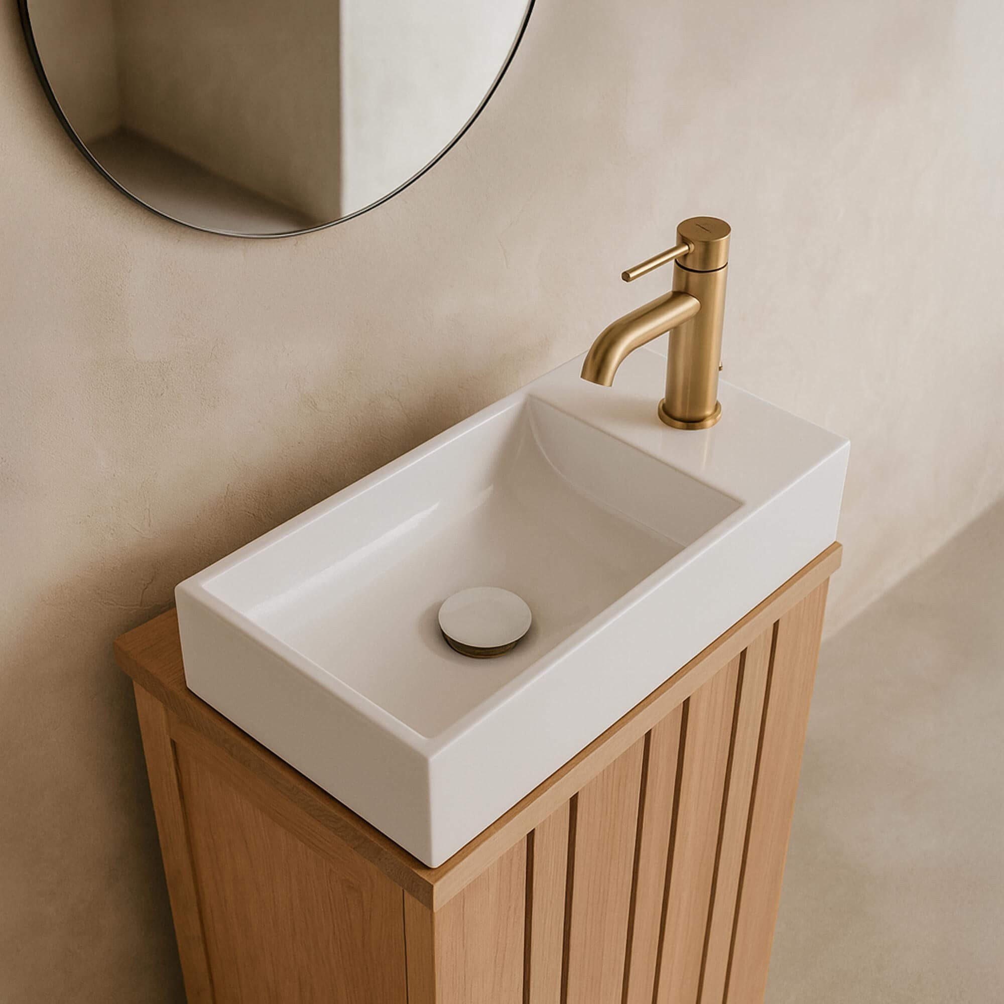 De opzetwastafel in glanzend wit keramiek, Klepsy, is ontstaan vanuit een eenvoudige wens: een compact, precies en expressief stuk aanbieden dat een ruimte structureert zonder deze ooit te verstarren. Onze designers kozen bewust voor een strakke rechthoekige vorm, verzacht door een subtiel uitgewerkt binnenbekken, om een evenwicht te creëren tussen grafische soberheid en gebruikscomfort.