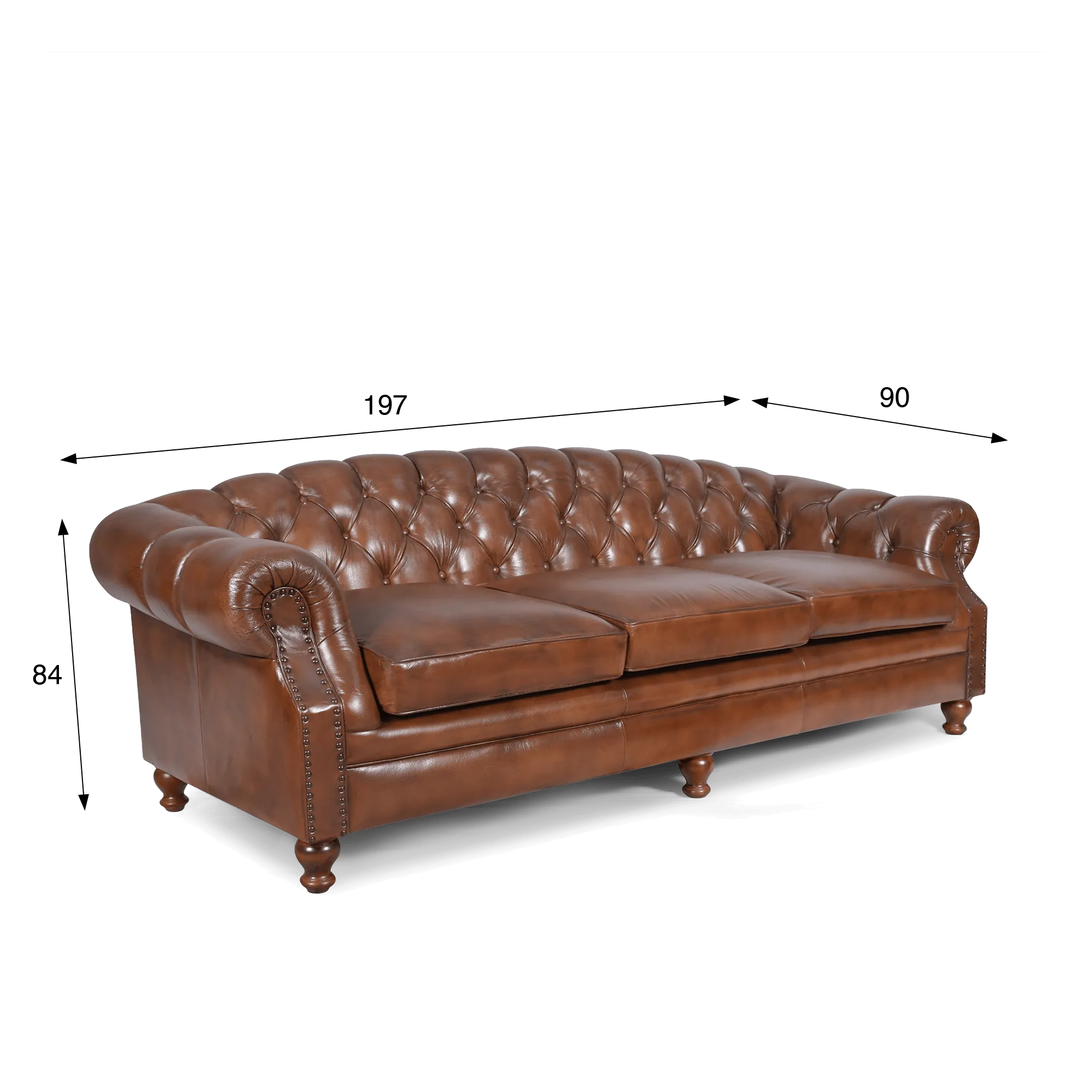 Deze 3-zits Chesterfield bank in echt bruin leer Harold is ontworpen om comfortabel plaats te bieden aan drie personen en biedt een zitbreedte van ongeveer 180 cm, opgebouwd uit drie dikke en comfortabele kussens die stevigheid en soepelheid combineren. De zitdiepte, ongeveer 60 cm, nodigt uit om langdurig plaats te nemen, zowel voor een moment van ontspanning als om gasten te ontvangen. De structuur van deze 3-zits Chesterfield bank in echt bruin leer rust op poten in mangohout, waarvan de warme tint mooi aansluit bij die van het leer en zo evenwicht en samenhang aan het geheel geeft. Ze zijn eenvoudig te bevestigen en zorgen voor een snelle en intuïtieve montage.