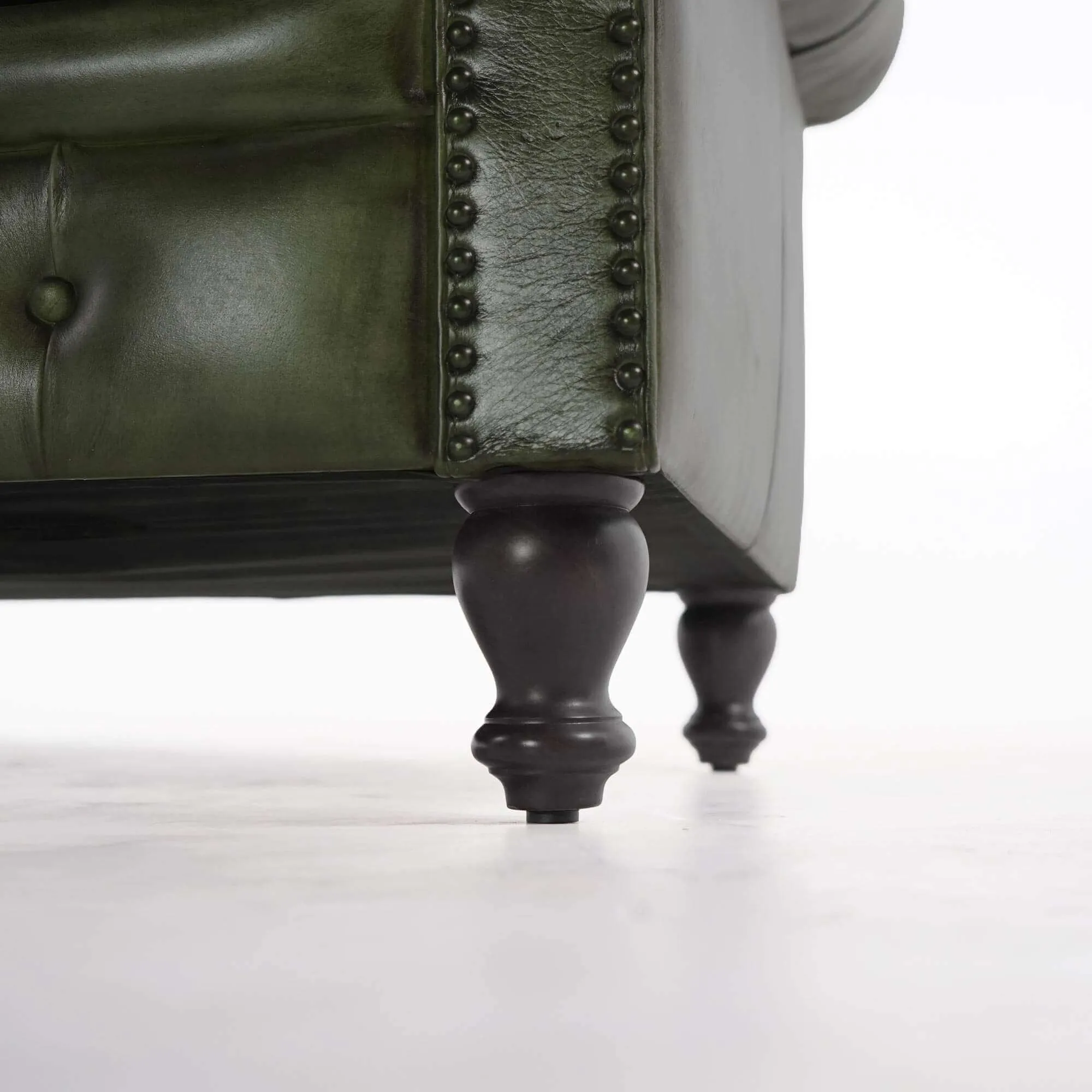 De details van deze groene Chesterfield zitbank in echt leer, 3-zits, bepalen volledig zijn identiteit: de siernagels tekenen een strakke lijn langs de armleuningen, terwijl de eenvoudig te bevestigen poten in massief mangohout zorgen voor een stevige basis en een warme toets toevoegen tegenover de diepe kleur van het leer. Het geheel rust op een robuuste structuur, ontworpen om het dagelijkse gebruik langdurig te begeleiden.
