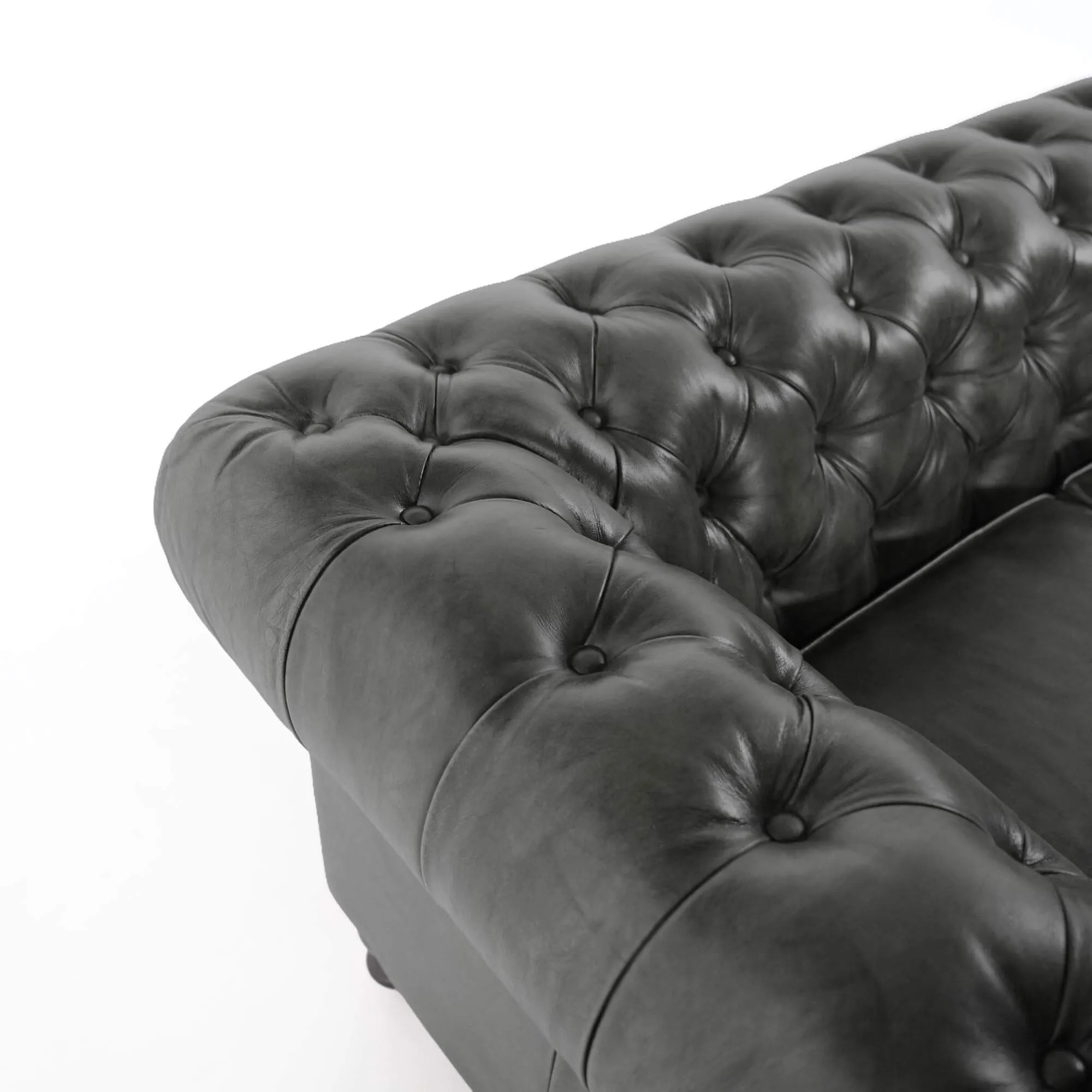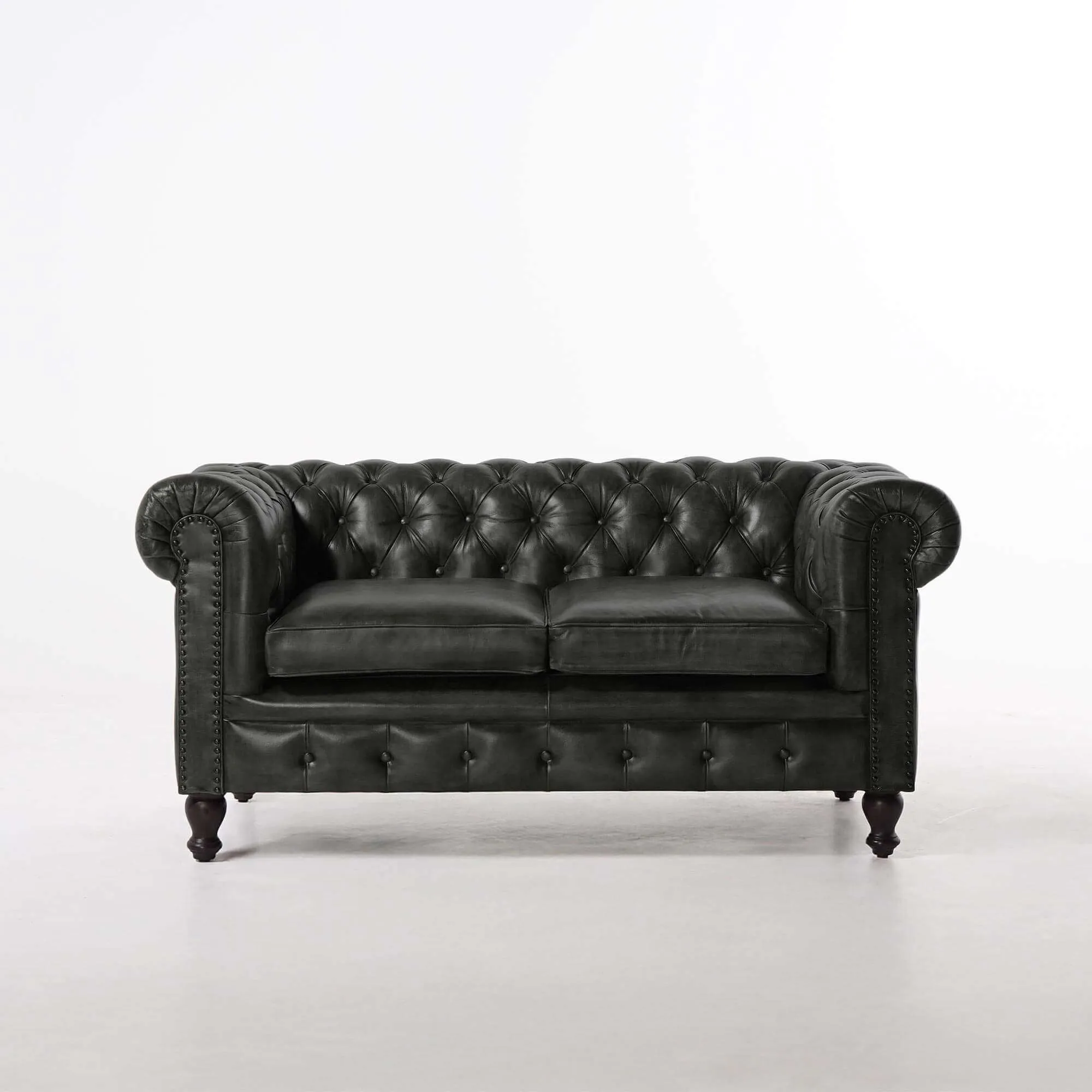 Dankzij zijn compacte formaat past hij gemakkelijk in een woonkamer, bureau of leeshoek, zonder ooit aan uitstraling te verliezen. De zitting van deze zwarte leren Chesterfield 2-zitsbank, met een breedte van 104 cm, biedt een comfortabele ruimte voor twee personen, terwijl de diepte van 56 cm ervoor zorgt dat je er vanzelf prettig in plaatsneemt, om te praten of gewoon even tot rust te komen. De zithoogte, ongeveer 55 cm, werd ontworpen voor een vlot dagelijks gebruik: niet te laag en niet te hoog.