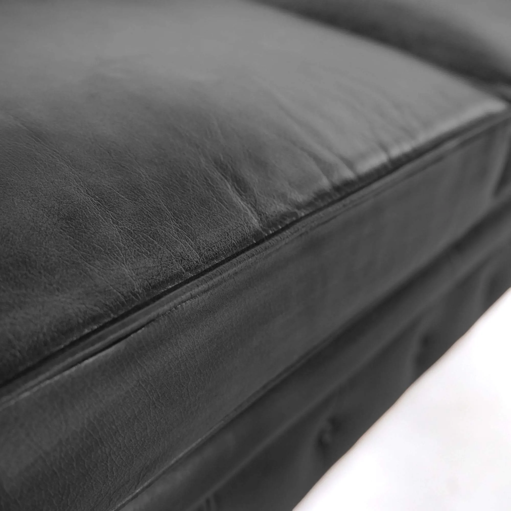 Het volnerf buffelleder, geselecteerd om zijn stevigheid en authentieke nerf, toont hier een diepe zwarte tint met subtiele nuances. In het licht komen lichte variaties naar voren die het handmatig aangebrachte capitonnage benadrukken. Dat reliëf, samen met het soepele gevoel van het leder, zorgt al vanaf het eerste gebruik voor een omhullend en haast vertrouwd comfort.