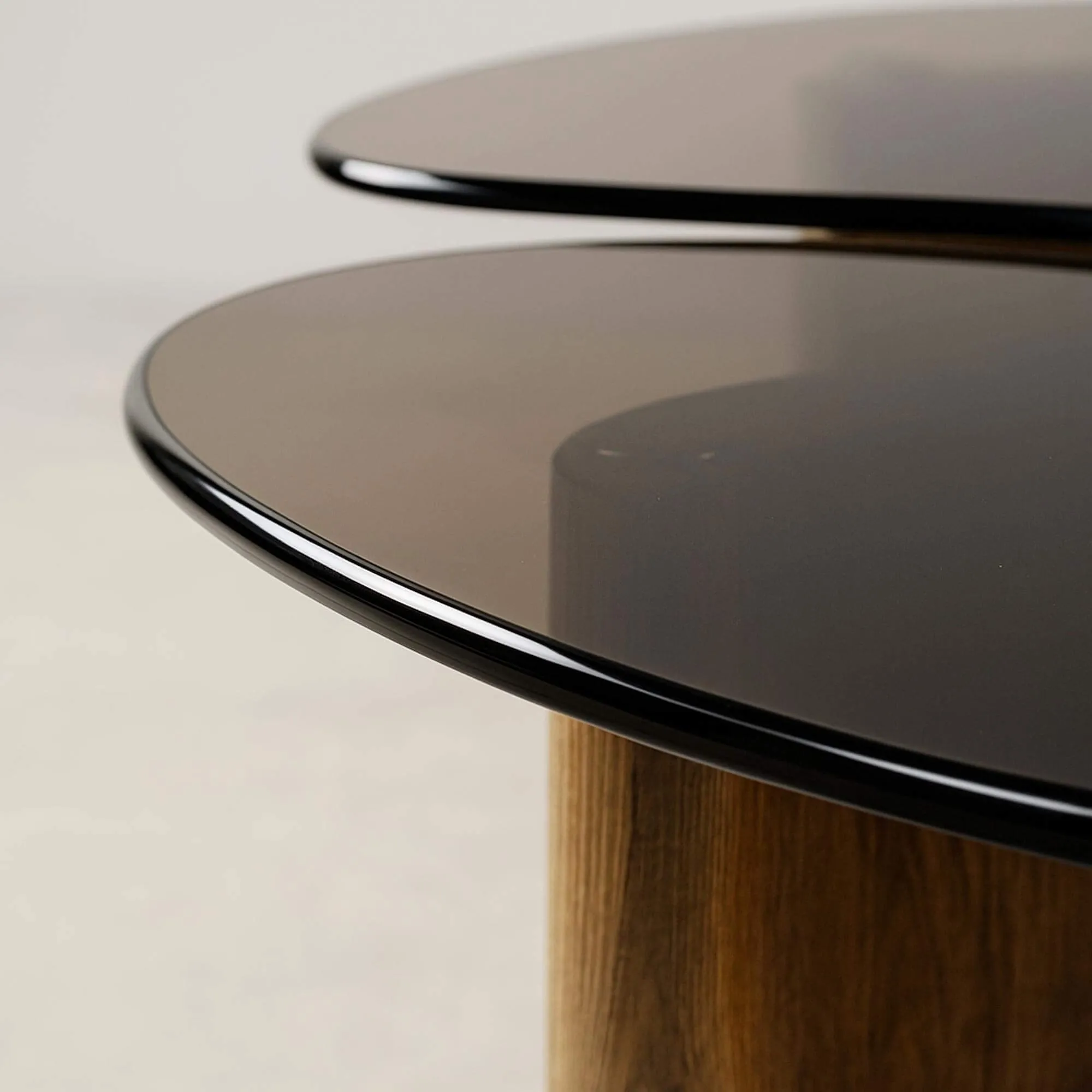 Binnen de Tinto-collectie wilden we een andere manier verkennen om de salontafel te benaderen: visueel lichter, verfijnder, maar met behoud van de diepte en warmte van hout. Deze organisch gevormde salontafel met glazen blad in twee modules speelt met de transparantie van het getinte glas en de ronding van de gebogen houten poten, waardoor een geheel ontstaat dat zowel luchtig als karaktervol is. Vanaf de eerste schetsen wilden onze ontwerpers een stuk creëren waarin het licht vrij kan circuleren, zonder ooit in te boeten aan stabiliteit of aanwezigheid.