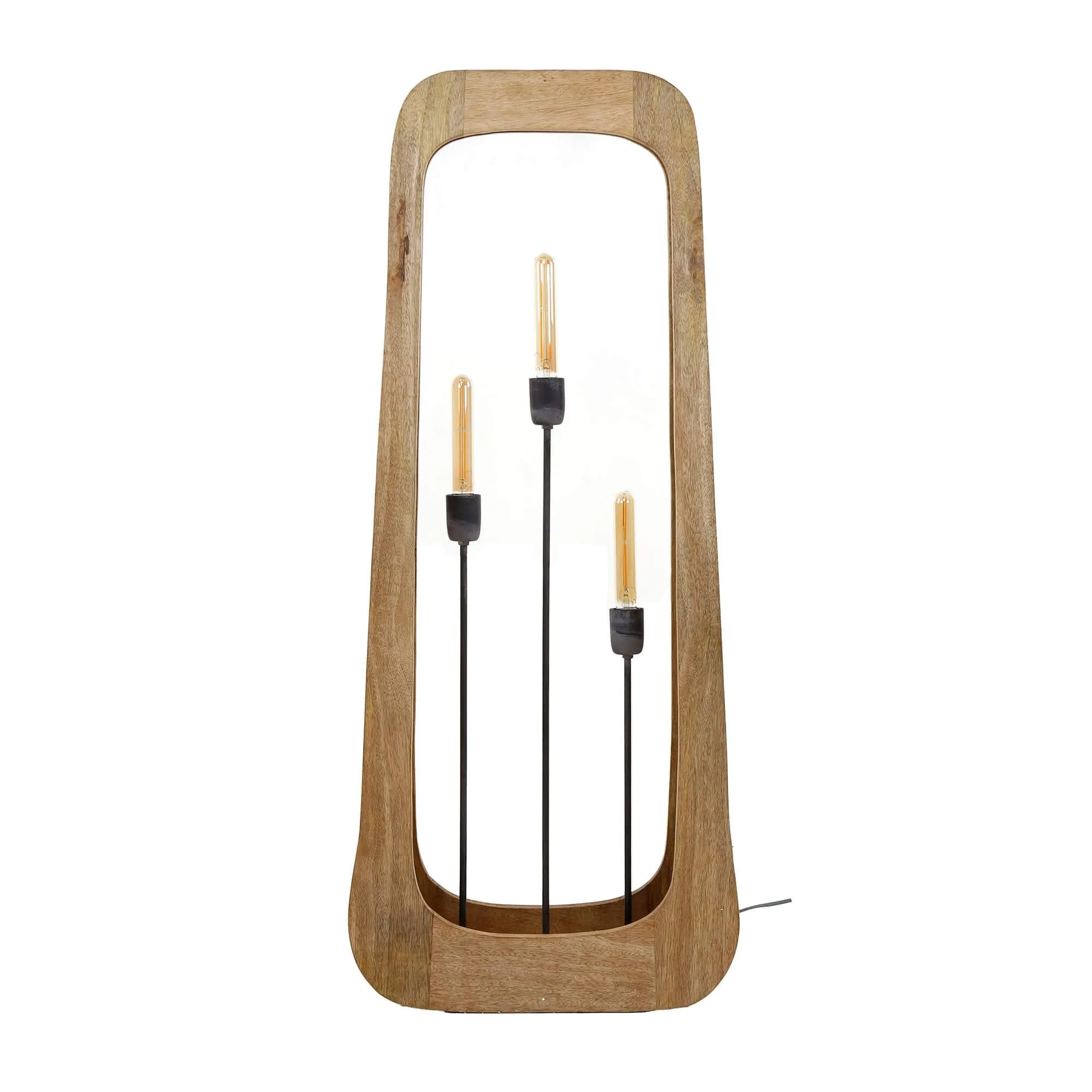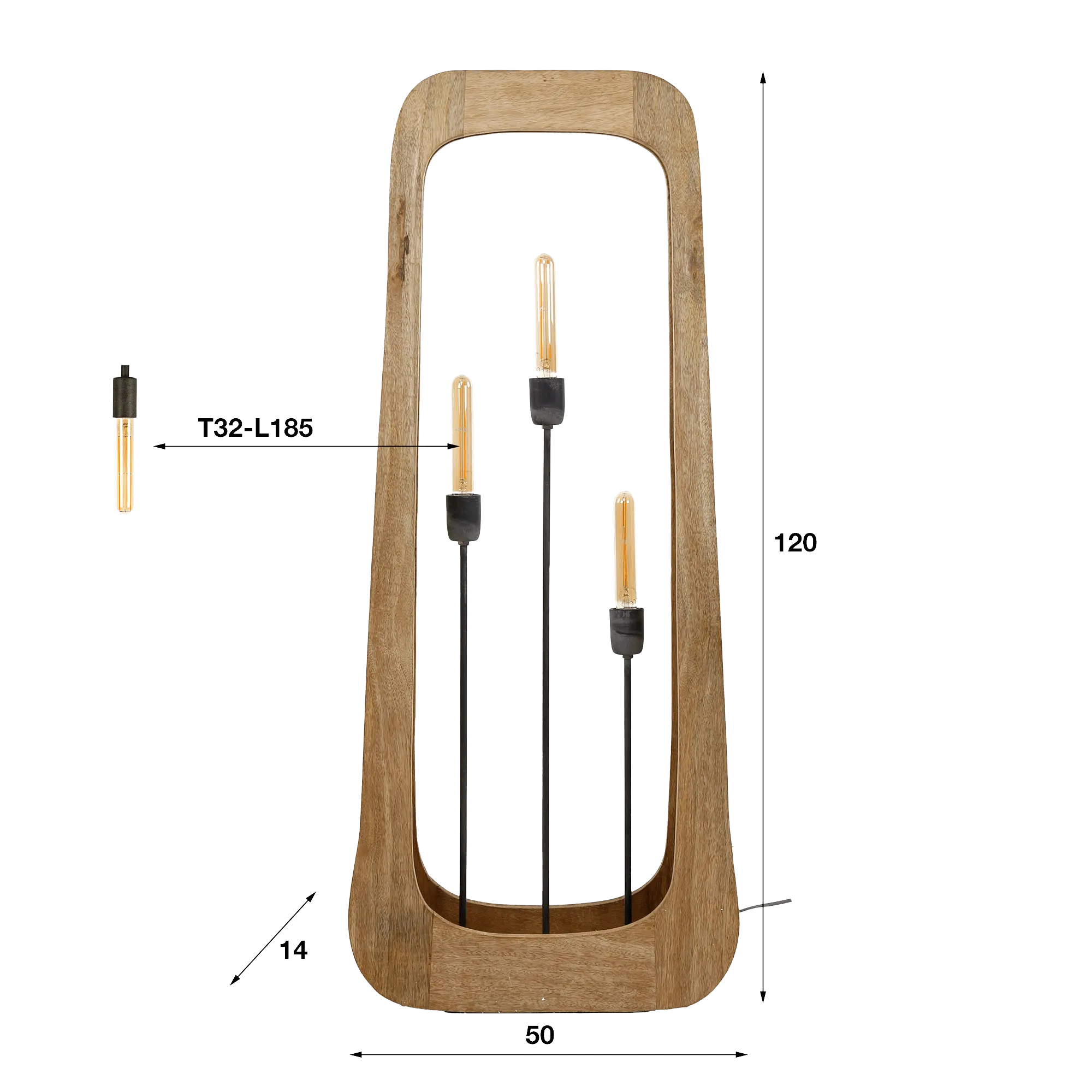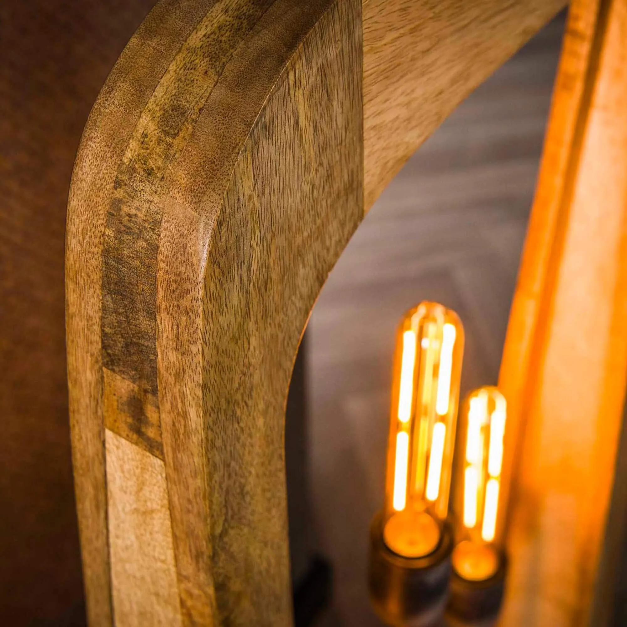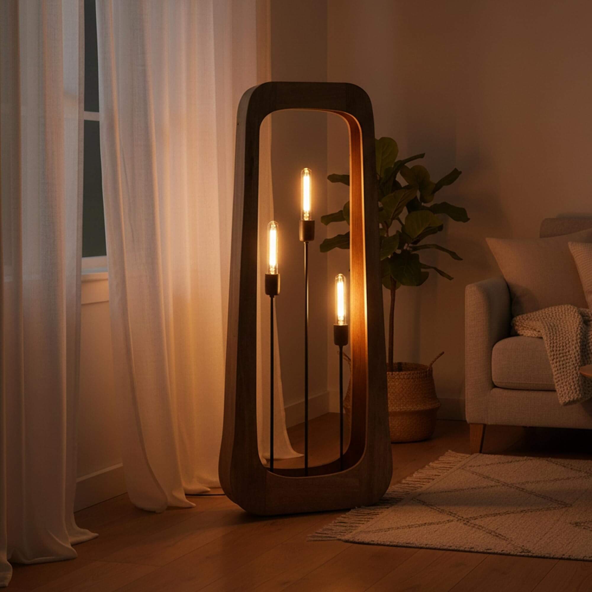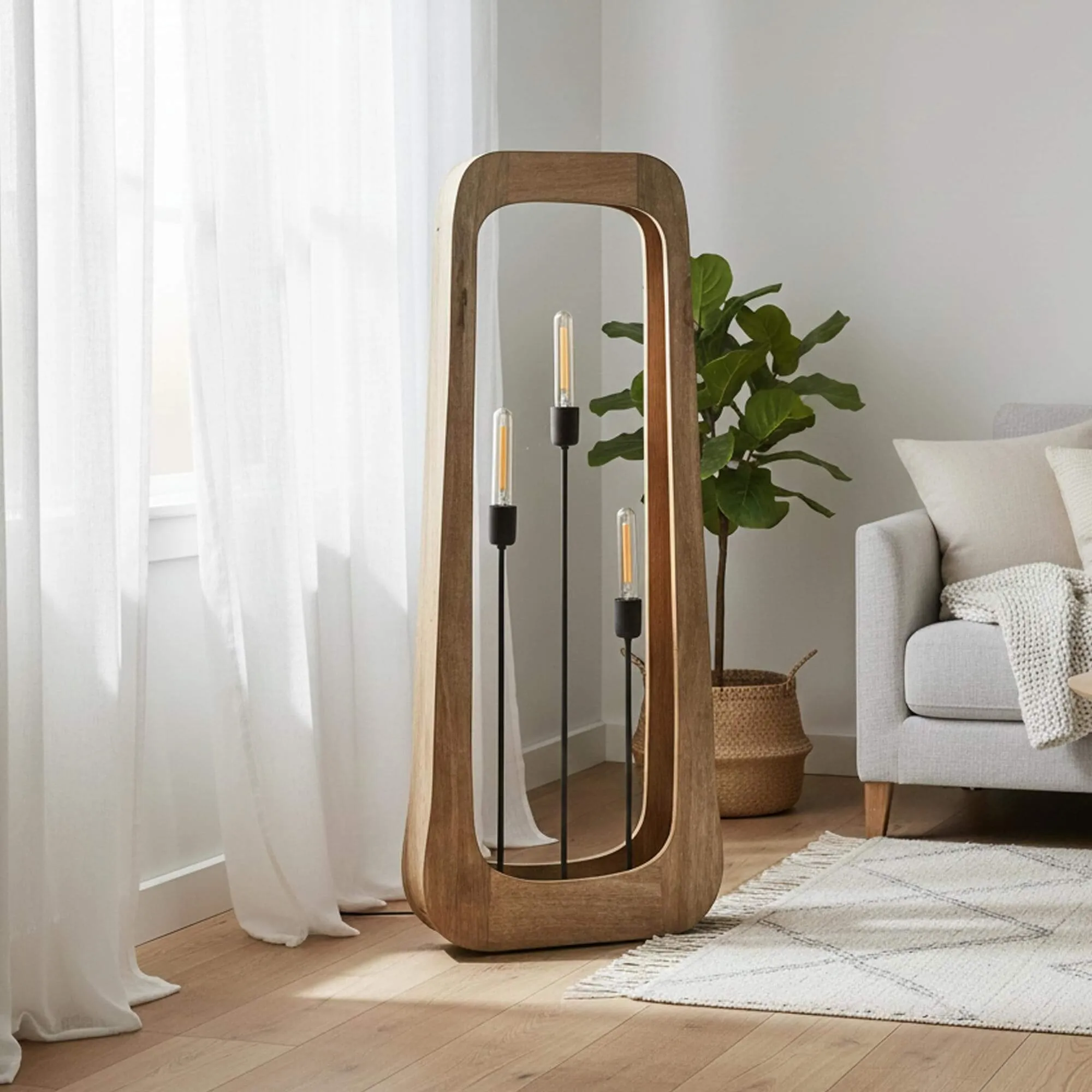 Met de staande lamp in massief mangohout Noxios hebben onze ontwerpers een lichtobject gecreëerd dat zich in de woonkamer nestelt als een echt architecturaal element. Het grote kader in massief hout van mango, ongeveer 120 cm hoog en 50 cm breed, vormt een zachte opening, bijna als een raam dat op de vloer staat. De afgeronde hoeken, de satijnzachte houtstructuur en de honingkleurige nuances van mango zorgen meteen voor een rustige sfeer die typisch is voor de Japandi-stijl.