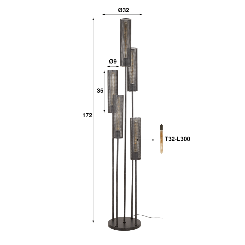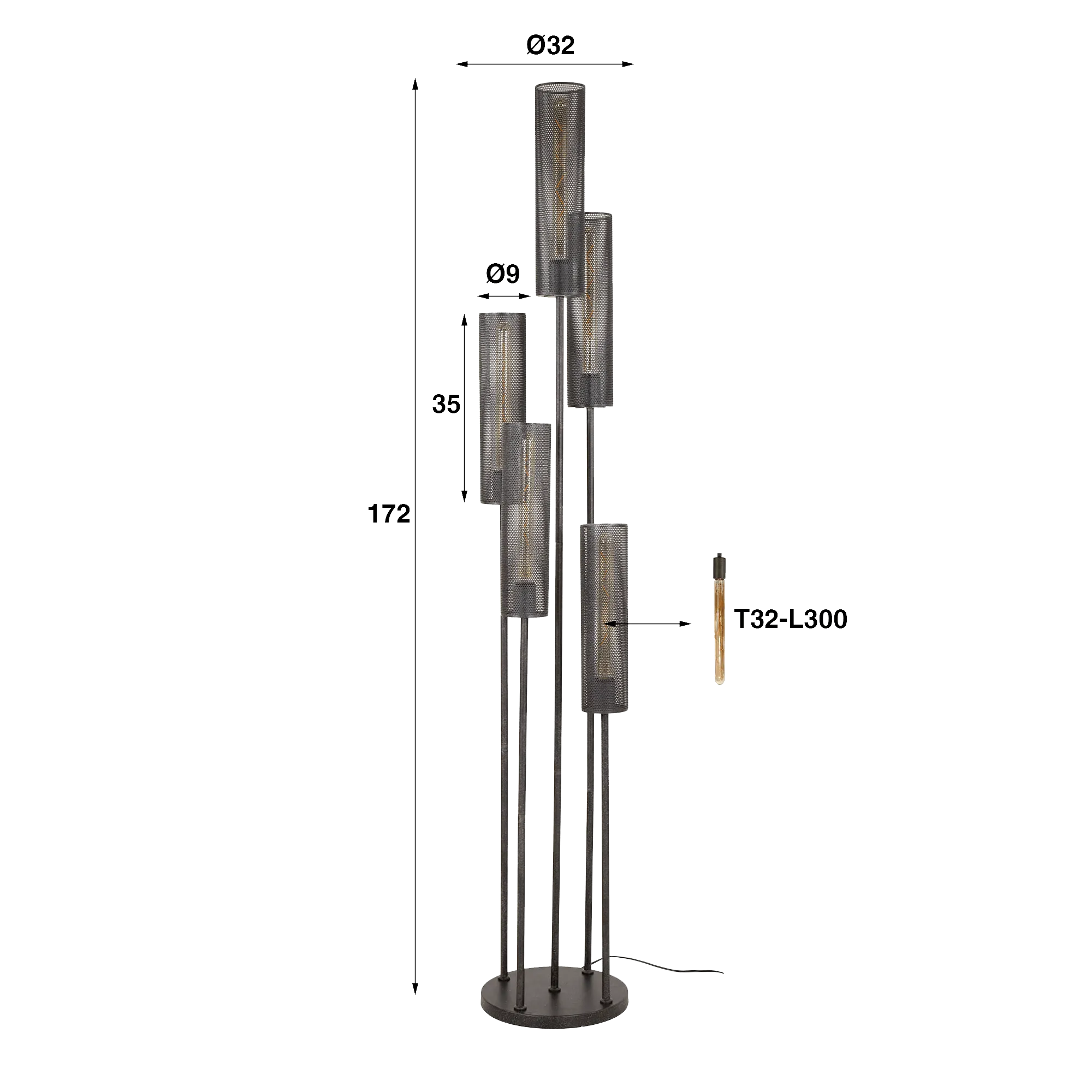 Het silhouet van deze moderne vloerlamp met 5 LED-lichtbuizen bestaat uit vijf lichtgevende buizen, geplaatst op verschillende hoogtes om een zacht en evenwichtig visueel ritme te creëren. Elke cilindrische lampscherm, ongeveer 35 cm hoog en 9 cm in diameter, is vervaardigd uit geperforeerd metaal. Dit fijne raster verspreidt het licht op een bijzonder delicate manier: de perforaties projecteren een warme, getextureerde gloed die in de loop van de dag verandert. We hebben lang gewerkt aan deze afwerking om een subtiel resultaat te verkrijgen dat de ruimte verlicht zonder te verblinden. De LED-lampen van het type T32-L300 (niet inbegrepen), perfect geschikt voor deze moderne vloerlamp met 5 lichtbuizen, versterken deze esthetiek door een verticale lichtlijn te creëren die de totale hoogte van 172 cm accentueert.