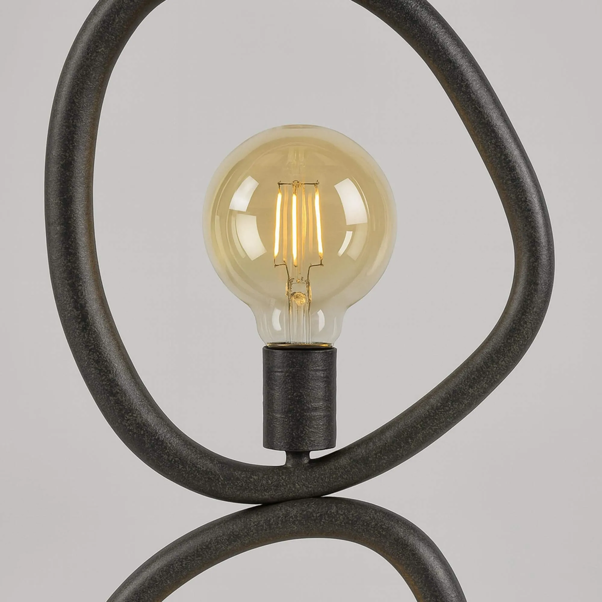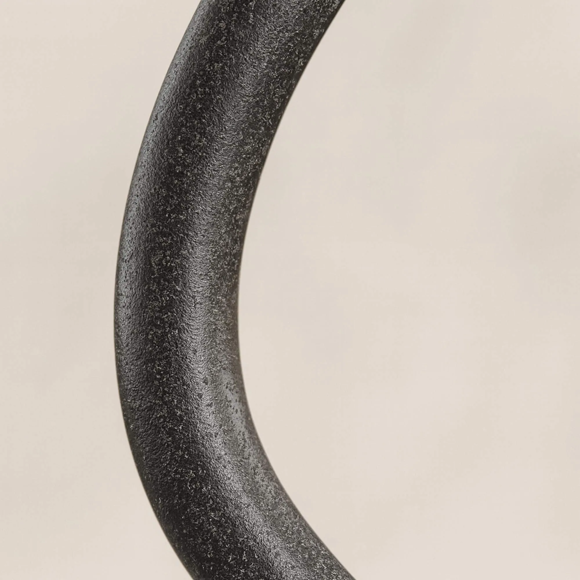 De verlichting draagt sterk bij aan het karakter van de design vloerlamp in zwart metaal Solin. De bolvormige lampen van het type G125 (niet inbegrepen) verspreiden een warme en omhullende gloed die de organische vorm van elke ring benadrukt. Hun positie in het midden van de structuren creëert een gevoel van diepte, bijna sculpturaal, zonder ooit de ruimte te overheersen. We wilden dat het licht zachtjes over het metaal glijdt, als een weerspiegeling op ruwe steen, om het natuurlijke karakter van het ontwerp te versterken.
