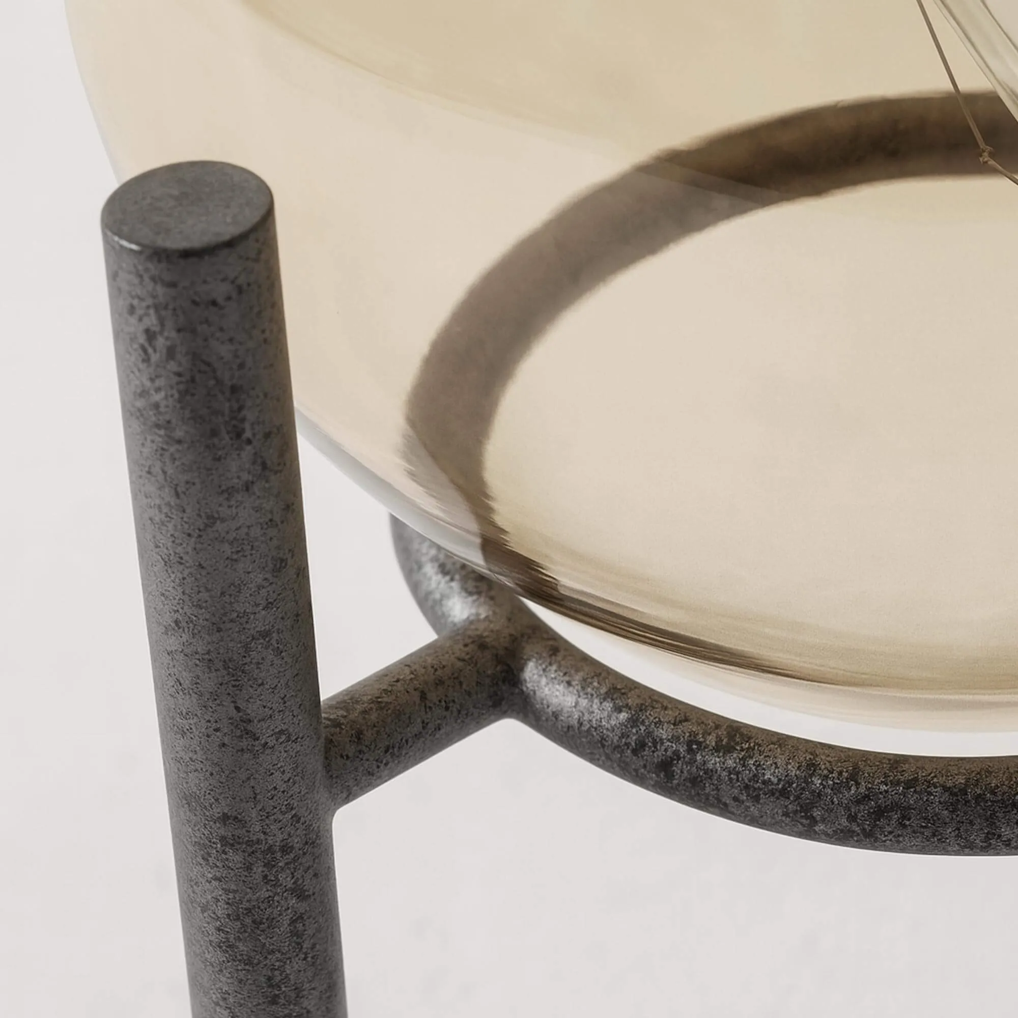 De industriële tafellamp in verouderd zilver Saturn is ontstaan uit onze wens om de sfeer van een curiositeitenkabinet te herinterpreteren met een stuk dat tegelijk intrigerend en visueel bijzonder eenvoudig is. Onze designers bedachten deze circulaire vorm als een klein object van moderne alchemie: een amberkleurige glazen bol geplaatst in een metalen structuur met een bewust ruwe patina die lijkt alsof ze de tijd heeft doorstaan. Met slechts 34 cm hoogte en een totale diameter van 28 cm vindt ze moeiteloos haar plaats op een bureau, een boekenplank of een dressoir, waar ze een zachte, omhullende gloed verspreidt.