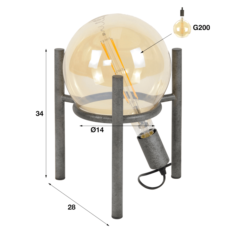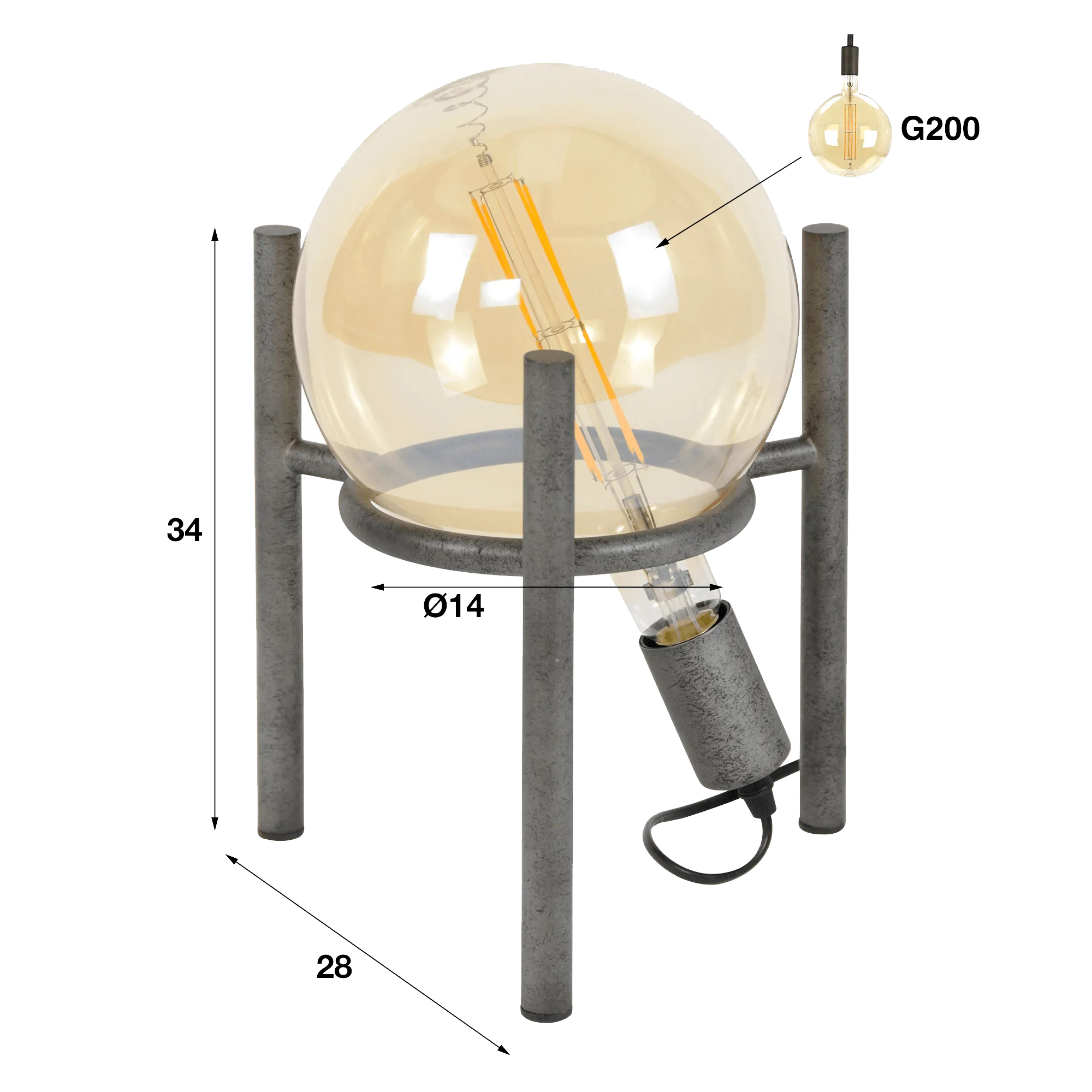 Voor het ontwerp van deze industriële tafellamp kozen we voor metaal met een afwerking in verouderd zilver, vanwege zijn korrelige, bijna minerale karakter dat de warme weerspiegelingen van de lamp prachtig benadrukt. De perfect bolvormige lamp, geplaatst in een ring van 14 cm diameter, geeft het geheel een bijna wetenschappelijke uitstraling: alsof het licht afkomstig is van een bol die delicaat in evenwicht wordt gehouden. De G200-lamp (niet inbegrepen) draagt volledig bij aan deze sfeer dankzij haar royale vorm en zichtbare filamenten.