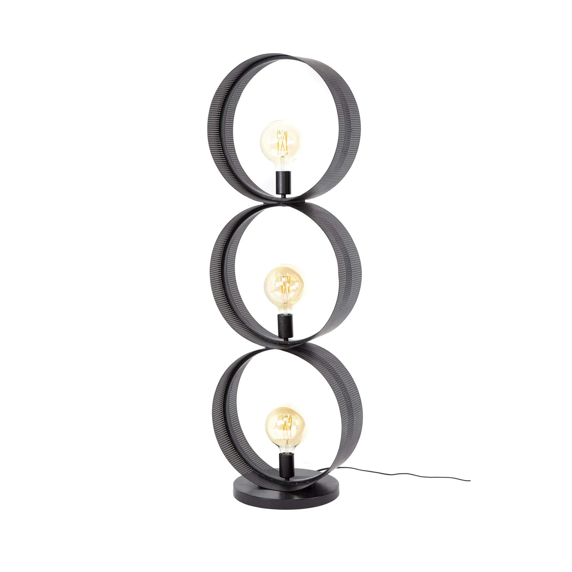 Gemaakt van metaal onthult de structuur van deze staande lamp in metaal met antracietafwerking een geperforeerde textuur die het licht zacht laat doorfilteren. We hebben het ontwerp van de ringen zo uitgewerkt dat ze een sterke visuele aanwezigheid behouden zonder de ruimte te verzwaren. Met een hoogte van ongeveer 122 cm rijst de lamp licht en elegant op, gedragen door een ronde voet van 30 cm diameter die voor stabiliteit en stevigheid zorgt.