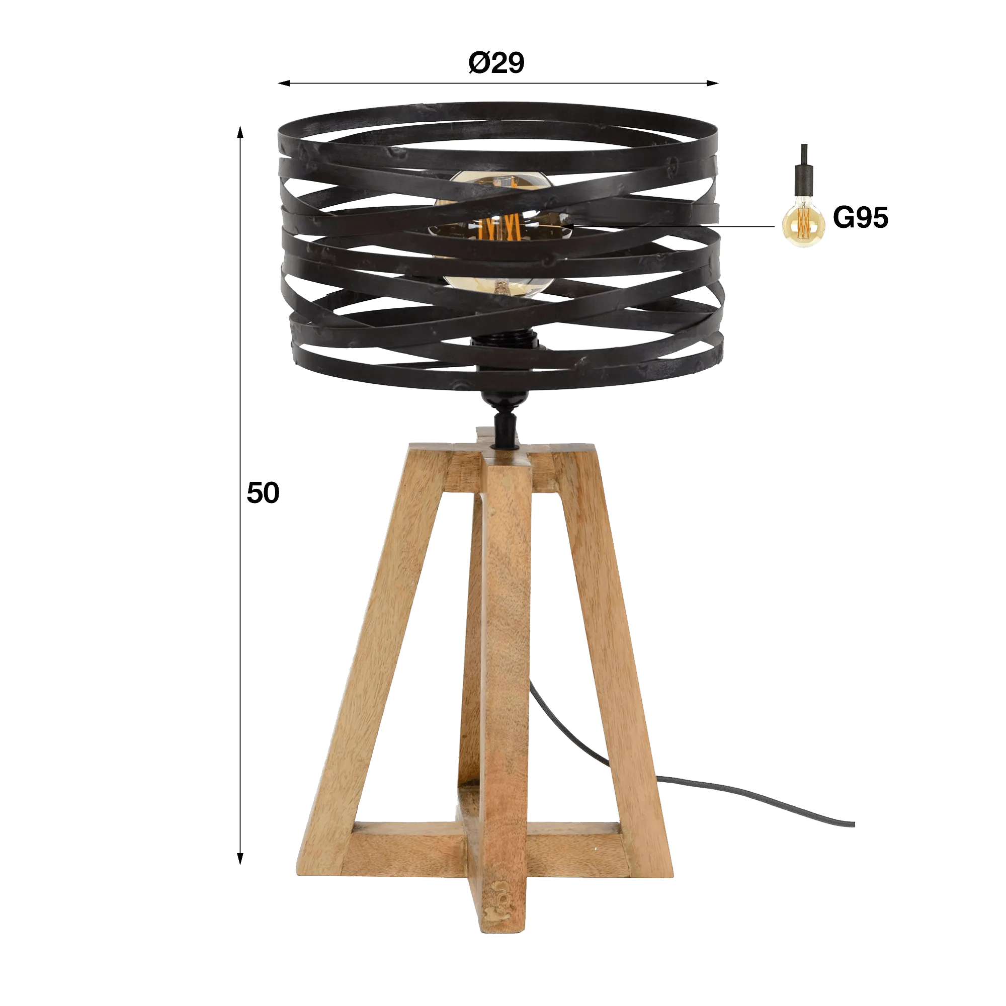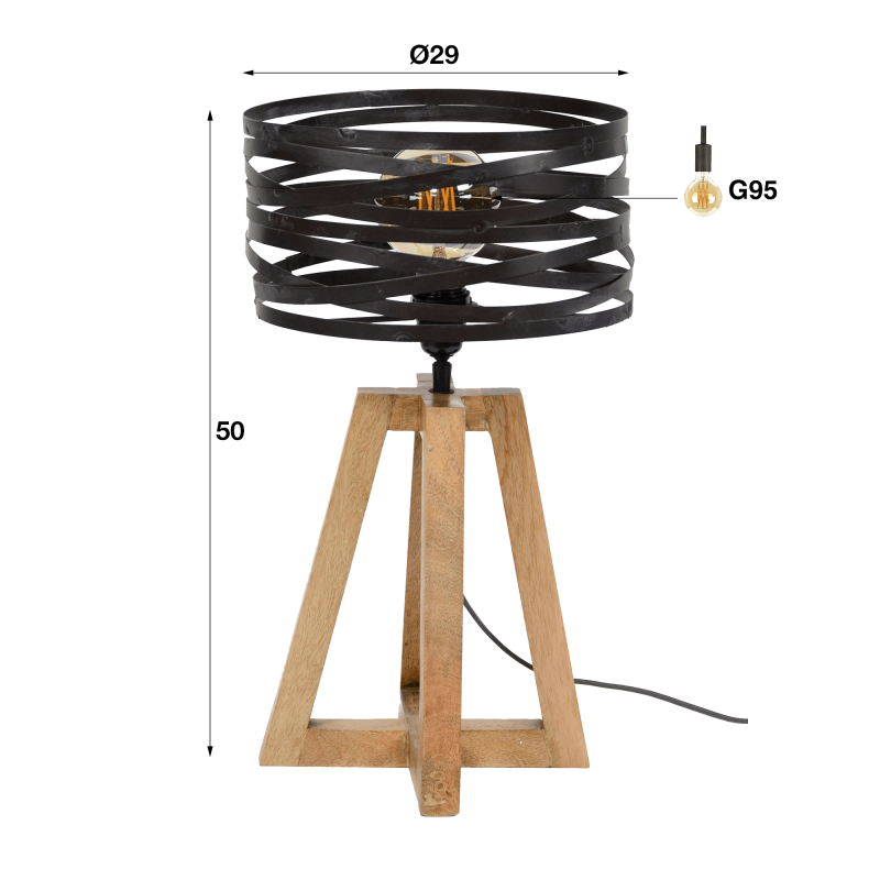 De houten voet van deze industriële bureaulamp in hout met gedraaide metalen lampenkap, uitgewerkt in een open en stabiele structuur, zorgt voor een natuurlijk gevoel van verankering. Met zijn hoogte van 50 cm brengt hij een zachte aanwezigheid, ideaal op een dressoir, console of bijzettafel. Het metaal van de kap, met een diameter van 29 cm, verspreidt een getextureerd licht dat een subtiel en levendig schaduwspel op de muren creëert. Bij valavond ontstaat er een warme, bijna omhullende sfeer, die nog wordt versterkt door het gebruik van een aanbevolen G95-lamp (niet inbegrepen), perfect in harmonie met de structuur.
