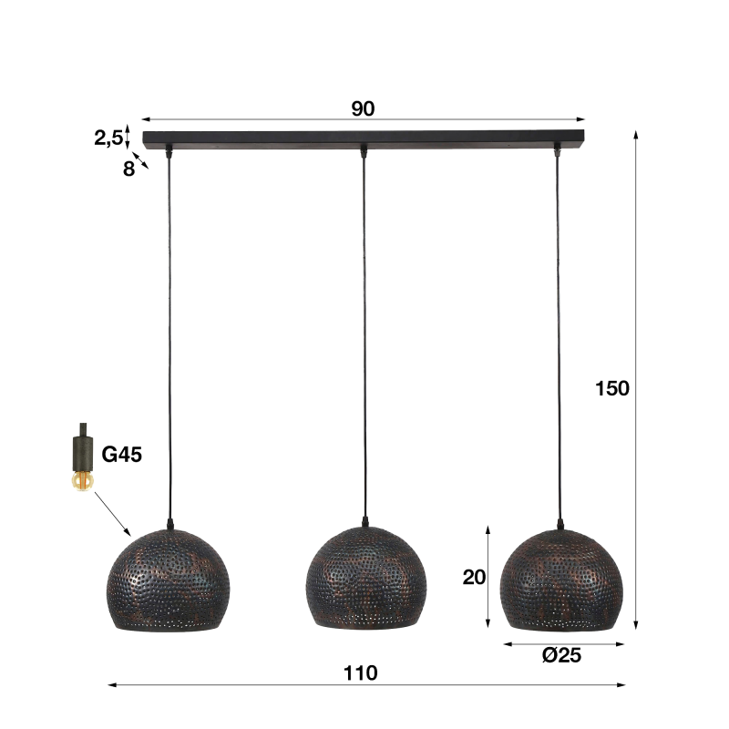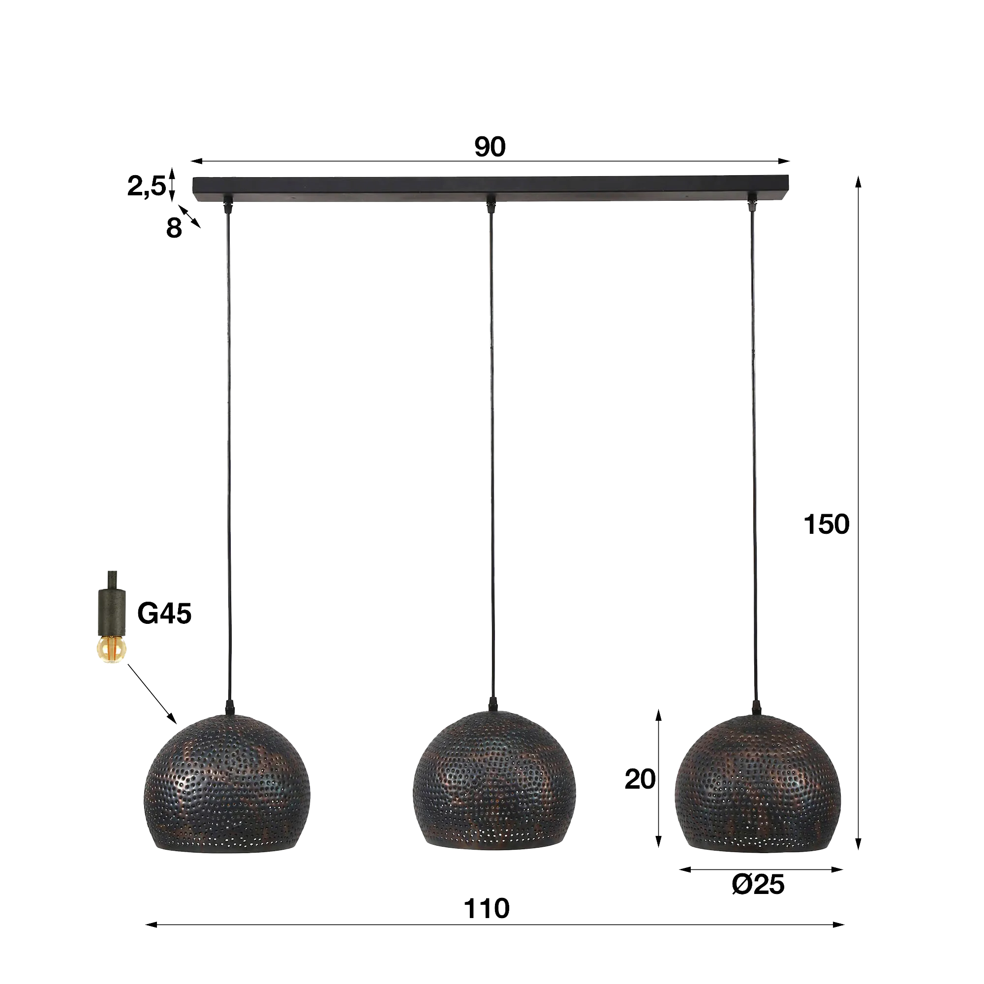 Elke kap, vervaardigd uit bruin en zwart metaal en met de hand geperforeerd, onthult een levendige structuur die het licht zacht en gedempt verspreidt. De openingen creëren een levendige, licht getextureerde gloed, alsof het licht door het materiaal heen ademt. Geïnstalleerd op een langwerpige balk van 90 cm vinden de drie koepels met een diameter van 25 cm vanzelf hun balans boven een tafel of een aanrecht, en brengen ze ritme en reliëf in de ruimte. De in hoogte verstelbare ophanging tot 150 cm maakt het mogelijk de verlichting aan te passen aan zowel intieme ruimtes als royale volumes.