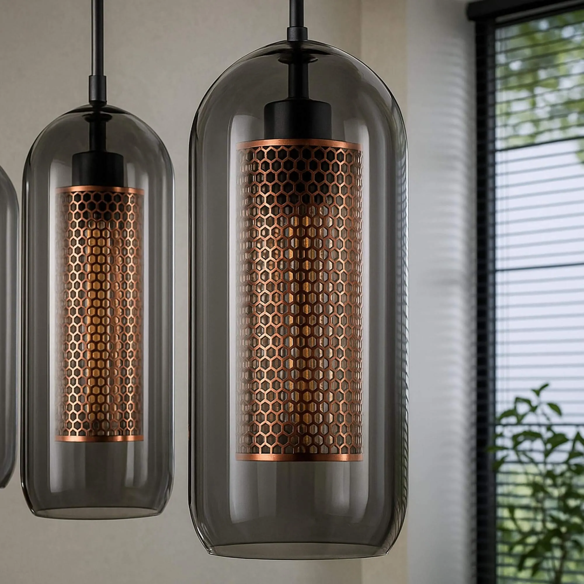 Hanglamp met mondgeblazen rookglazen kapjes – Brila