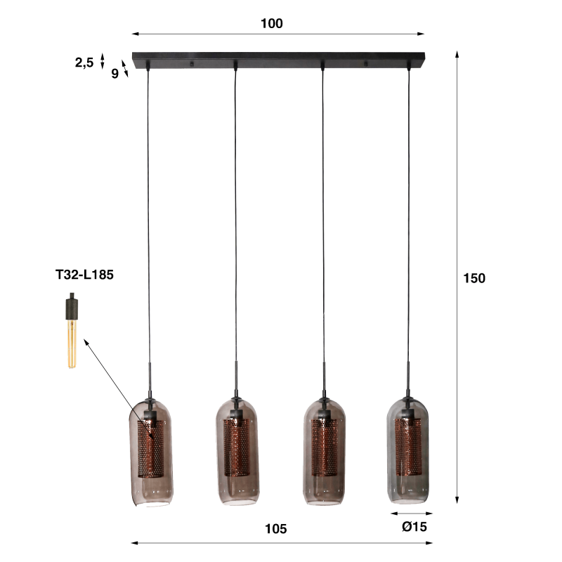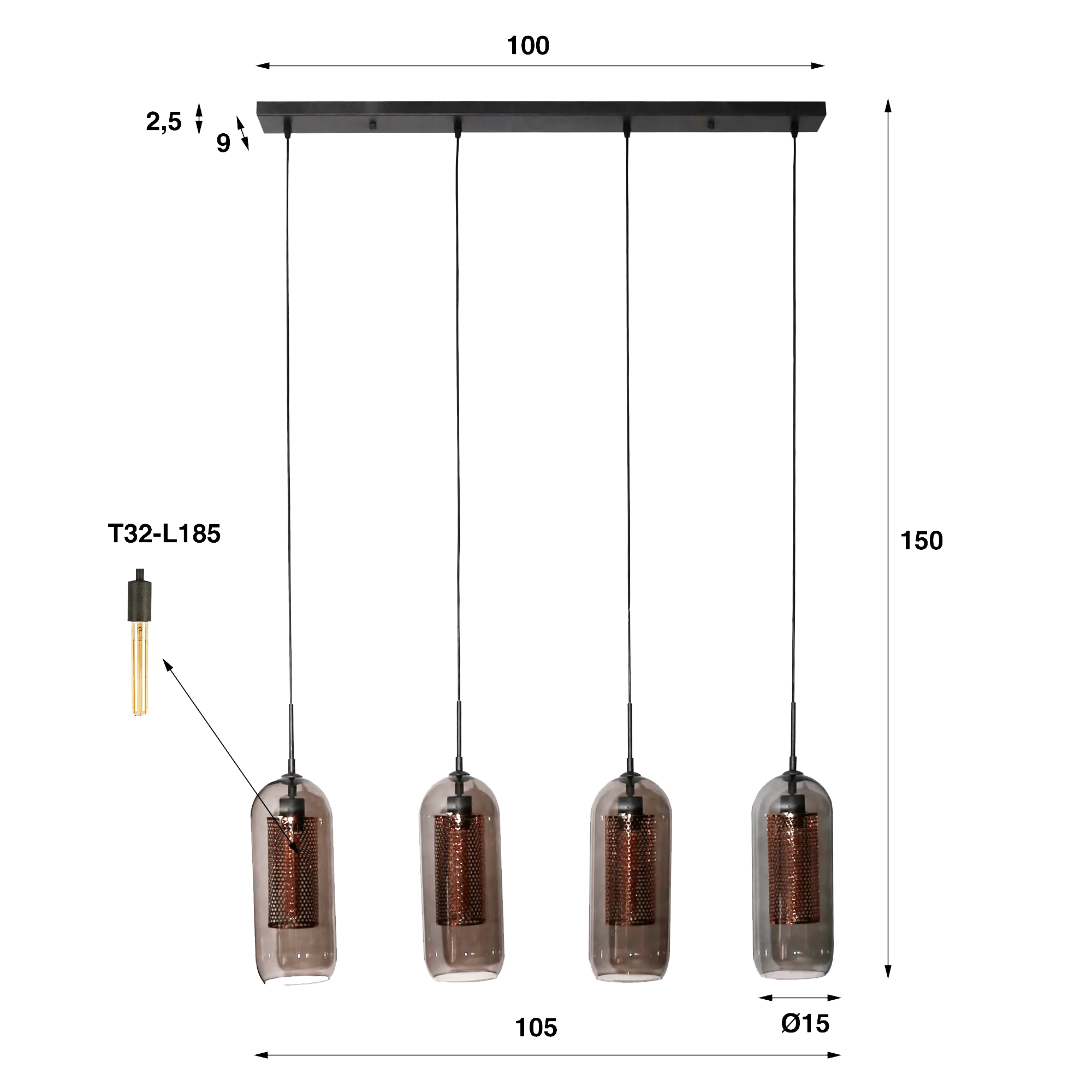 Het zwarte metaal en de warme tint van het koper vullen elkaar op een natuurlijke manier aan en creëren een verfijnd contrast waar we bijzonder van houden. De licht afgeronde handgeblazen glazen kap verspreidt een harmonieuze lichtbundel, ideaal om een maaltijd te begeleiden of een grote ruimte warm te verlichten. De installatie van deze hanglamp met handgeblazen gerookte glazen kappen is eenvoudig en intuïtief, zodat men snel van de lamp kan genieten. De T32-L185 lampen (niet inbegrepen) maken het mogelijk om de lichtsfeer aan te passen aan de gewenste ambiance.