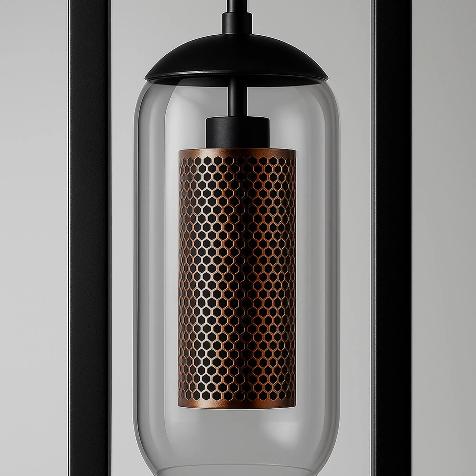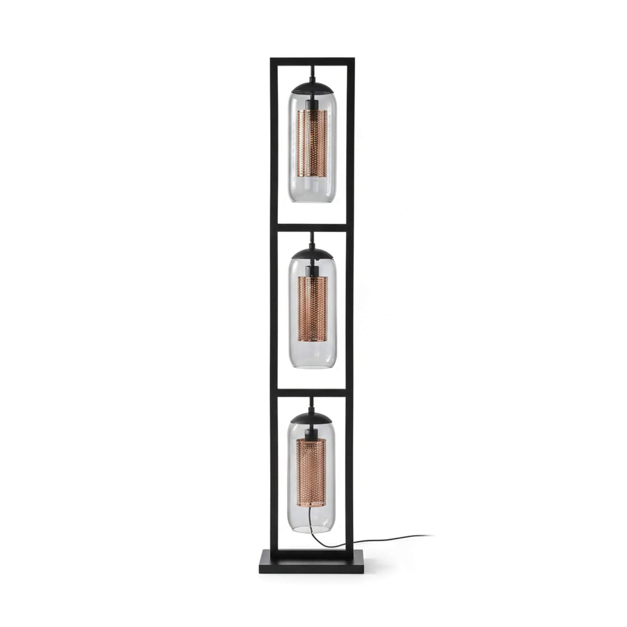 Elke cilinder van deze staande lamp voor de woonkamer met geblazen gerookte glazen kappen bevat een koperkleurig metalen rooster, uitgewerkt in een hexagonaal patroon voor een uniek spel van reflecties. Dit contrast tussen de transparantie van het glas en de diepte van het gepatineerde metaal vormt de kern van de identiteit van de Brila-collectie. Met zijn hoogte van 158 cm en een voet van 32 × 23 cm blijft de staande lamp voor de woonkamer met geblazen gerookte glazen kappen stabiel, terwijl hij toch een slanke vorm behoudt die gemakkelijk in een leeshoek of naast een sofa past.