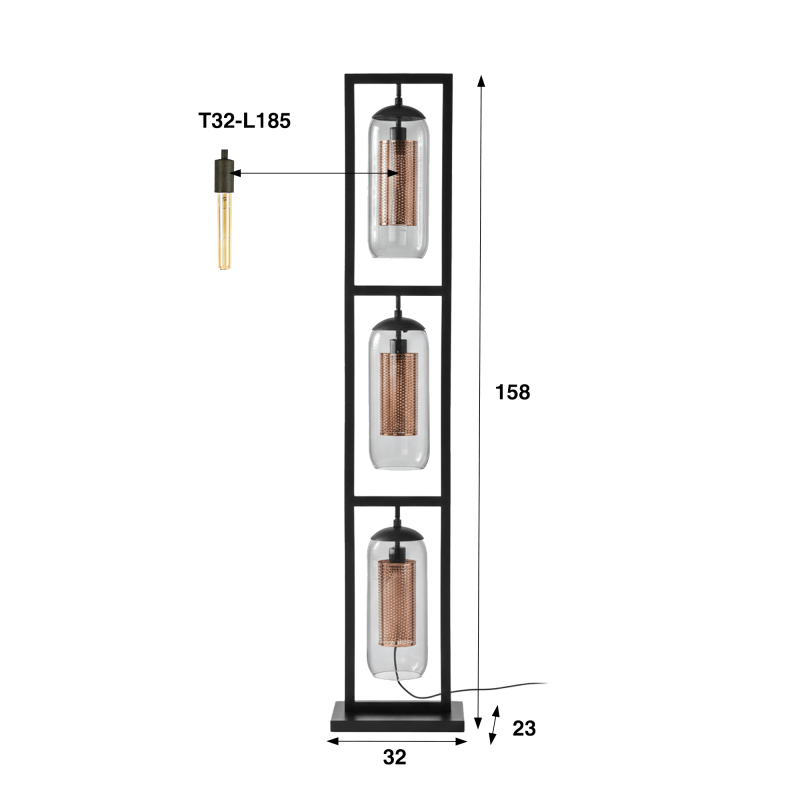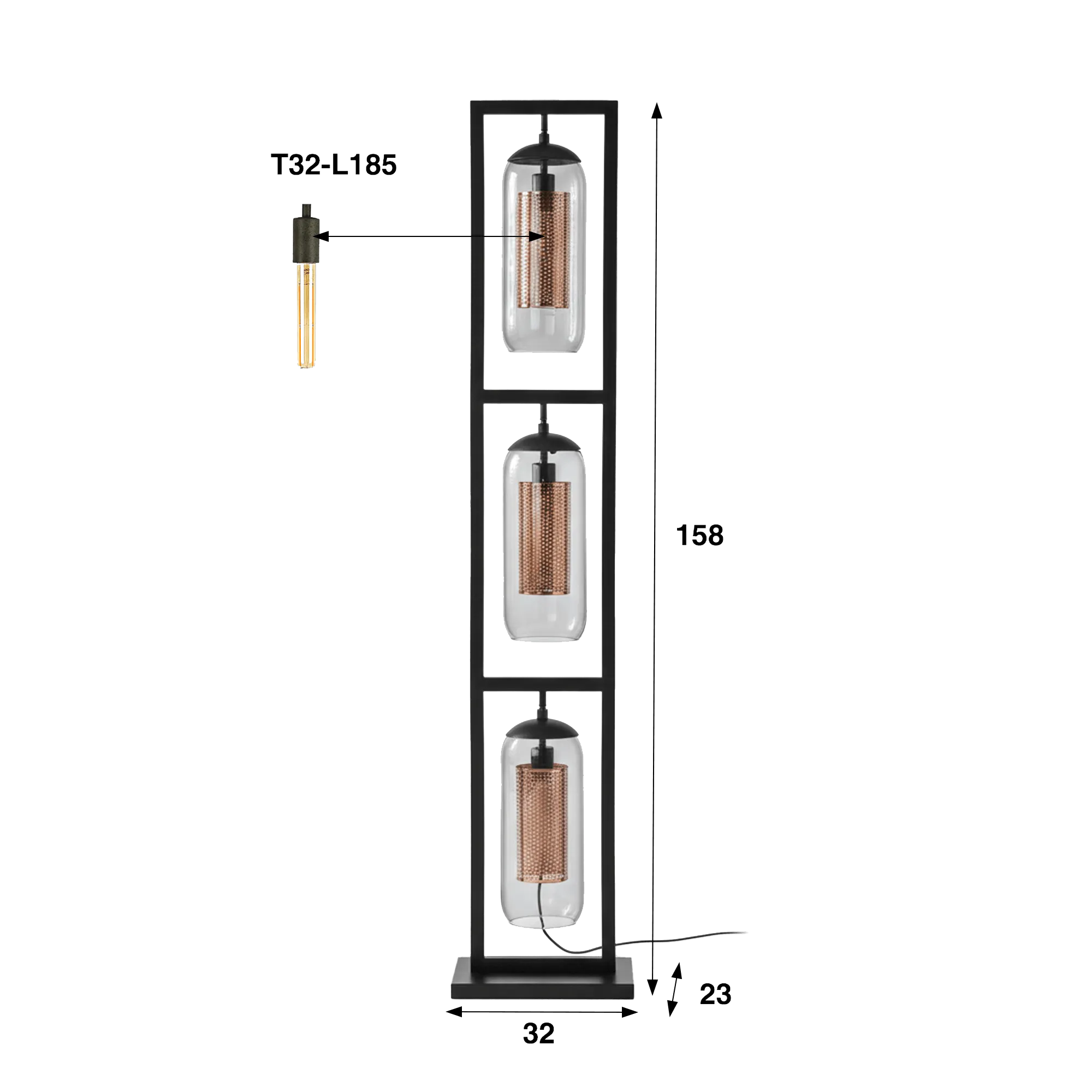 Onze ontwerpers hebben de verhoudingen van de drie lichtelementen zorgvuldig afgestemd om een harmonieus visueel ritme te creëren. De lampenkappen zijn uitgelijnd in een structuur die het licht vrij laat circuleren, en de hoogte van de verschillende onderdelen zorgt voor een omhullende verlichting zonder te verblinden. De installatie van deze staande lamp voor de woonkamer met geblazen gerookte glazen kappen is eenvoudig: u hoeft enkel de onderdelen van elke lamp te monteren en op de structuur te plaatsen. We kozen voor T32-L185 lampen (niet inbegrepen), geselecteerd voor hun intensiteit en warme tint.