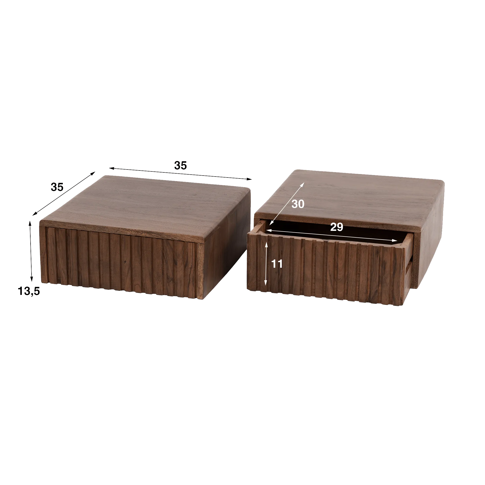 Met zijn evenwichtige proporties – 35 cm breed en diep en een hoogte van ongeveer 13,5 cm – biedt ons hangend nachtkastje in massief acaciahout Nest een comfortabel oppervlak voor een lamp, een boek of enkele dagelijkse objecten. De lade, met een nuttige breedte van 29 cm en een hoogte van 11 cm, maakt het mogelijk alles wat men liever uit het zicht houdt binnen handbereik te bewaren. De soepele opening getuigt van de zorg die aan ontwerp en ergonomie werd besteed, een aspect waaraan wij bijzonder veel belang hechten.