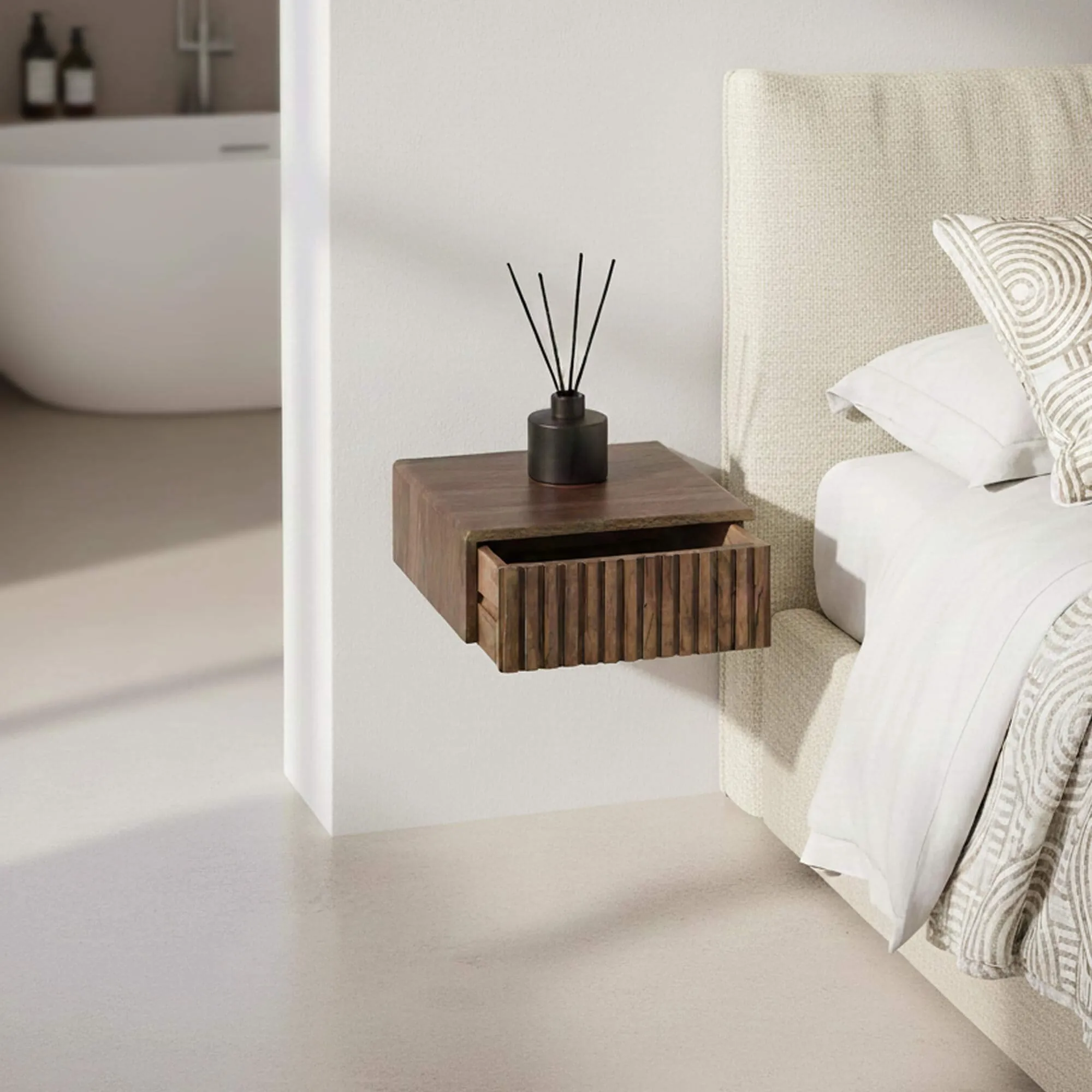 Dit hangende nachtkastje in massief acaciahout wordt gemonteerd geleverd en is ontworpen voor een eenvoudige en snelle installatie, zodat het gebruik net zo vanzelfsprekend is als zijn esthetiek. Als duo, aan weerszijden van het bed, structureren ze de slaapruimte op een evenwichtige manier en passen ze zowel in een strak interieur als in een warmere sfeer met etnische invloeden.