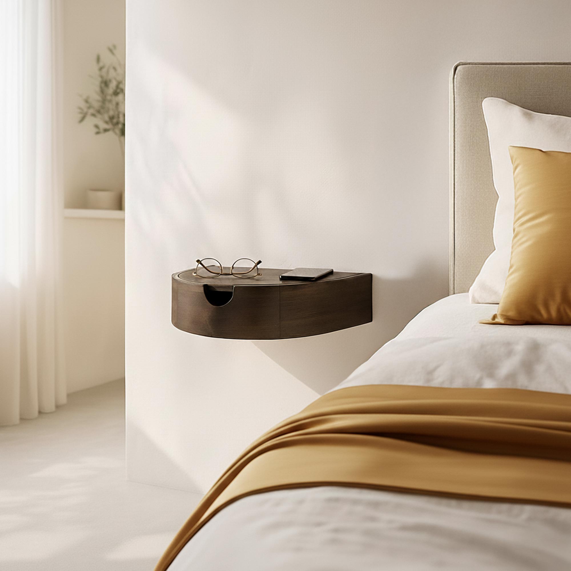 Aan de muur bevestigd, maakt ons zwevend nachtkastje in massief acaciahout Nocte de vloer vrij en brengt het een gevoel van lichtheid in de slaapkamer. Het compacte formaat integreert zich moeiteloos aan weerszijden van het bed, zelfs in kleinere ruimtes. De frontdeur, subtiel uitgehold voor een intuïtieve grip, opent naar een opbergruimte die is ontworpen voor de dagelijkse essentials. De binnenafmetingen laten toe om gemakkelijk een boek, persoonlijke voorwerpen of kleine accessoires op te bergen, terwijl de voorzijde strak en sober blijft. Het bovenblad, met evenwichtige proporties, biedt voldoende ruimte voor een telefoon, een bril of een decoratief object.