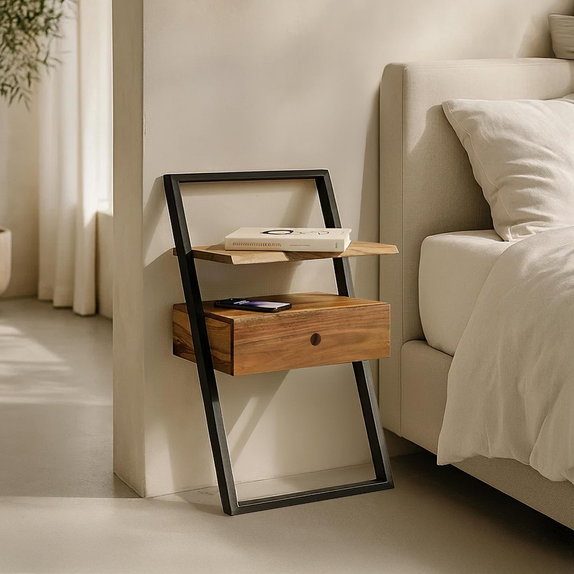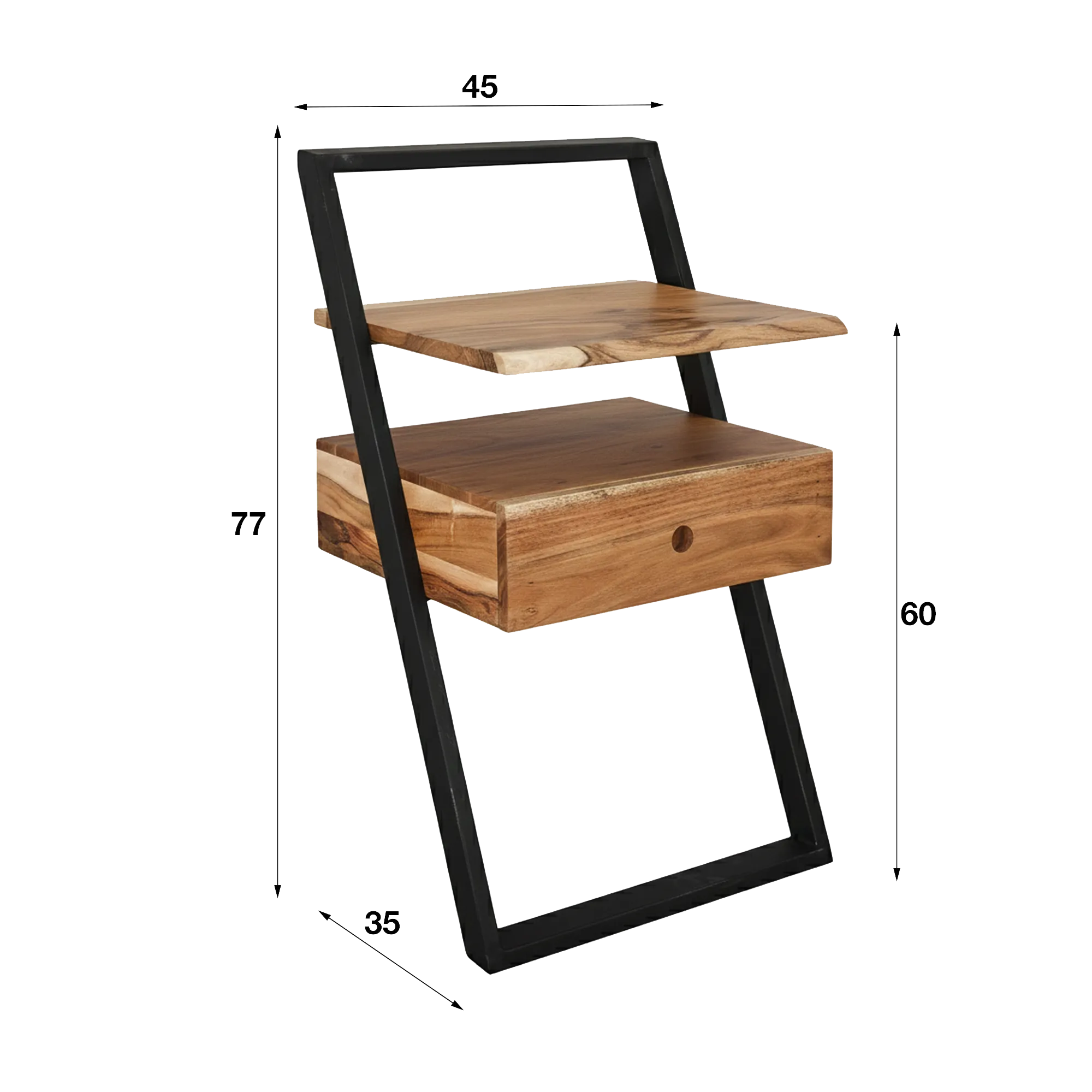 De grafische structuur van ons Lean nachtkastje in massief acaciahout, geïnspireerd op de industriële stijl met zijn contouren in zwart metaal, zorgt voor een geruststellende stabiliteit terwijl het geheel luchtig blijft. Met een breedte van ongeveer 45 cm en een diepte van circa 35 cm vindt het nachtkastje Lean moeiteloos zijn plaats naast het bed, zelfs in compactere slaapkamers. De totale hoogte van ongeveer 77 cm zorgt voor comfortabel gebruik, terwijl het bovenblad, op ongeveer 60 cm van de vloer, vanzelf plaats biedt aan een lamp, een boek of een telefoon.