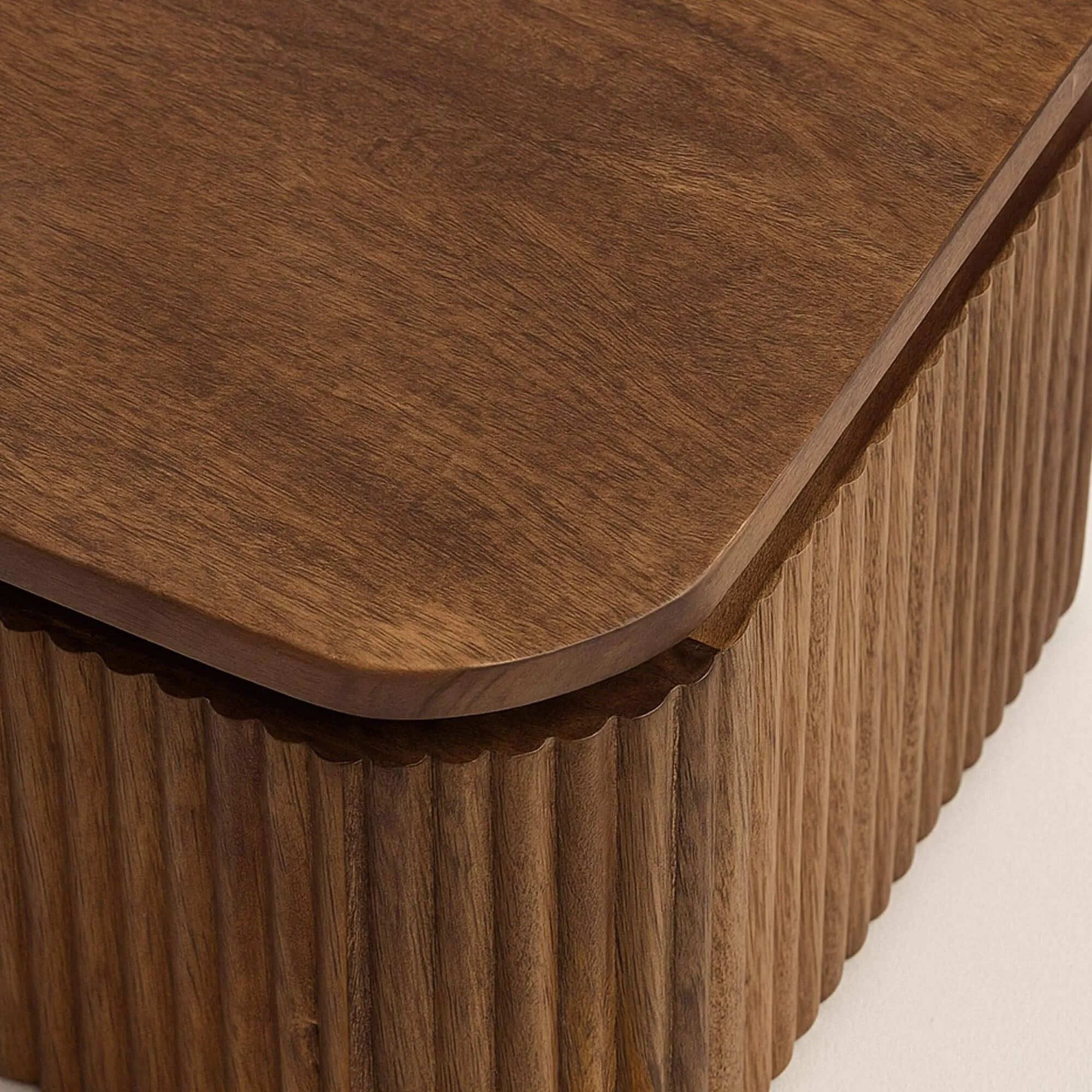 Op ambachtelijke wijze vervaardigd, onthult deze nachttafel in massief mangohout een levendig en warm materiaal, waarvan de tinten subtiel variëren naargelang het licht. De dichte en diepe nerf van het mangohout geeft elk stuk een unieke persoonlijkheid, terwijl de verzorgde afwerking zorgt voor een aangename aanraking en een zachte oppervlakte in het dagelijks gebruik. Bijzondere aandacht ging uit naar de afgeronde lijnen van het blad en het verticale reliëf van de voorzijde, die het geheel een geïnspireerde uitstraling en een sterke identiteit geven, zonder in te boeten aan combineerbaarheid.