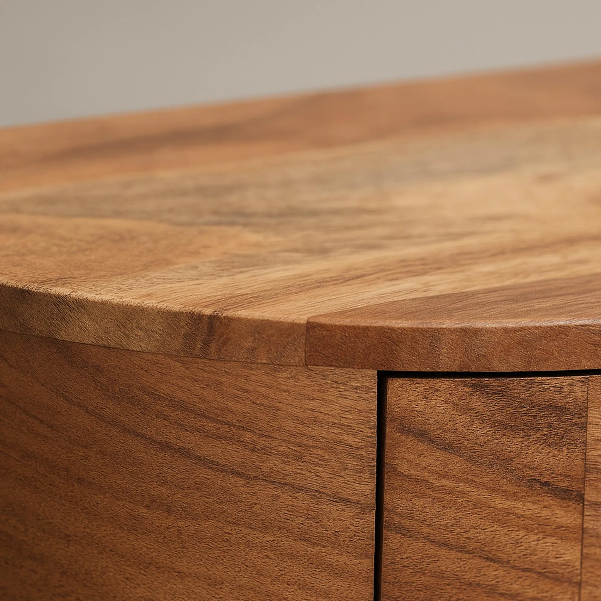Ambachtelijk vervaardigd, zet ons zwevende nachtkastje in massief acaciahout Curve een houtsoort in de kijker die gekozen werd om haar dichtheid, duurzaamheid en de rijkdom van haar nerftekening. Elk stuk onthult warme tinten en subtiele variaties die elk meubel uniek maken. Het oppervlak voelt zacht aan, de afwerking is verfijnd en de afgeronde randen versterken het visuele en tactiele comfort. We zijn bijzonder trots op dit werk rond de curven, dat vakmanschap en precisie vereist om het evenwicht tussen stevigheid en lichtheid te behouden.