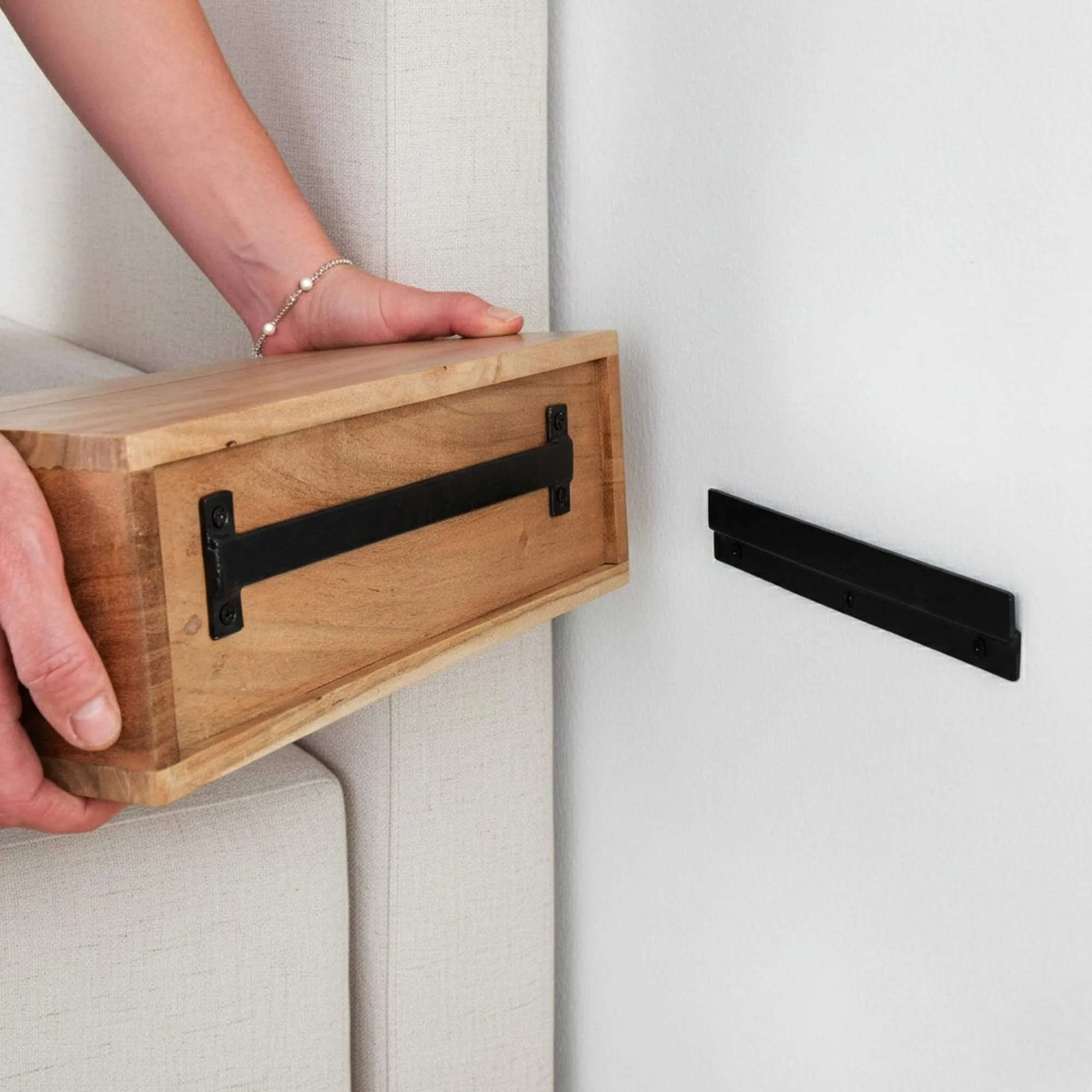 Het zwevende nachtkastje in massief acaciahout Curve wordt gemonteerd geleverd en kan eenvoudig aan de muur worden bevestigd dankzij een robuust ophangsysteem, ontworpen voor dagelijks gebruik. Eenmaal geïnstalleerd maakt het de vloer vrij en zorgt het voor een gevoel van lichtheid dat bijzonder gewaardeerd wordt in eigentijdse, natuurlijke of minimalistische slaapkamers.