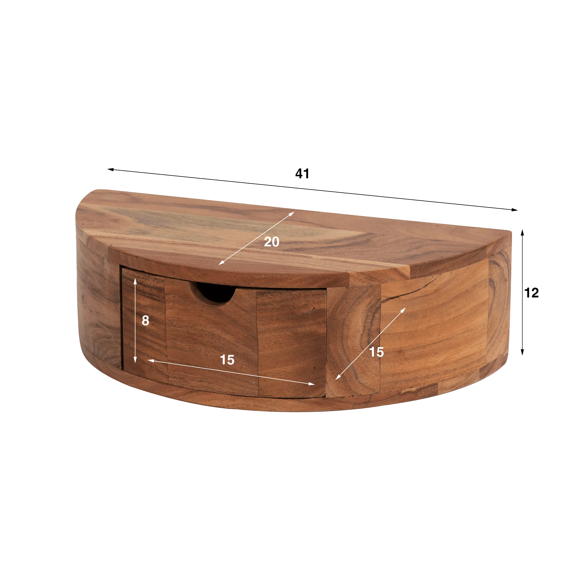 Met een breedte van ongeveer 41 cm, een diepte van circa 20 cm en een hoogte van 12 cm biedt het zwevende nachtkastje in massief acaciahout Curve een ideaal formaat om het bed te begeleiden zonder de slaapkamer te overladen. De geïntegreerde lade, met een interne breedte van ongeveer 15 cm en een nuttige hoogte van 8 cm, biedt plaats aan de dagelijkse essentials, terwijl het bovenblad ruimte laat voor een lamp, een boek of een decoratief object. De discrete opening van de lade, rechtstreeks in het hout gevormd, draagt bij aan de strakke esthetiek van het geheel.