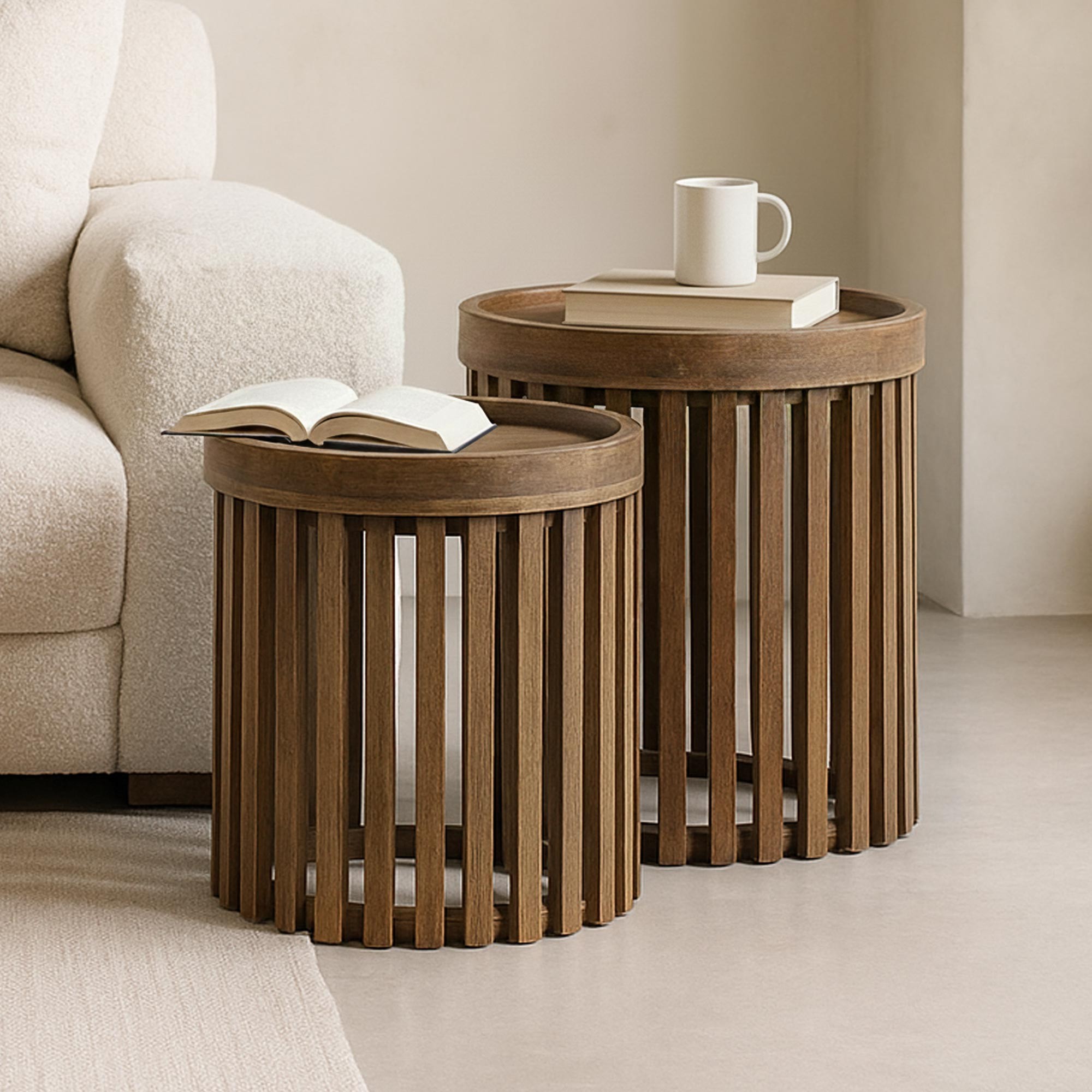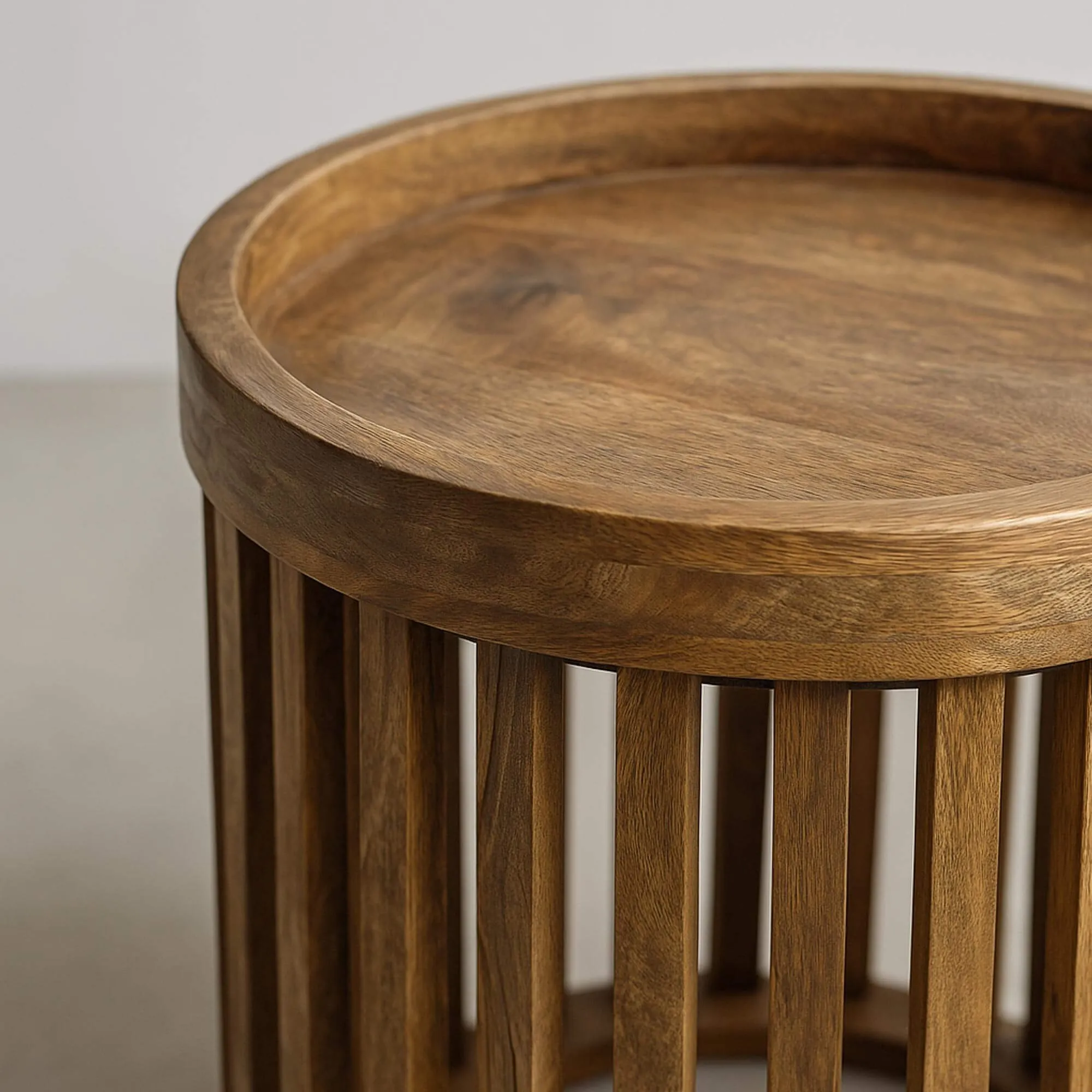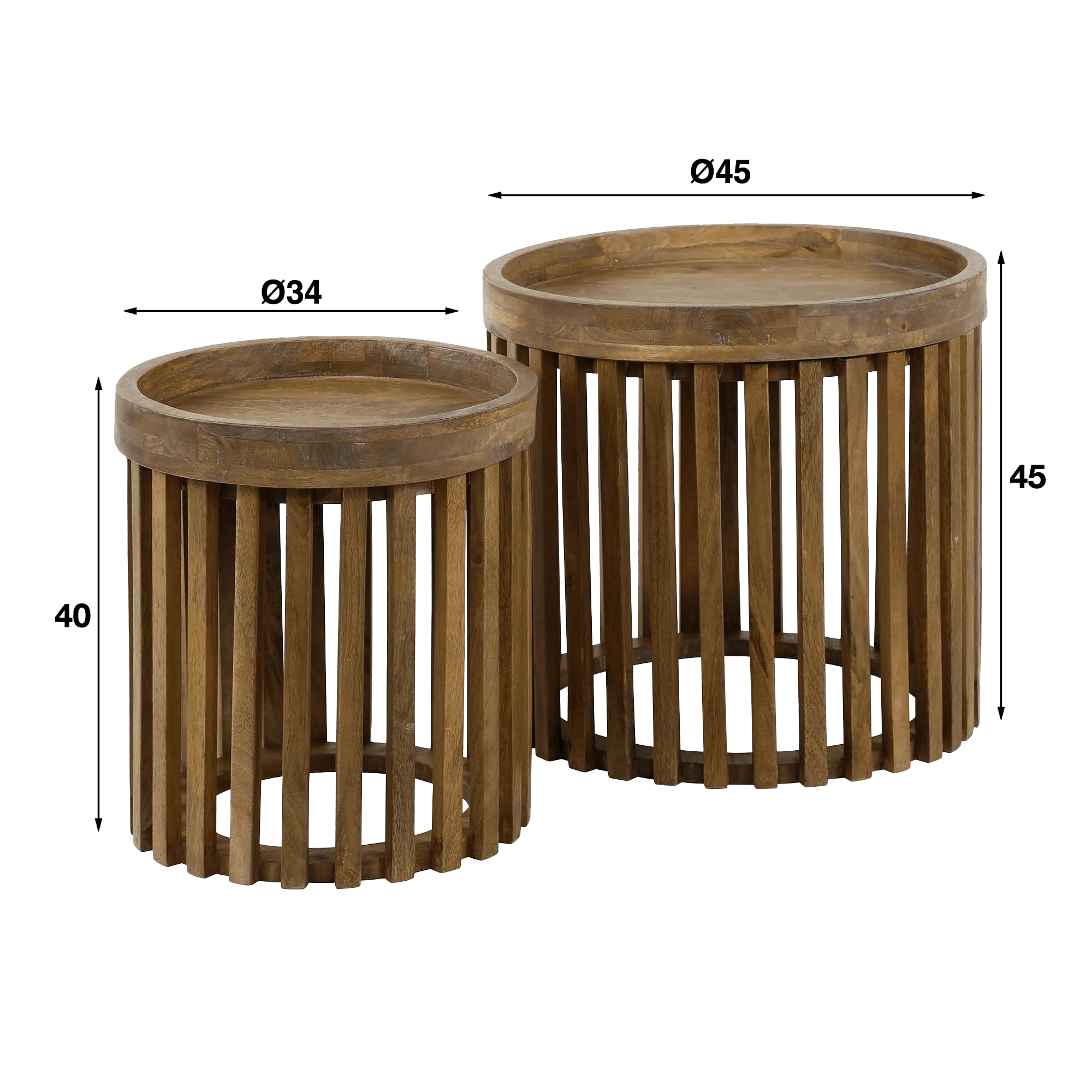 Het ontwerp van deze bijzettafel in massief mangohout in twee complementaire formaten biedt een grote gebruiksvrijheid. De lagere tafel, met een hoogte van 40 cm en een diameter van 34 cm, schuift moeiteloos naast een bank of fauteuil. De tweede, slankere tafel is ongeveer 45 cm hoog en heeft een blad met een diameter van 45 cm, ideaal voor een kopje, een boek of een decoratief object. De open structuur, opgebouwd uit verticale latten, zorgt voor een luchtige uitstraling en garandeert tegelijk een uitstekende stabiliteit.