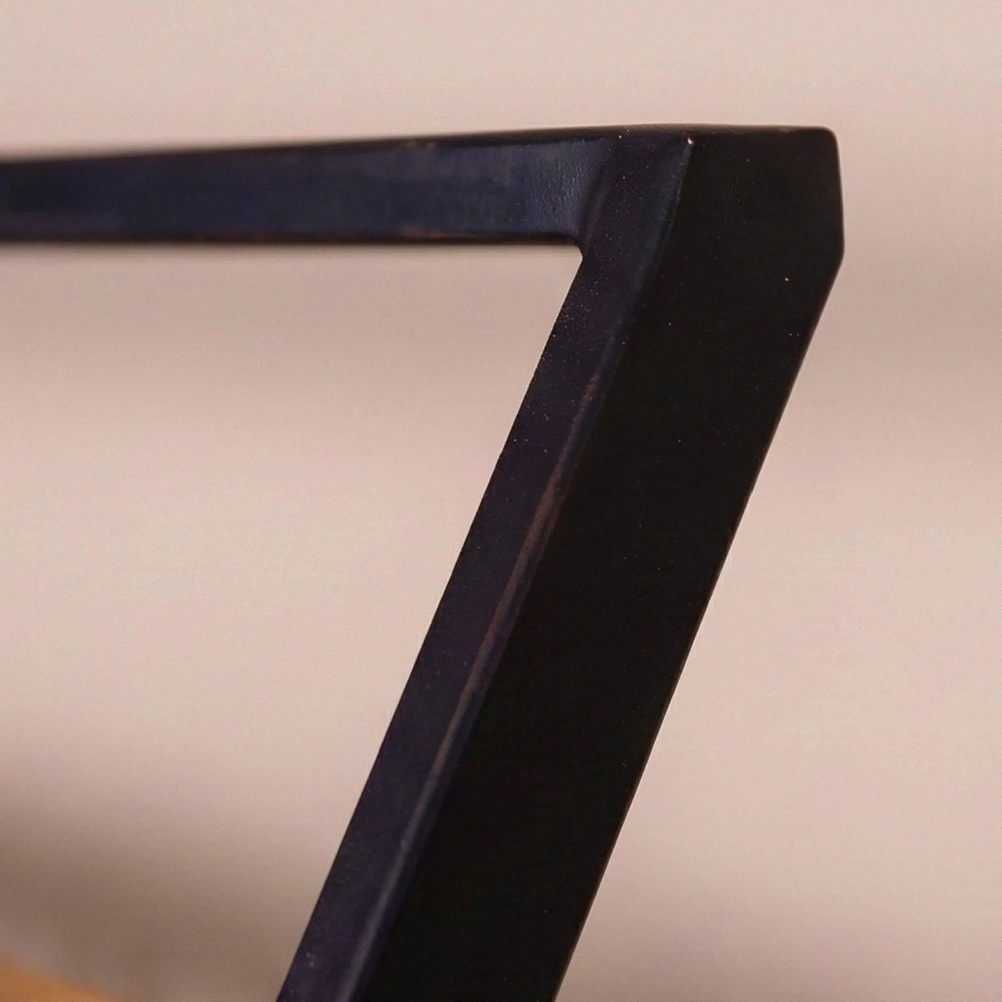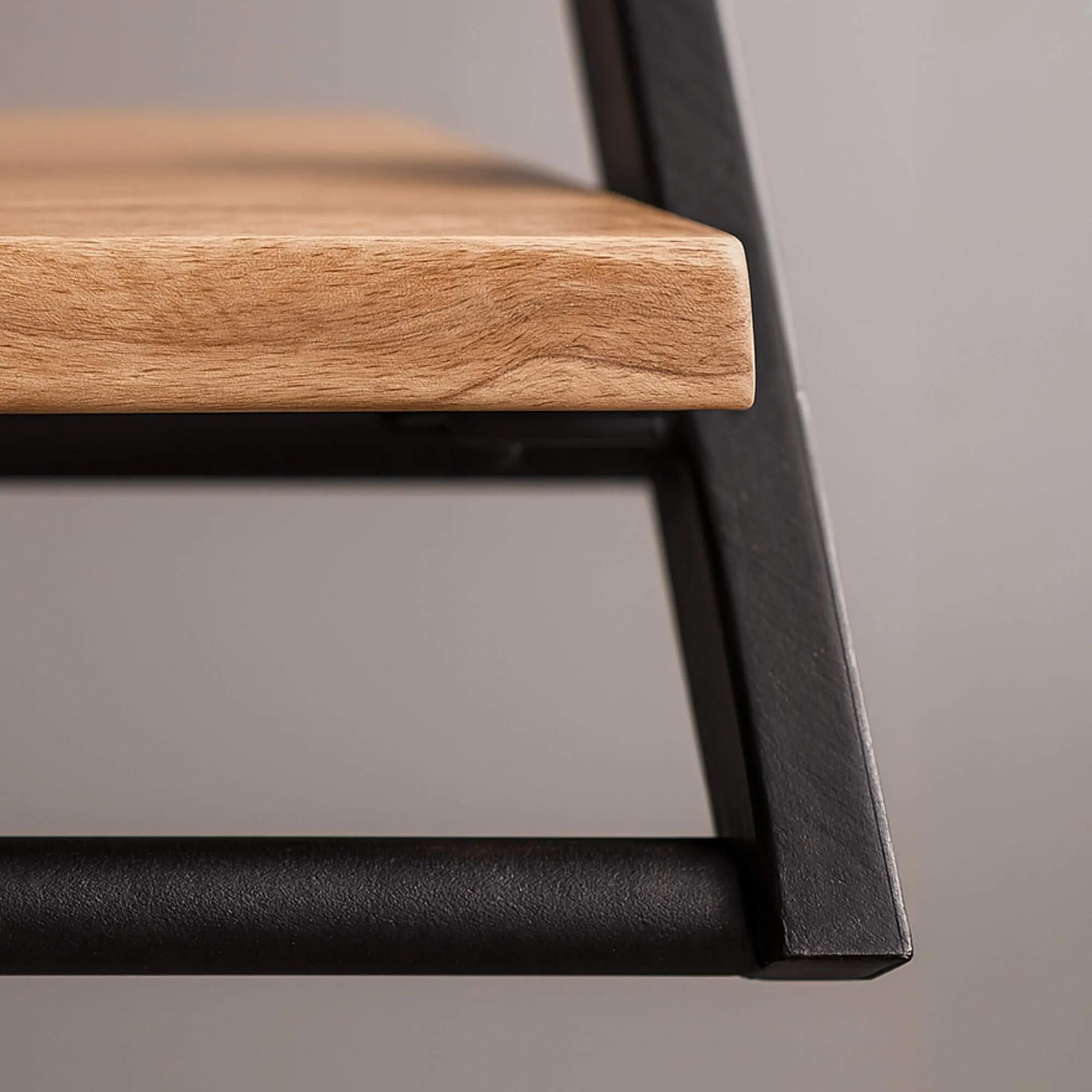 De zwart metalen structuur van deze wandkapstok in metaal met massief houten legplank vormt een schuin silhouet dat een uniek visueel ritme aan de muur toevoegt. Dit lijnenspel, geïnspireerd door zowel de industriële stijl als een meer bohemien esthetiek, geeft de Lean wandkapstok een lichte uitstraling ondanks zijn robuuste constructie. We hebben bewust gekozen voor fijne profielen en gecontroleerde hoeken, zodat de structuur lijkt te zweven en tegelijk een uitstekende stabiliteit biedt na installatie.