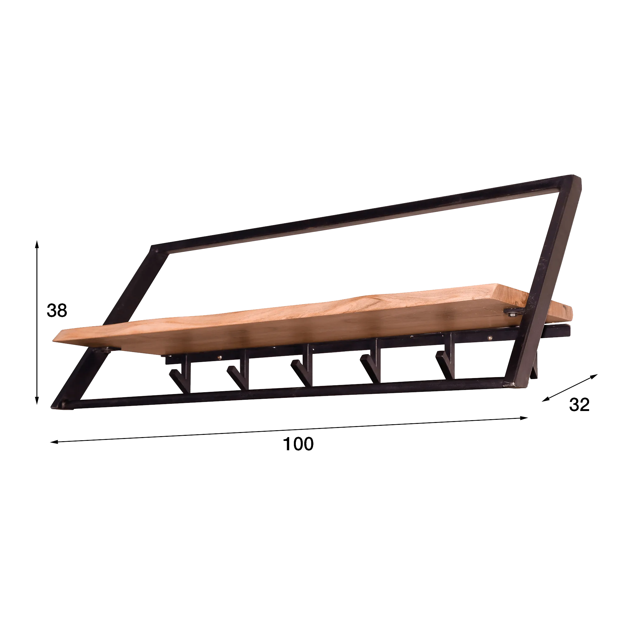 De bovenste legplank van deze metalen wandkapstok, uitgevoerd in massief acaciahout, onthult de volle rijkdom van het hout: contrasterende nerven, warme goudtinten en subtiel geaccentueerde natuurlijke oneffenheden. De aanraking is zacht en het oppervlak zorgvuldig afgewerkt, waardoor het levendige karakter van het materiaal zichtbaar blijft. Met een lengte van ongeveer 100 cm en een diepte van 32 cm biedt deze plank voldoende ruimte voor hoeden, tassen, dozen of decoratieve objecten, terwijl ze visueel perfect in balans blijft in een inkomhal of gang.