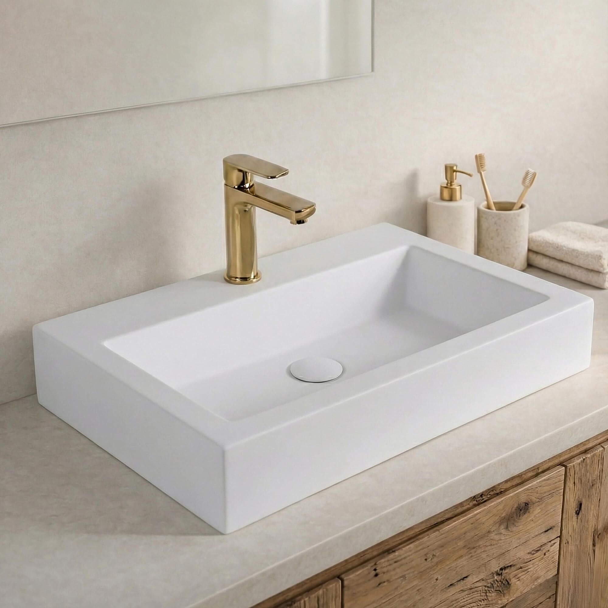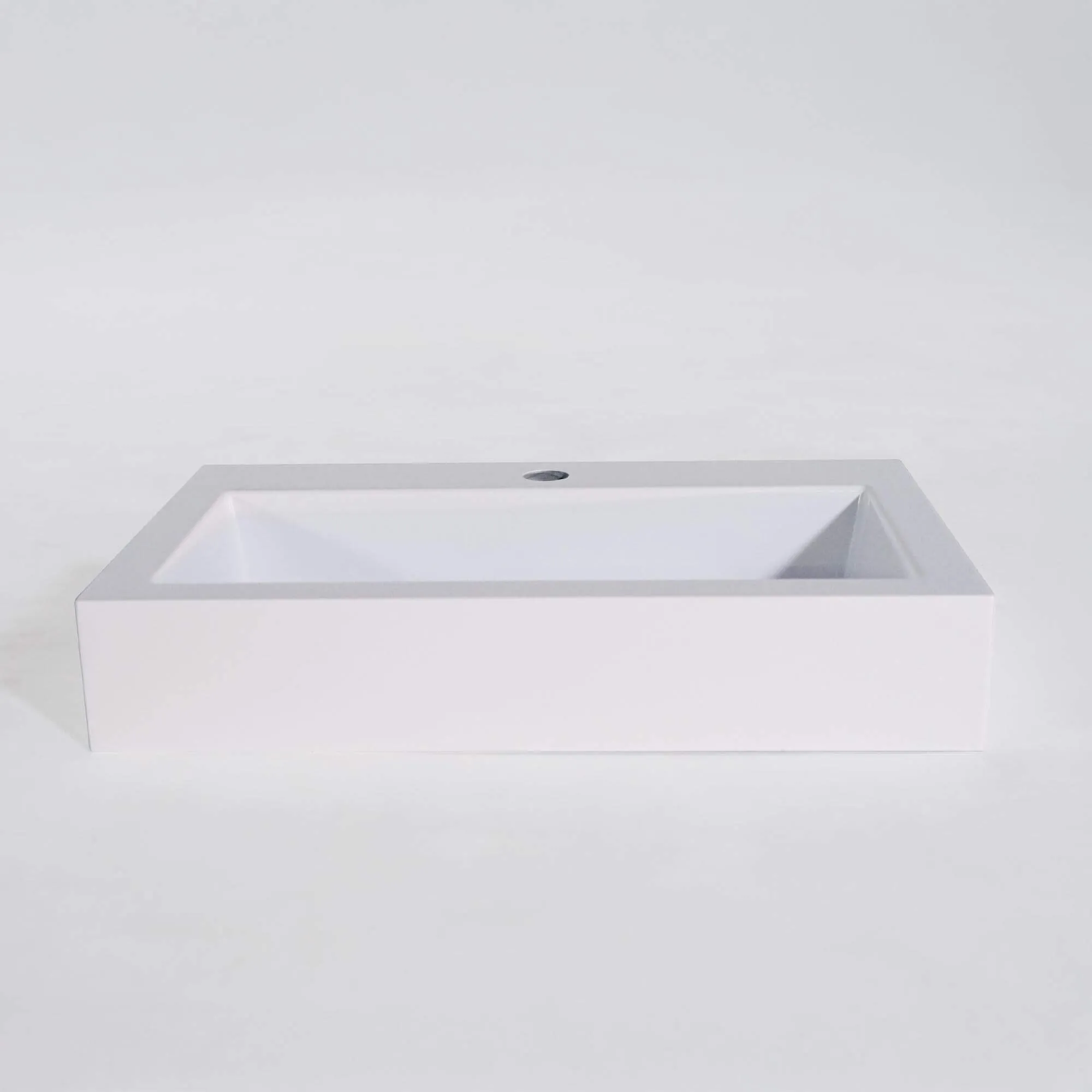 Vervaardigd uit mat wit keramiek, charmeert deze rechthoekige opbouw waskom door de zachte, rustige uitstraling van de afwerking. Het oppervlak vangt het licht zonder overmatige glans en creëert zo een sober en rustgevend geheel. Bij aanraking voelt het materiaal glad en compact aan, een weerspiegeling van zorgvuldig vakmanschap en een strenge kwaliteitscontrole. Elke hoek van deze rechthoekige opbouw waskom in mat wit keramiek werd ontworpen om een vloeiende overgang te garanderen tussen de buitenlijnen en het binnenbekken, voor optimaal dagelijks comfort.