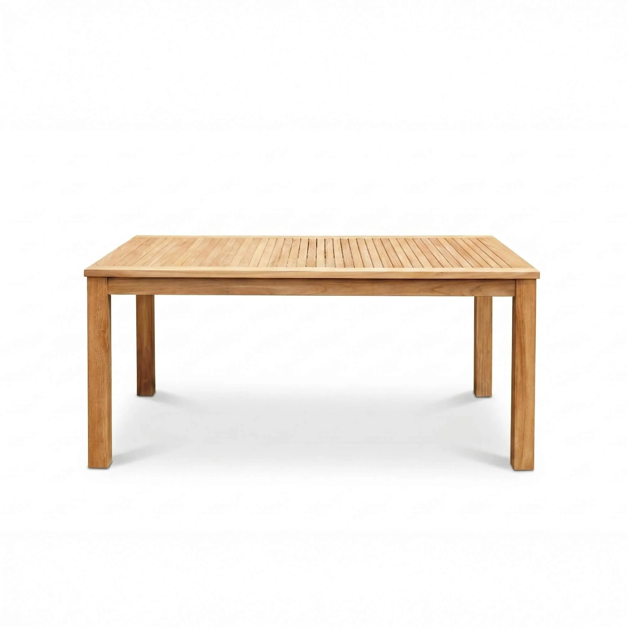 Het blad van deze houten tuintafel in teak voor 4 personen, samengesteld uit fijne, zorgvuldig uitgelijnde latten, brengt een subtiel ritme dat het geheel reliëf en visuele lichtheid geeft. Deze nauwkeurige afwerking zorgt er ook voor dat water op natuurlijke wijze kan weglopen, een detail dat bijdraagt aan de duurzaamheid van het meubel doorheen de seizoenen. Dankzij de evenwichtige verhoudingen kunnen vier gasten er comfortabel aan plaatsnemen, waardoor een gezellige plek ontstaat zonder de inrichting van het terras of de tuin te verzwaren.