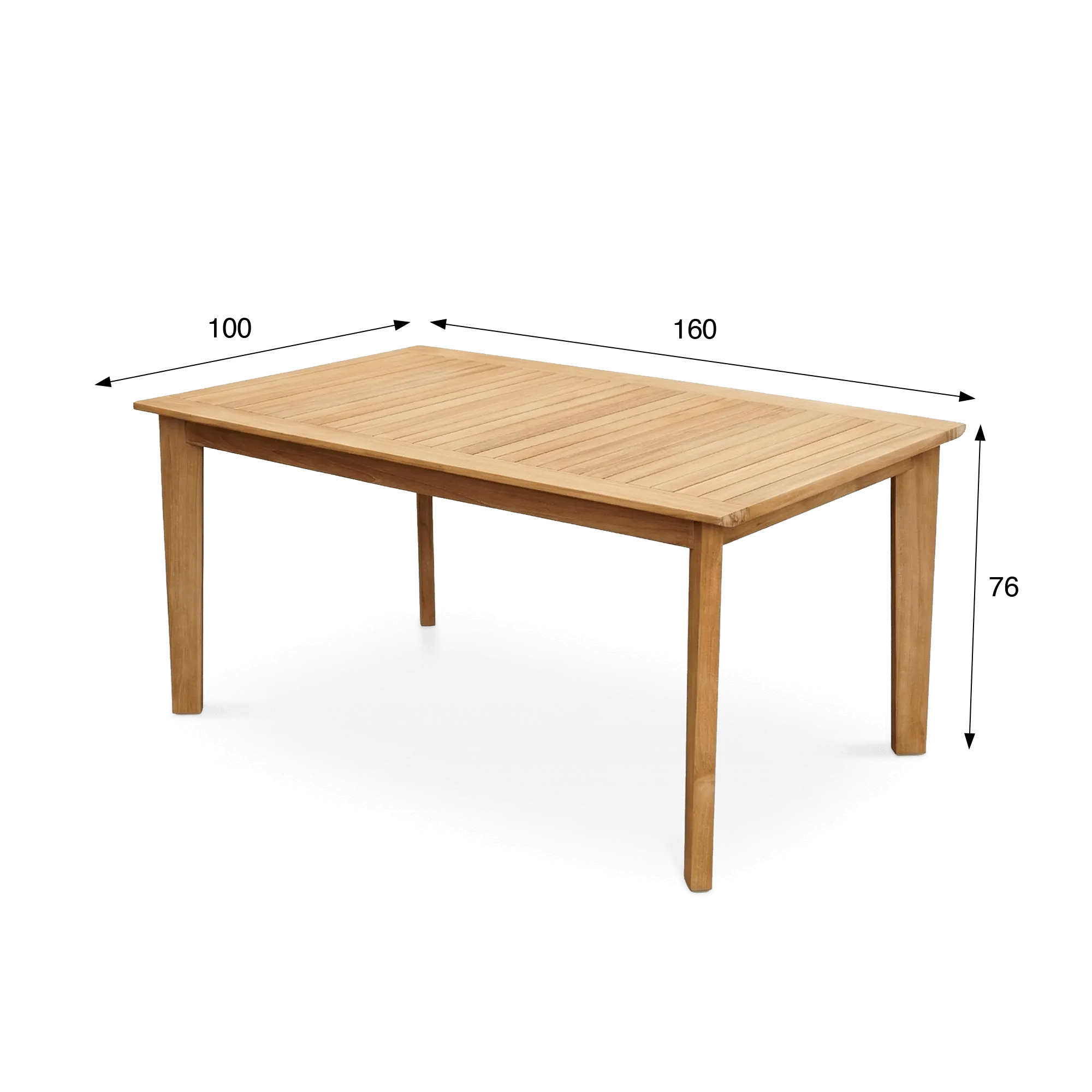 Het tafelblad met fijn verdeelde latten benadrukt de natuurlijke nuances van het teak, waarvan de verfijnde nerf het licht subtiel opvangt. Deze ontwerpkeuze is niet alleen esthetisch: ze zorgt ook voor een natuurlijke afvoer van water, zodat u seizoen na seizoen zorgeloos van deze tafel kunt genieten. De doordachte proporties van de houten tuintafel in teak Nobu bieden een comfortabele ruimte voor vier personen en creëren een gezellige setting zonder het zicht op het terras of in de tuin te verzwaren. Dankzij haar evenwichtige afmetingen past de houten tuintafel in teak voor 4 personen Nobu moeiteloos in uiteenlopende omgevingen, of het nu gaat om een hedendaagse patio, een ruim balkon of een groene tuin.
