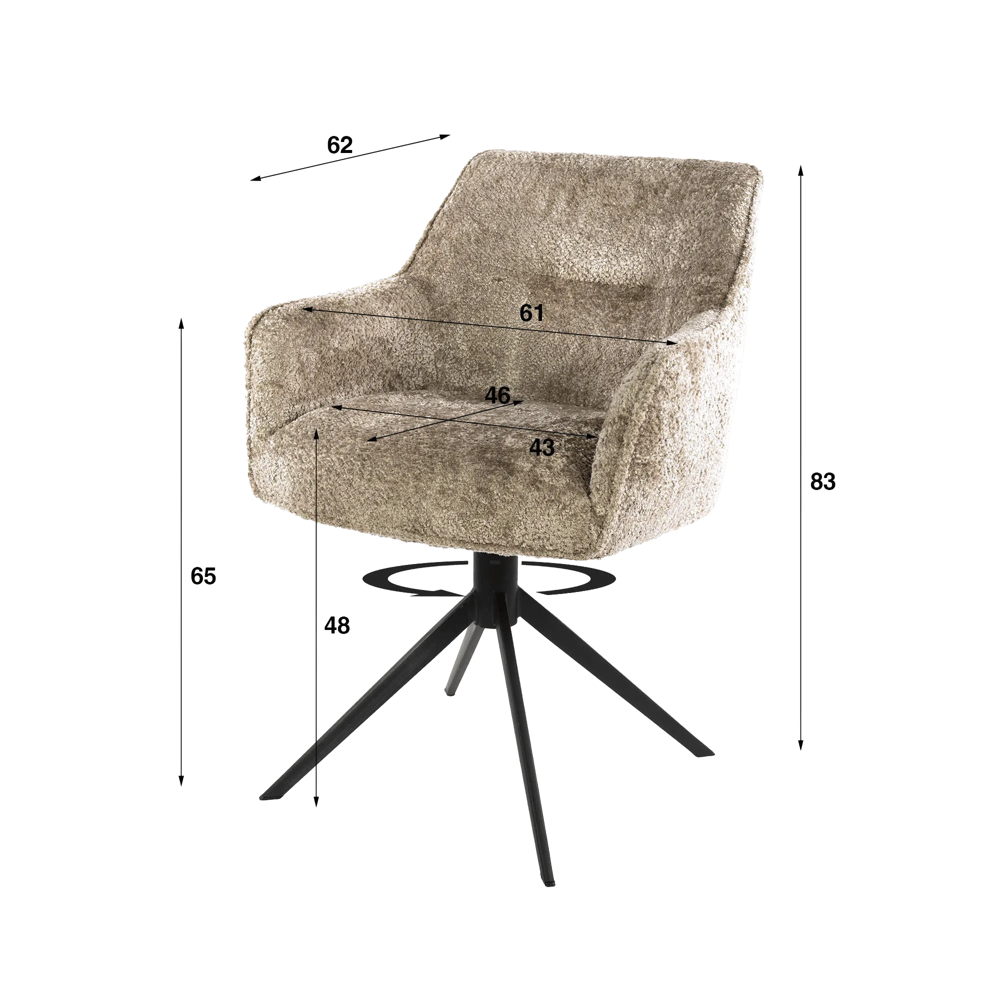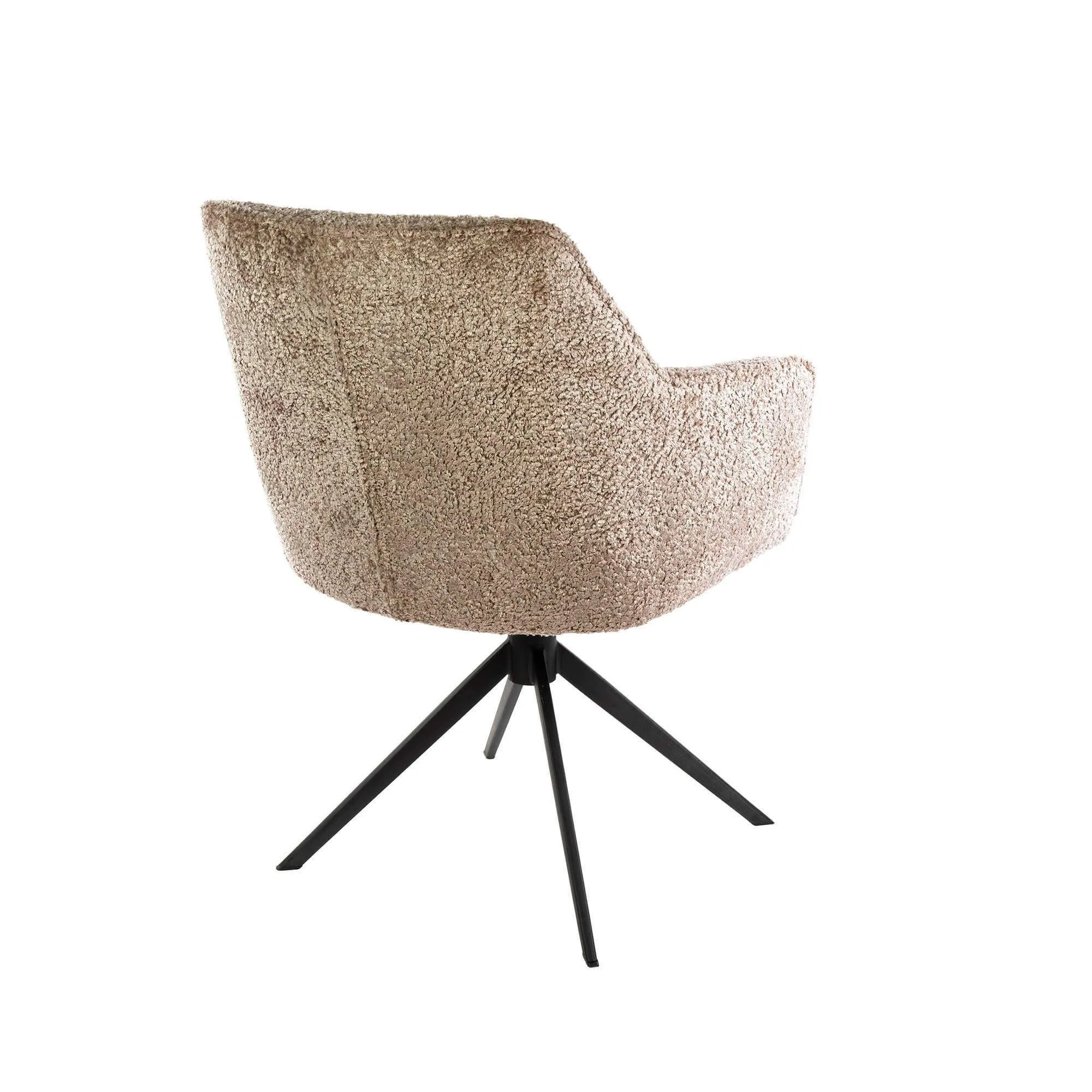 De royale kuipvorm van deze draaibare eetkamerfauteuil, bekleed met een met de hand zacht aanvoelende en slijtvaste, gestructureerde stof, nodigt vanzelf uit om plaats te nemen. De licht hellende rugleuning en de geïntegreerde armleuningen bieden aangename ondersteuning, ideaal om langer te tafelen of nog even na te praten. De zitting, ontworpen voor dagelijks gebruik, heeft een diepte van ongeveer 46 cm en een comfortabele breedte van ongeveer 61 cm, waardoor je ontspannen zit met een mooie, stevige houding. De zithoogte van rond de 48 cm past vlot bij standaard eettafels.