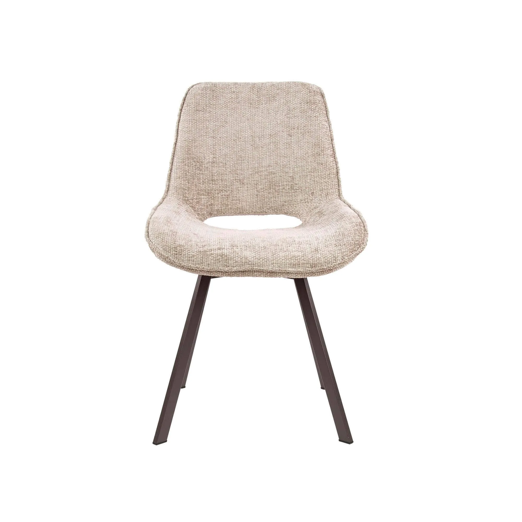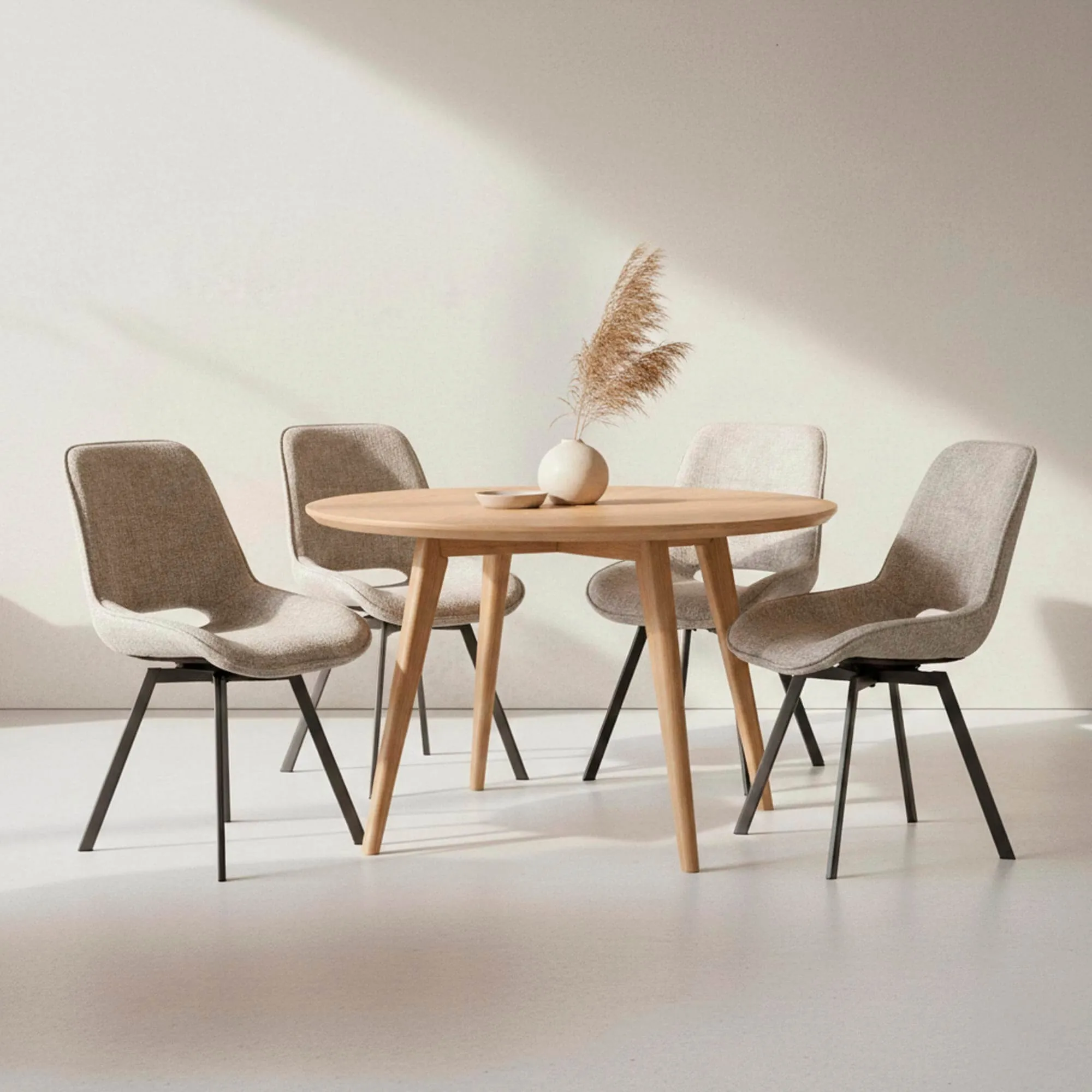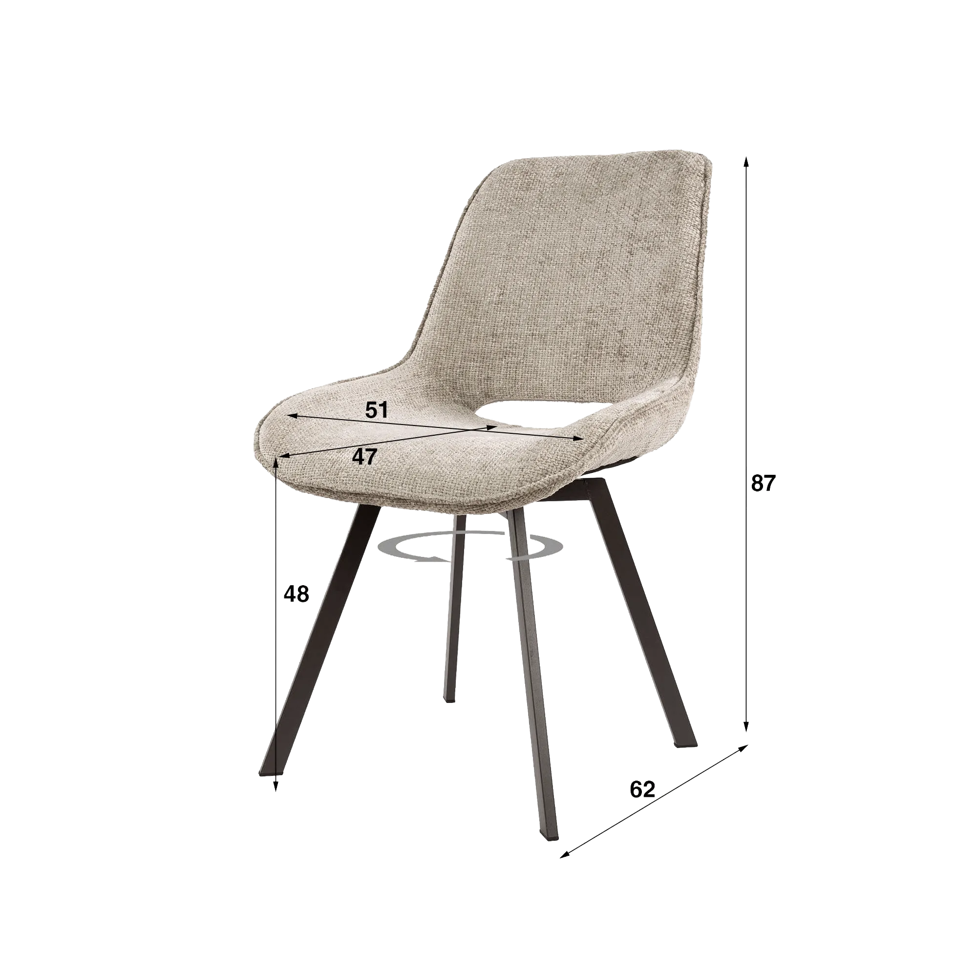 De textielbekleding die we voor deze design draaifauteuil voor de eetkamer selecteerden, onderscheidt zich door haar gestructureerde touch en haar weerstand tegen dagelijks gebruik. We kozen bewust voor een warme, genuanceerde tint die moeiteloos samengaat met tafelbladen in hout, keramiek of steen, en tegelijk zacht aanwezig blijft in de ruimte. De interne structuur en de draaibare basis zorgen voor een soepele en stabiele rotatie, wat de ergonomie van de fauteuil versterkt. Een totale hoogte van ongeveer 87 cm en een zithoogte rond 48 cm zorgen voor een natuurlijke compatibiliteit met de meeste hedendaagse eettafels voor de eetkamer.