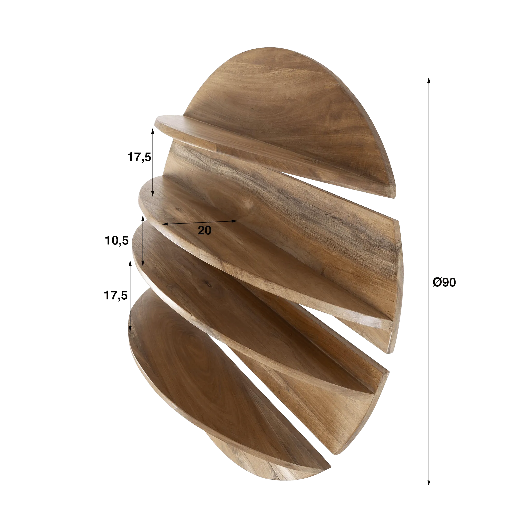 De binnenindeling van deze ronde wandplank in massief hout is ontworpen voor een écht dagelijks gebruik. De afstand tussen de plateaus varieert subtiel, met ongeveer 17,5 cm tussen de hoofdniveaus en een tussenniveau van ongeveer 10,5 cm, zodat je zowel decoratie, boeken als hangplanten een plek kunt geven. De bruikbare diepte van ongeveer 20 cm biedt comfortabel plaatsingsvlak zonder de muur visueel te verzwaren.