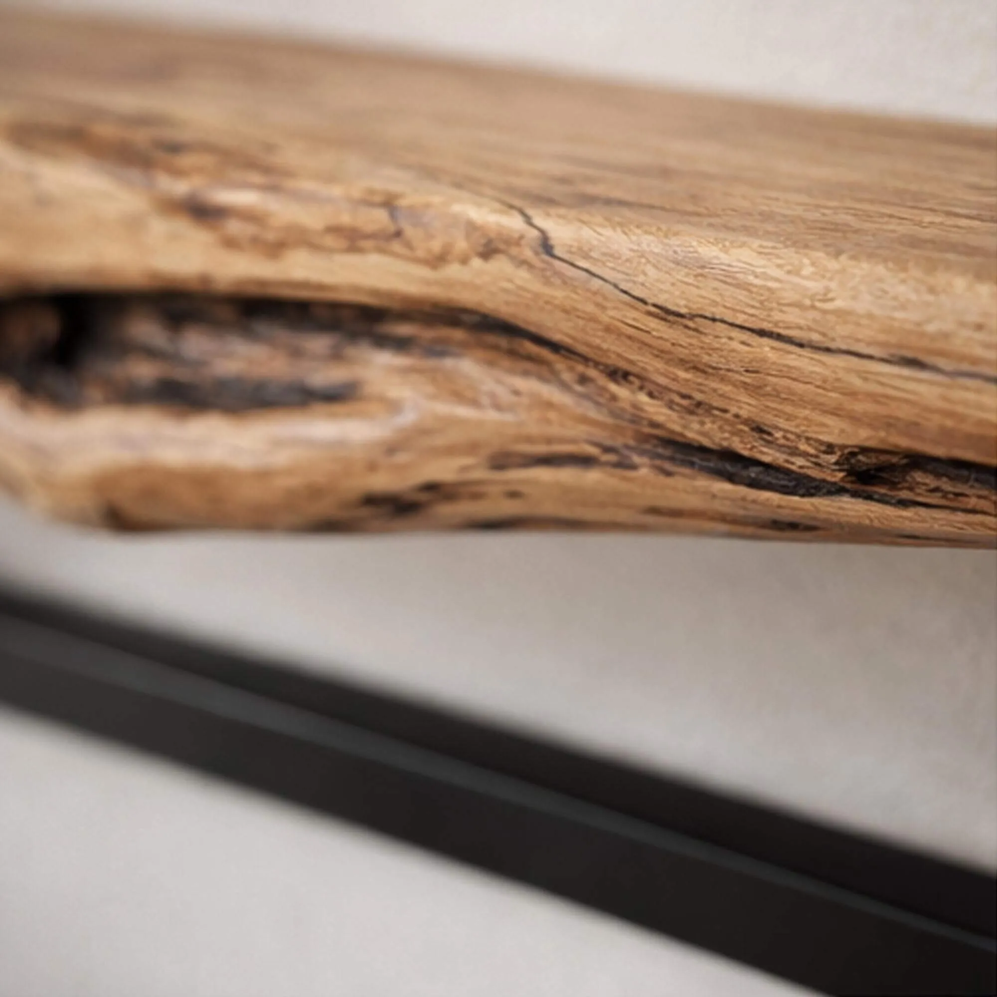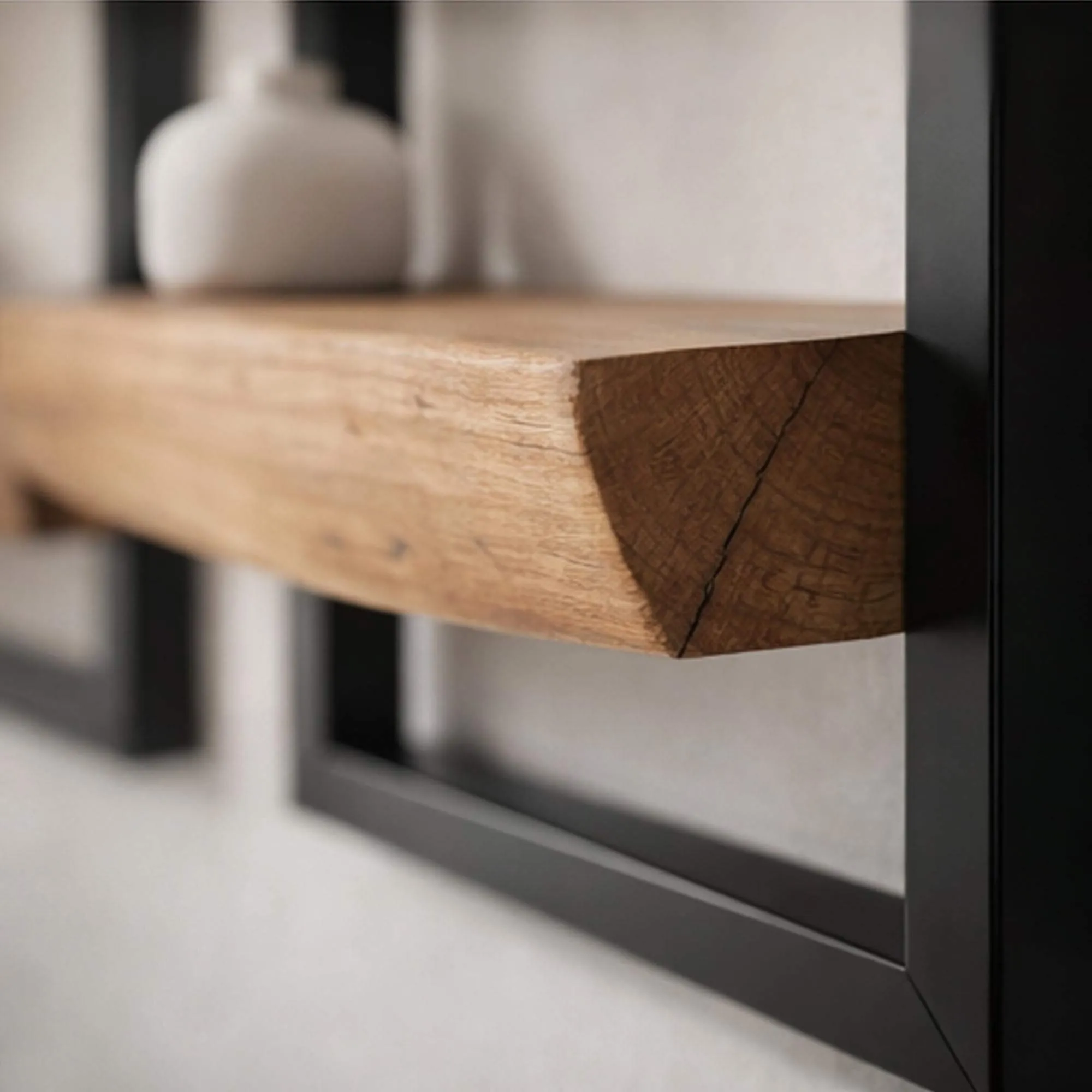 Met de industriële wandplank in hout en metaal Frame zochten onze designers het evenwicht tussen grafische structuur en levendig materiaal. We zijn bijzonder trots op de dialoog tussen de strakke lijnen van het metaal en de spontane uitstraling van het hout, waardoor elke wandcompositie persoonlijk wordt, zonder ooit geforceerd of stijf te ogen.