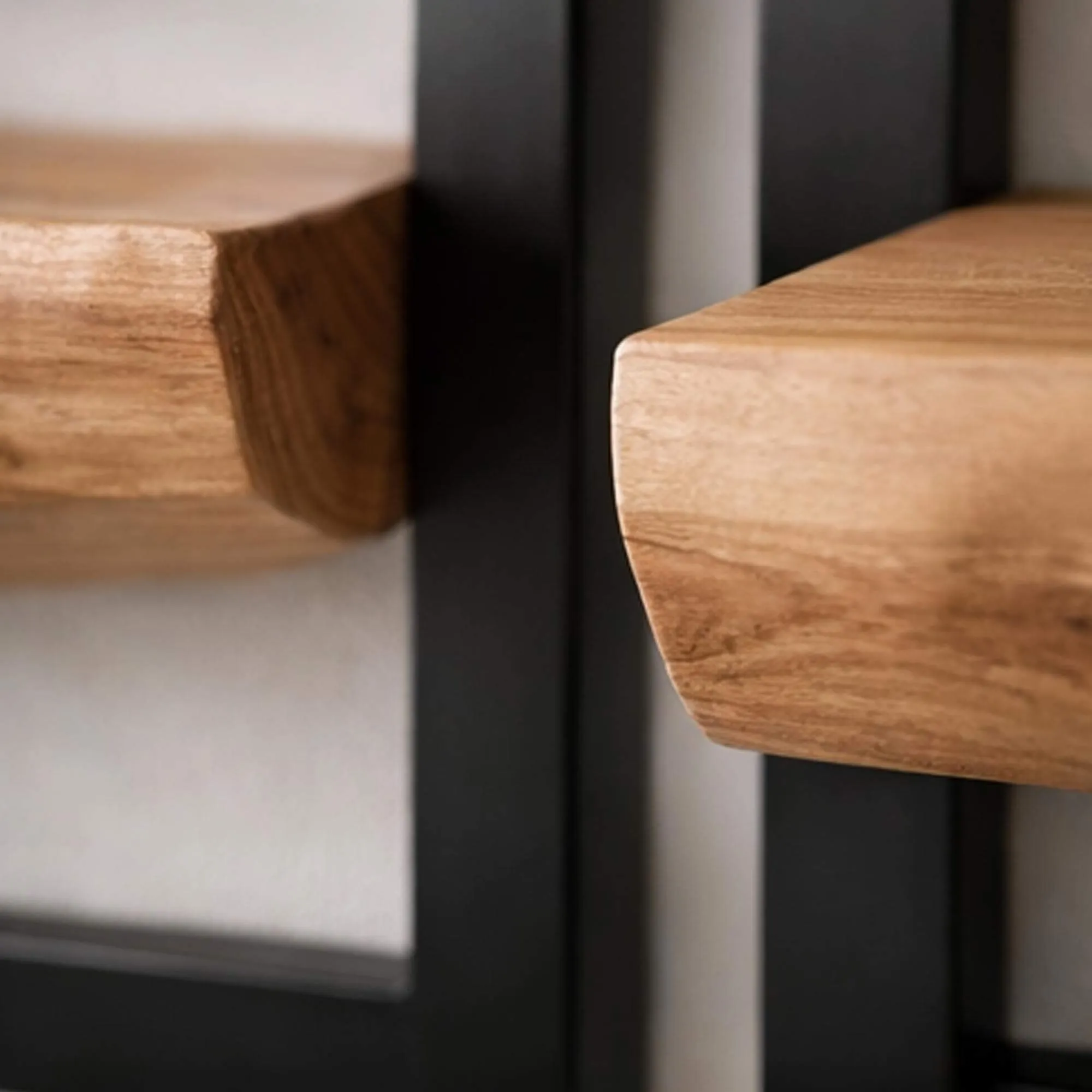 Ontworpen om muren meer reliëf en ritme te geven, vertaalt de industriële wandplank in hout en metaal (set van 5) Frame onze wens om de kracht van zwart metaal te combineren met de levendige warmte van massief hout. We bedachten deze set als een modulaire wandcompositie die een ruimte aankleedt en toch visueel licht blijft. Het contrast tussen de zwarte metalen frames en de acacia legplanken zorgt voor een uitgesproken, natuurlijke en hedendaagse uitstraling.