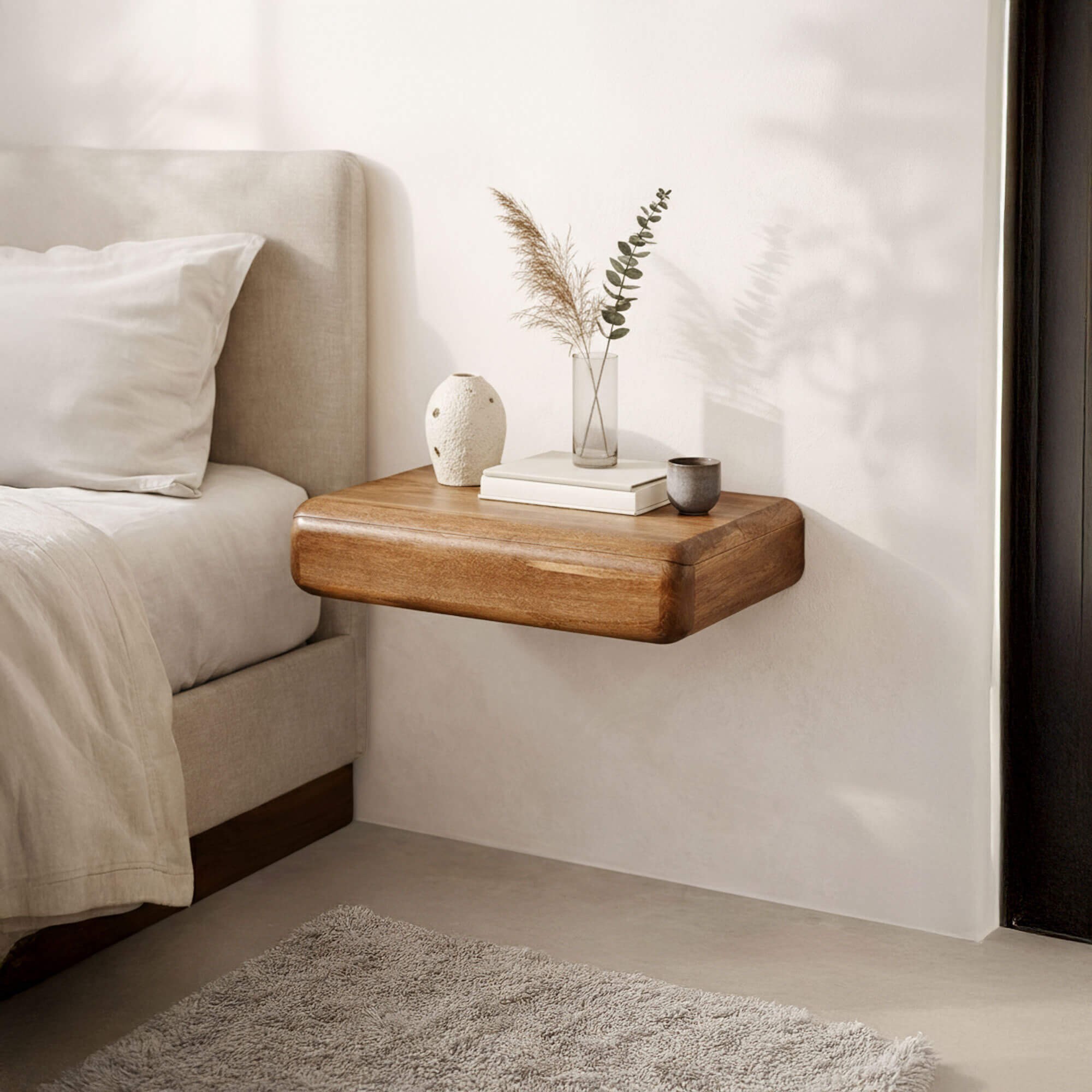 Geleverd volledig gemonteerd, maakt het hangend nachtkastje in massief hout met lade Elia de installatie eenvoudig en zorgt het voor een snelle plaatsing. We wilden een meubel dat makkelijk in het dagelijks leven past, en dat zich zowel laat integreren in een minimalistische slaapkamer als in een warmer interieur met natuurlijke textielen, rotan of linnen.