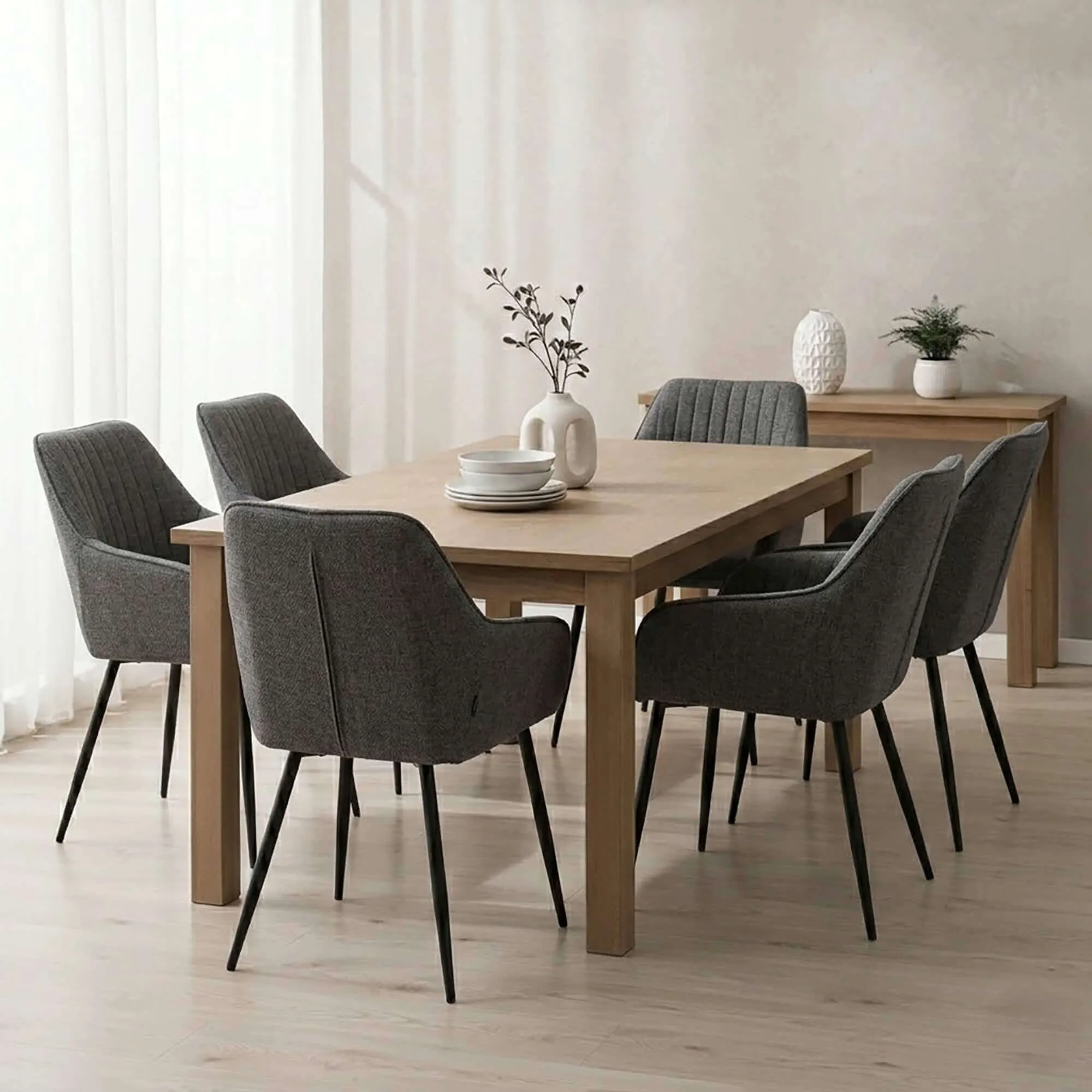 Voor het ontwerp van de eetkamerstoel Nolan Stripe in antracietkleurige stof wilden we royaal comfort en een verfijnde uitstraling met elkaar verzoenen, met een zitting die dagelijkse momenten op een natuurlijke manier begeleidt. De bekleding in antracietkleurige stof toont een subtiel gestructureerde textuur die aangenaam aanvoelt, terwijl de verticale sierstiksels de rugleuning op een discrete manier ritmeren. Dit lijnenspel geeft reliëf aan het geheel en onderstreept tegelijk de Scandinavische inspiratie van het model, gekenmerkt door een zuivere en warme uitstraling.
