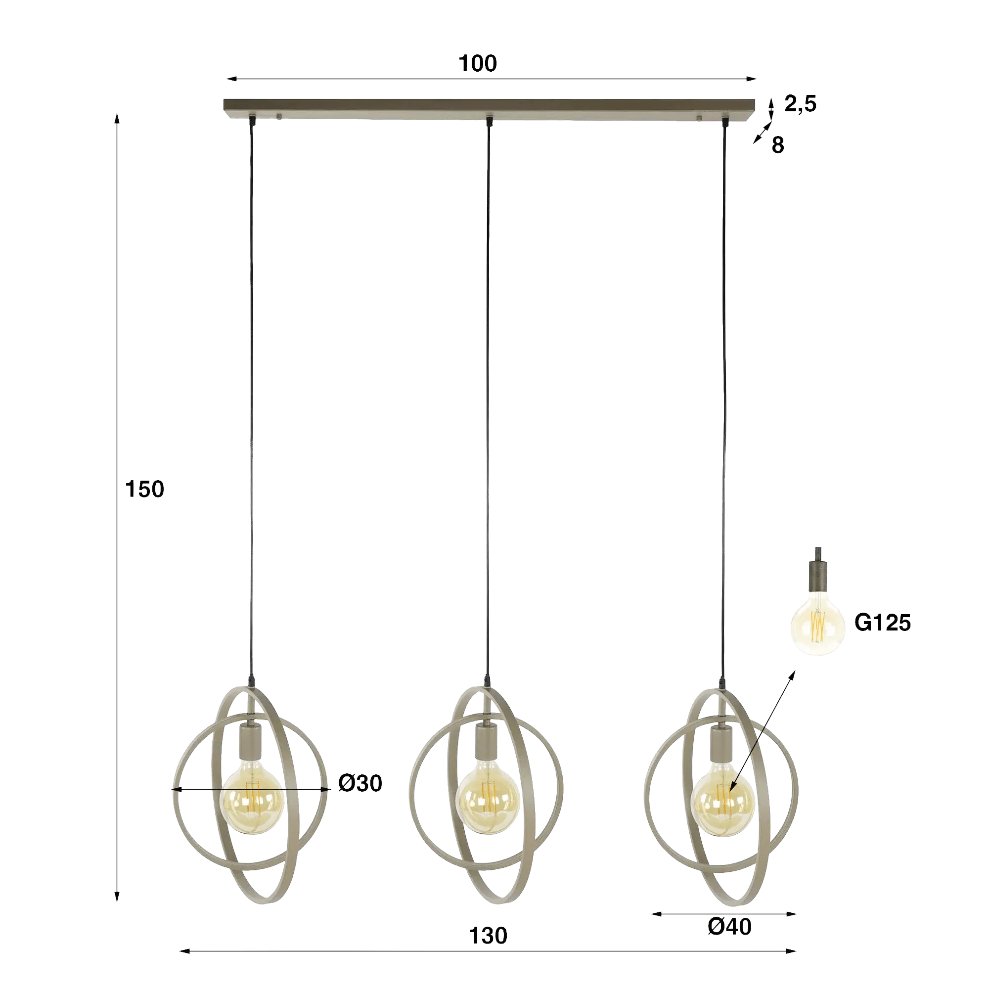 De horizontale structuur van 130 cm zorgt voor een evenwichtige aanwezigheid boven een eettafel, terwijl de verstelbare hoogte tot 150 cm het mogelijk maakt om de installatie aan de ruimte aan te passen. Elke ronde module van deze industriële hanglamp in metaal, met een diameter van ongeveer 40 cm, omringt op subtiele wijze een G125-lamp (niet inbegrepen), waardoor de zuiverheid van het licht en de finesse van het metalen ontwerp extra tot hun recht komen. Het contrast tussen de mat lijnen en de warmte van de verlichting creëert een uitnodigende sfeer, ideaal voor gedeelde momenten rond een maaltijd.