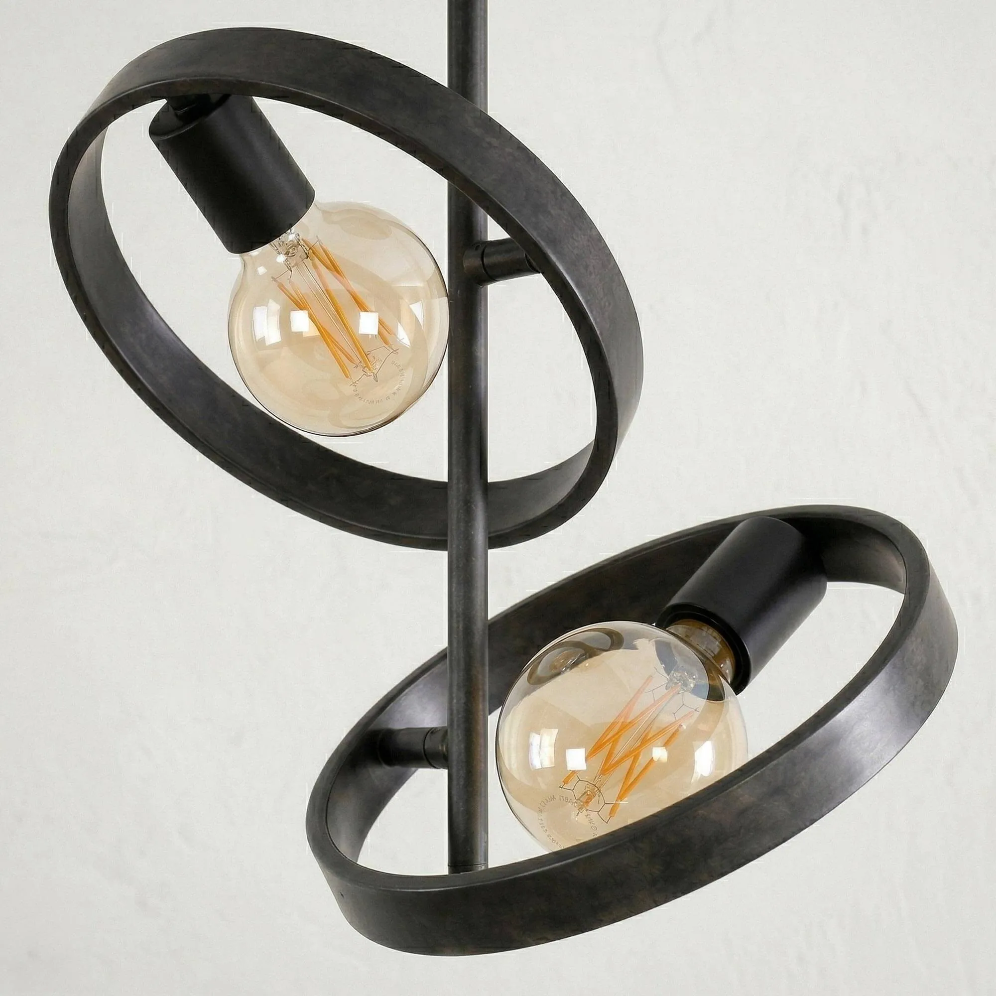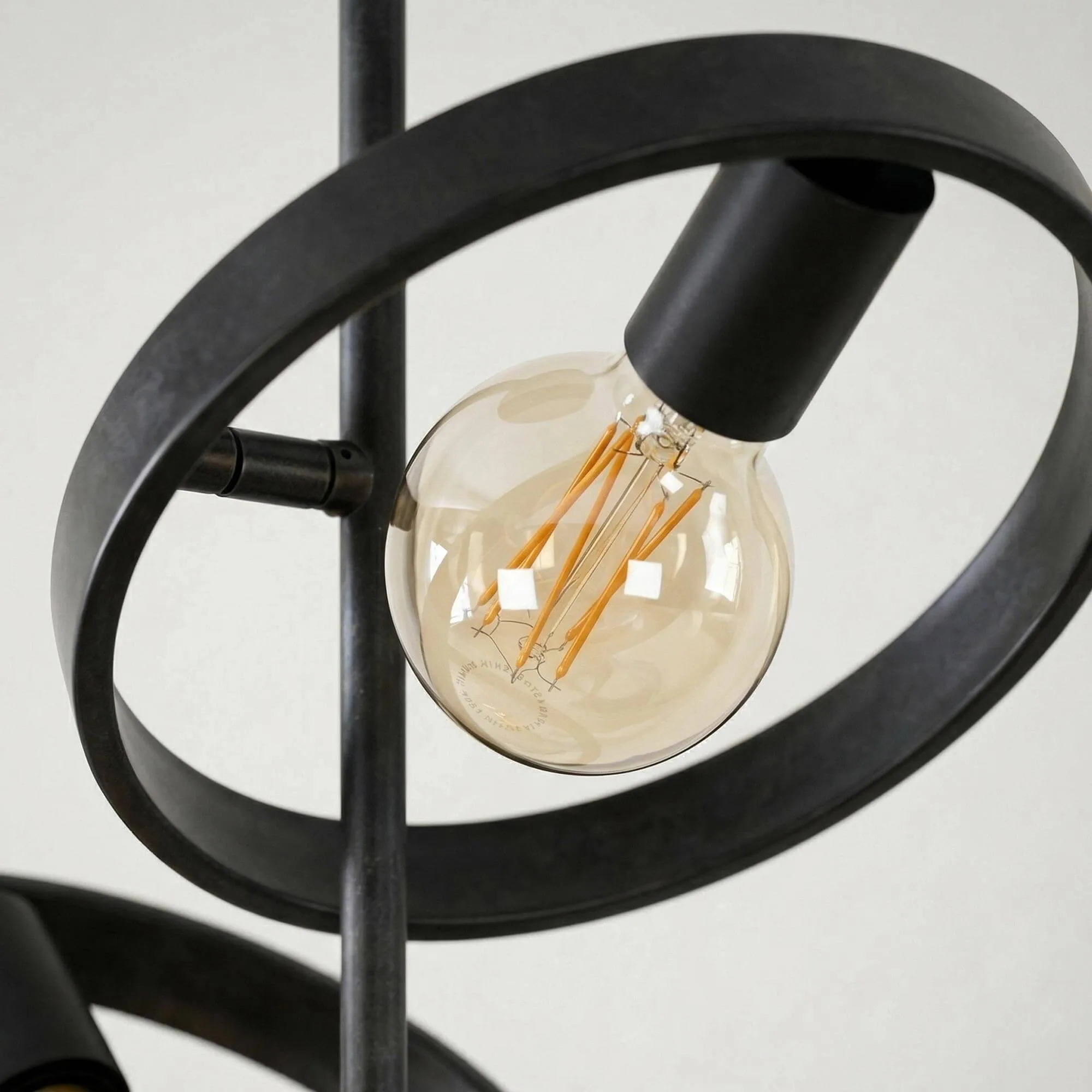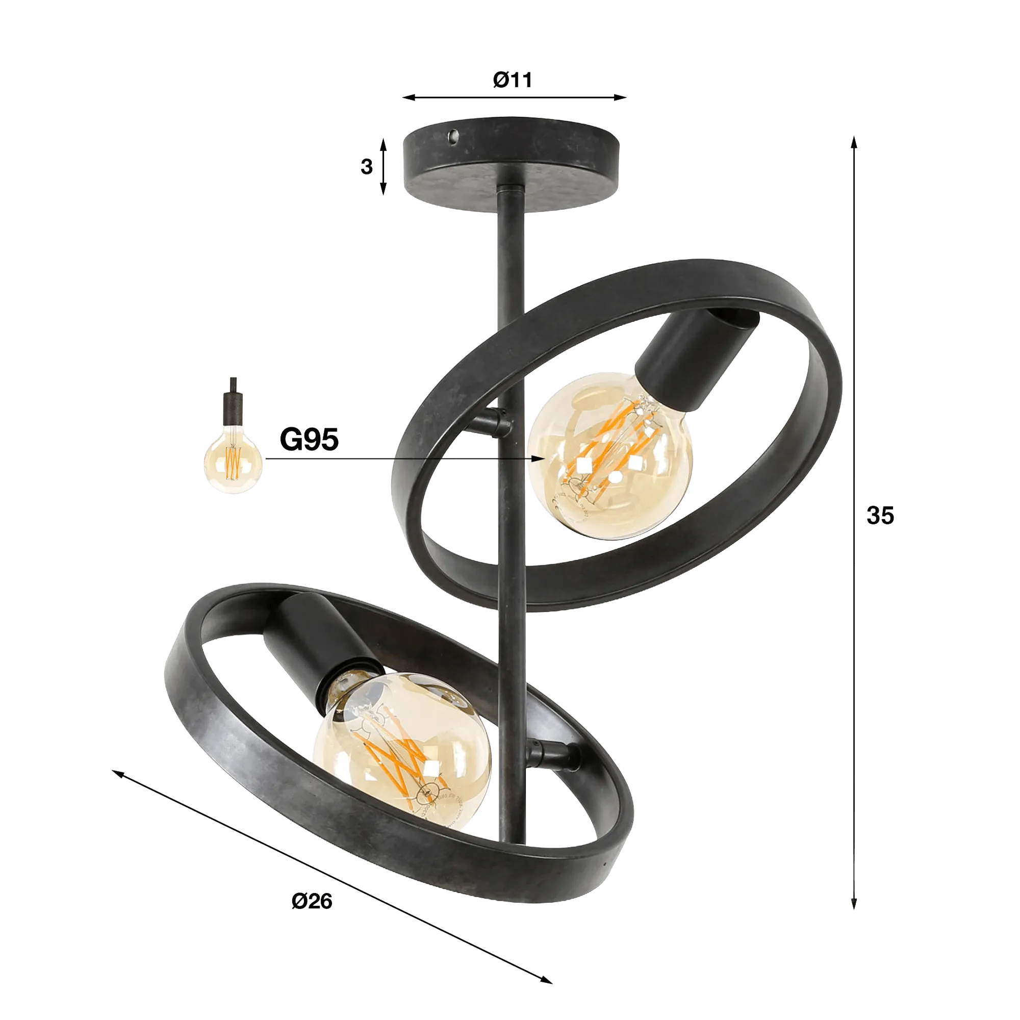 Het zwarte metaal onthult een licht gepatineerde afwerking die de authenticiteit van het materiaal benadrukt en de ronde lijnen van deze industriële plafondlamp van zwart metaal mooi laat uitkomen. Met een hoogte van ongeveer 35 cm en een diameter van 26 cm voor de hoofdkring vindt deze plafondlamp vanzelf haar plaats in uiteenlopende interieurs, of het nu gaat om een eigentijdse woonkamer, een strakke inkomhal of een slaapkamer met een zachte sfeer. De G95-lichtbronnen (niet inbegrepen), zichtbaar in het hart van de beweegbare ringen, verspreiden een warm licht dat het reliëf van de vormen benadrukt en een subtiel schaduwspel op de omliggende oppervlakken creëert.