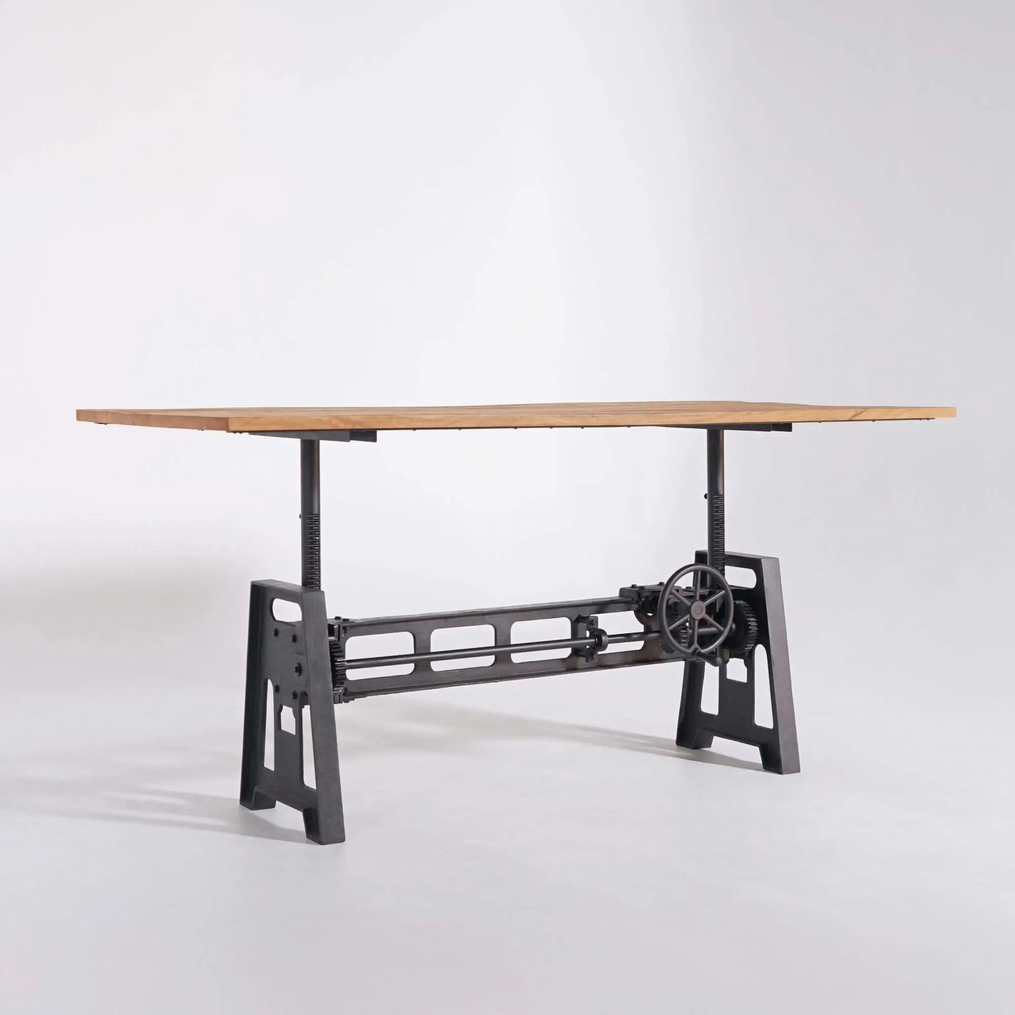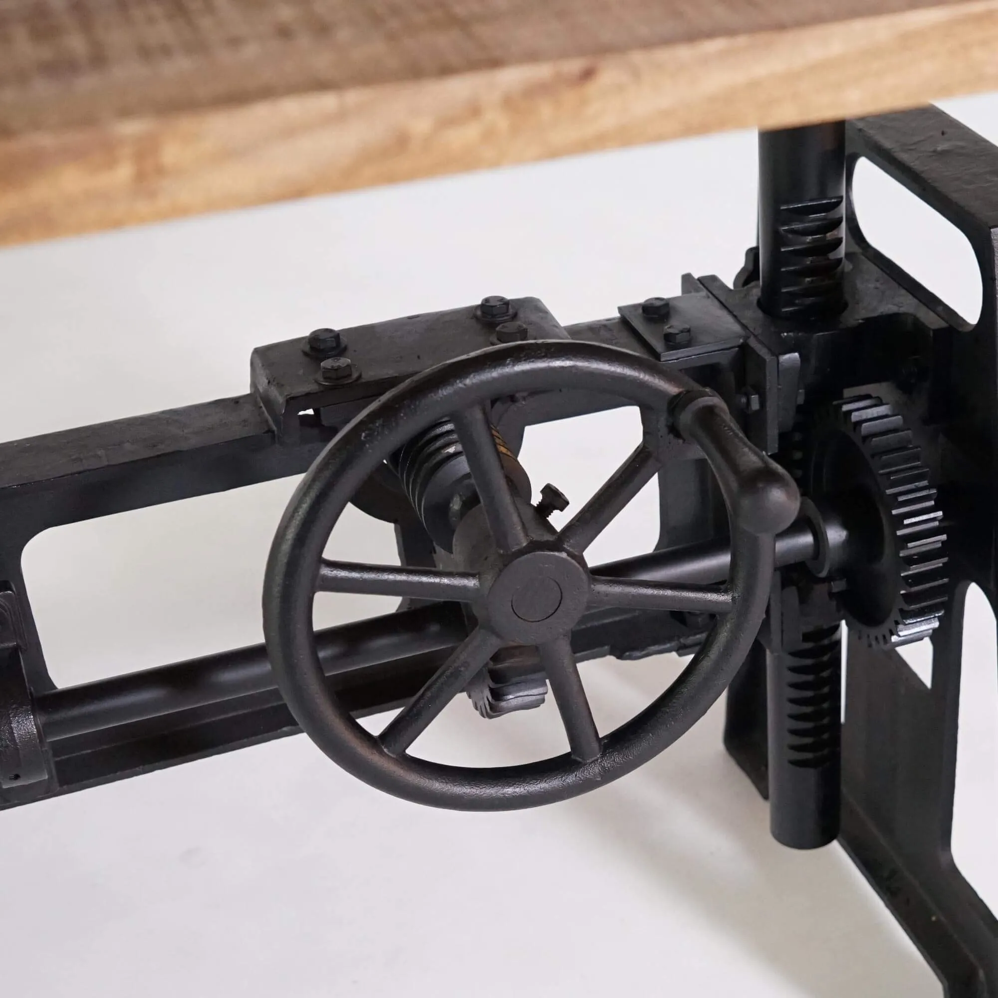 De zwengel drijft een schroefdraad aan en maakt het mogelijk de hoogte van de tafel in te stellen van 75 cm tot meer dan 100 cm. De poot is volledig van gietijzer. Sommige onderdelen zijn afkomstig van industriële recycling, andere zijn voor uw plezier met de hand gegoten en gevormd. De zwarte metalen structuur is ruw en geeft de tafel een vintage look.